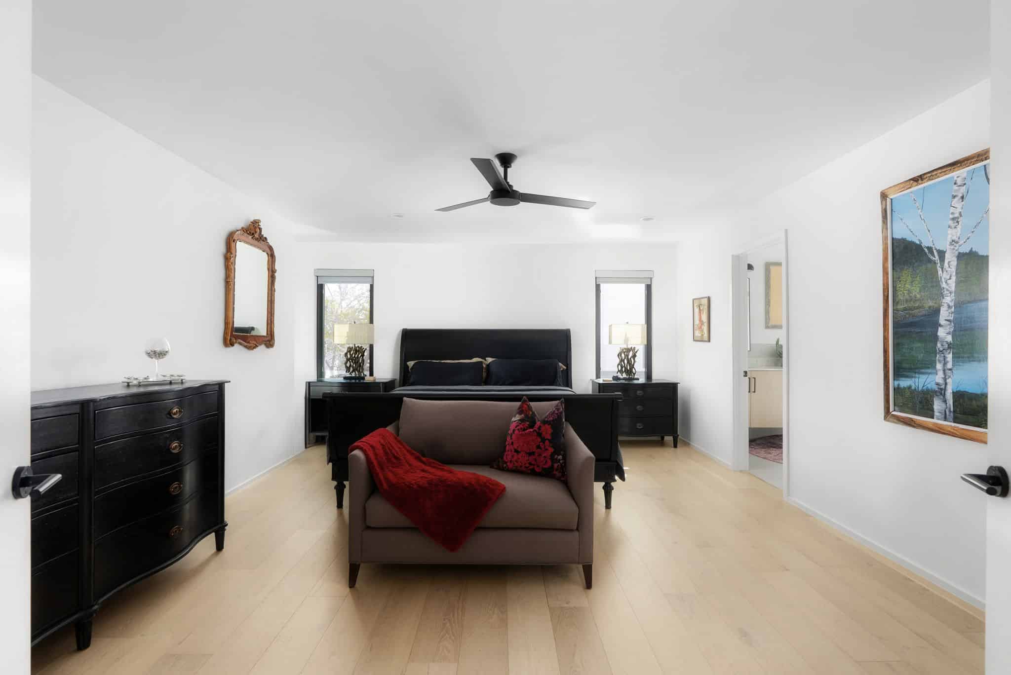 Upstairs, the primary suite offers a king bed, with two guest rooms featuring a queen and a full. A second living space provides a quiet retreat, complete with a leather sofa, large TV, and a full workspace equipped with multiple monitors.