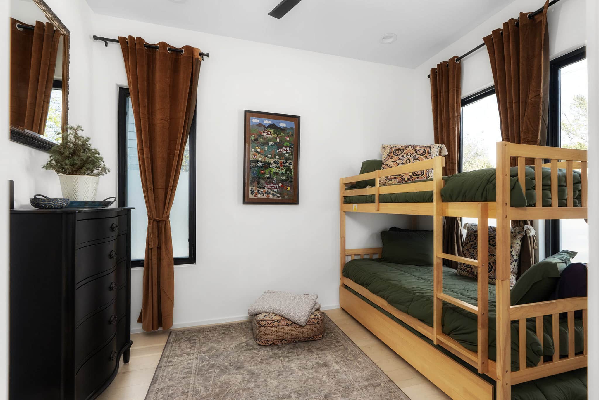 When you arrive at the Central Austin Oasis with Pool, you’re welcomed by a carefully styled entrance that sets the stage for your stay. On the first floor, the bunk room with three twin beds sits alongside a full bathroom, while the main living area brings everyone together. The kitchen opens seamlessly into a bright lounge, and from there sliding doors lead straight to the backyard.