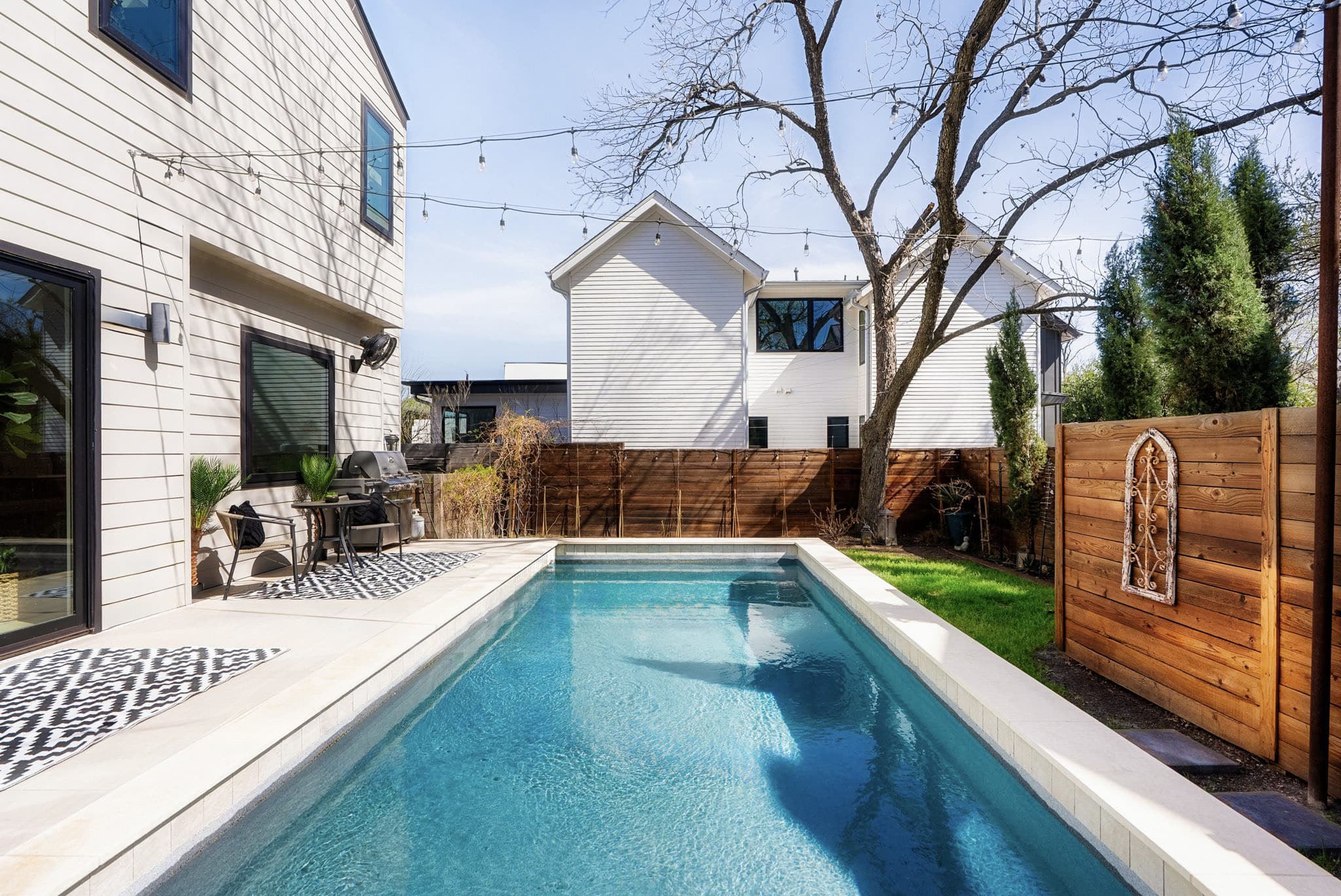 The pool area is the heart of the home — a private retreat framed by lush greenery. Spend your days cooling off in the water, stretch out on a lounger with a book, or gather under the shade for long conversations. The BBQ grill and outdoor dining table make it easy to turn afternoons into relaxed evenings, while the firepit sets the scene for late-night gatherings under the Austin sky.