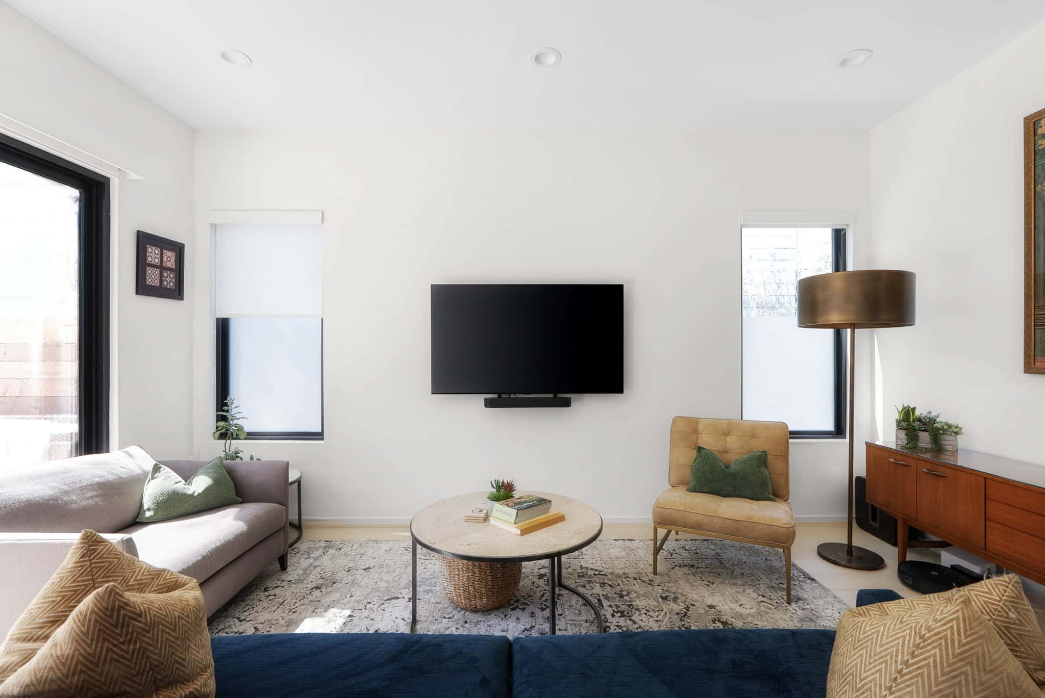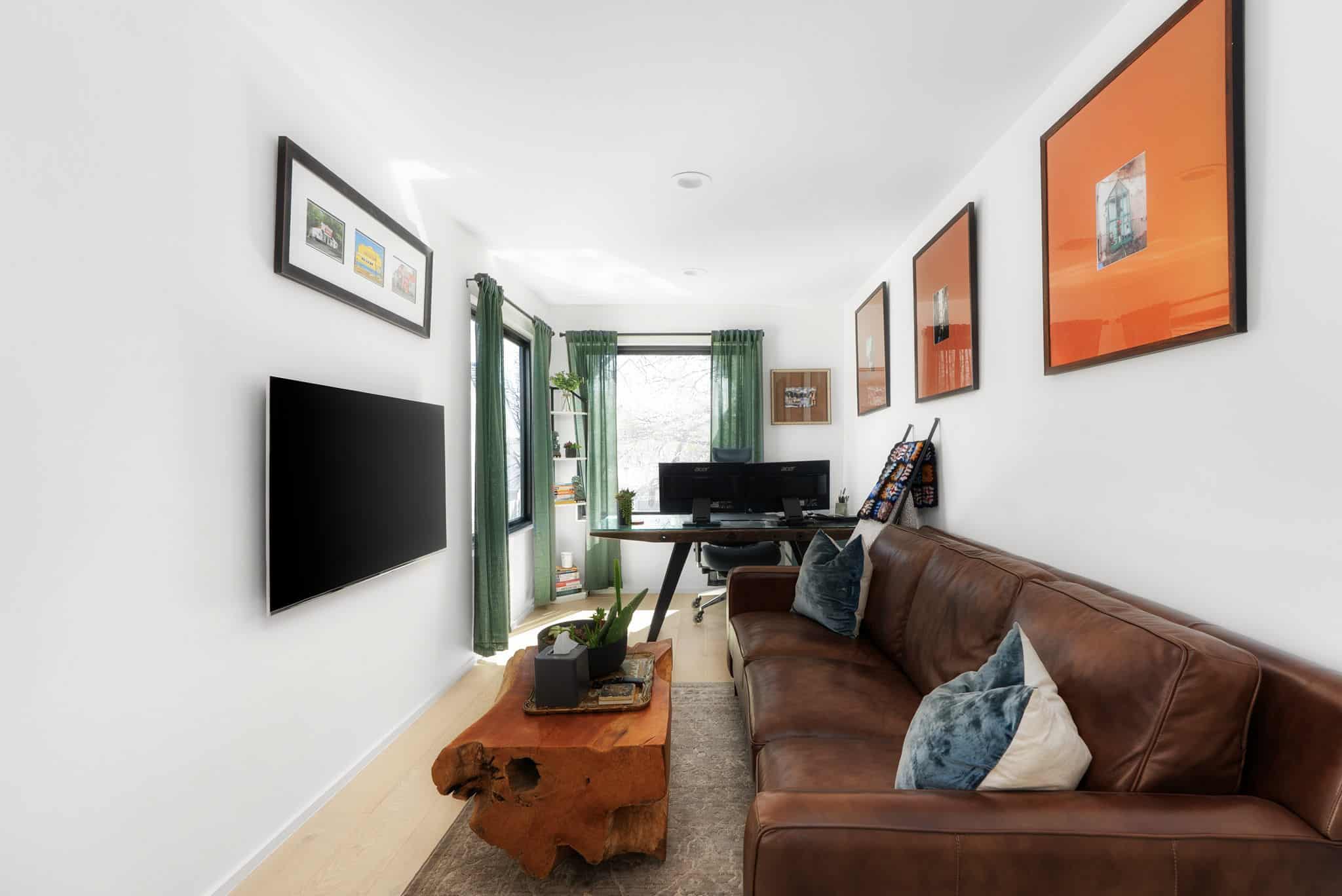 Upstairs, the primary suite offers a king bed, with two guest rooms featuring a queen and a full. A second living space provides a quiet retreat, complete with a leather sofa, large TV, and a full workspace equipped with multiple monitors.