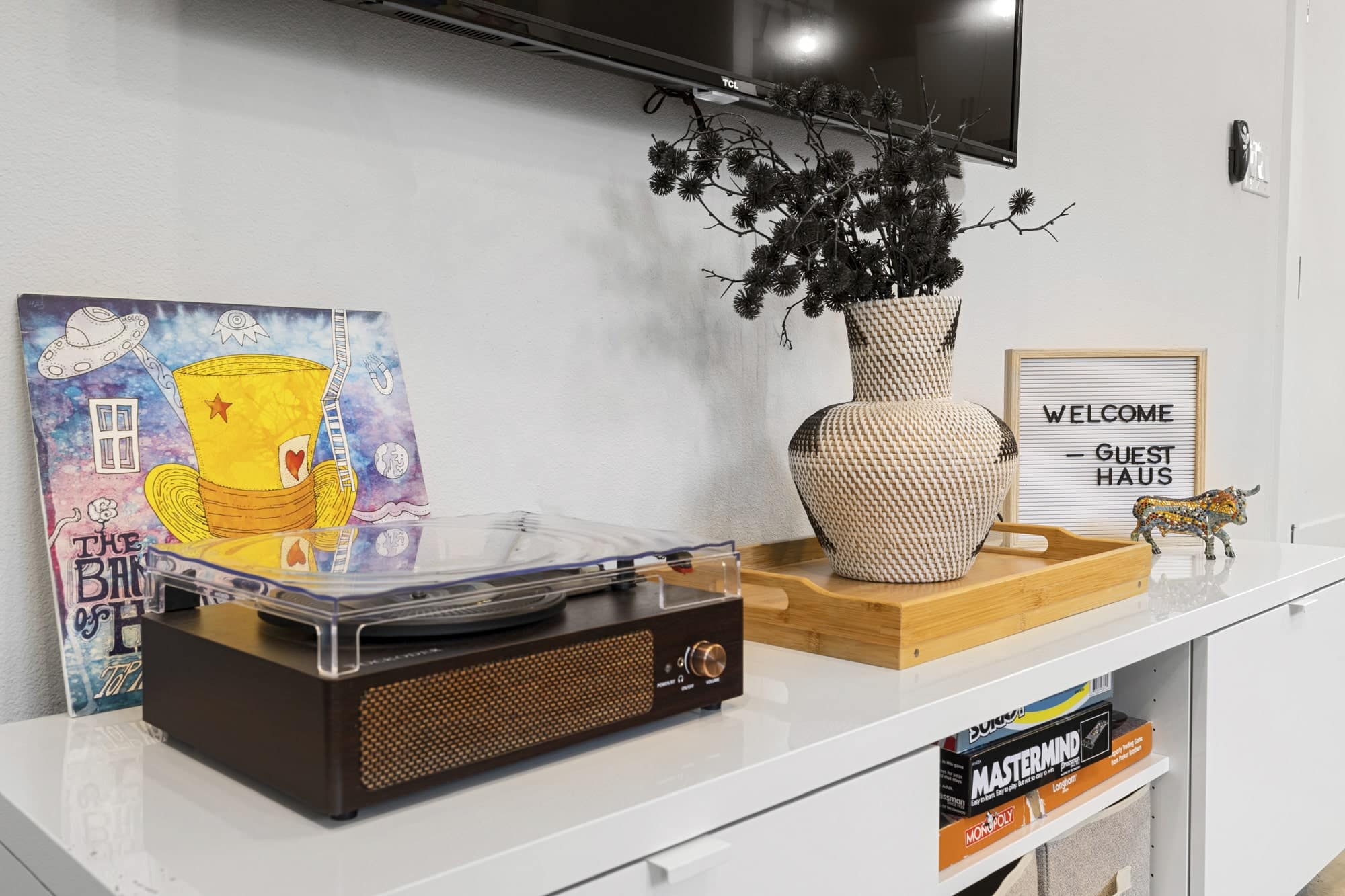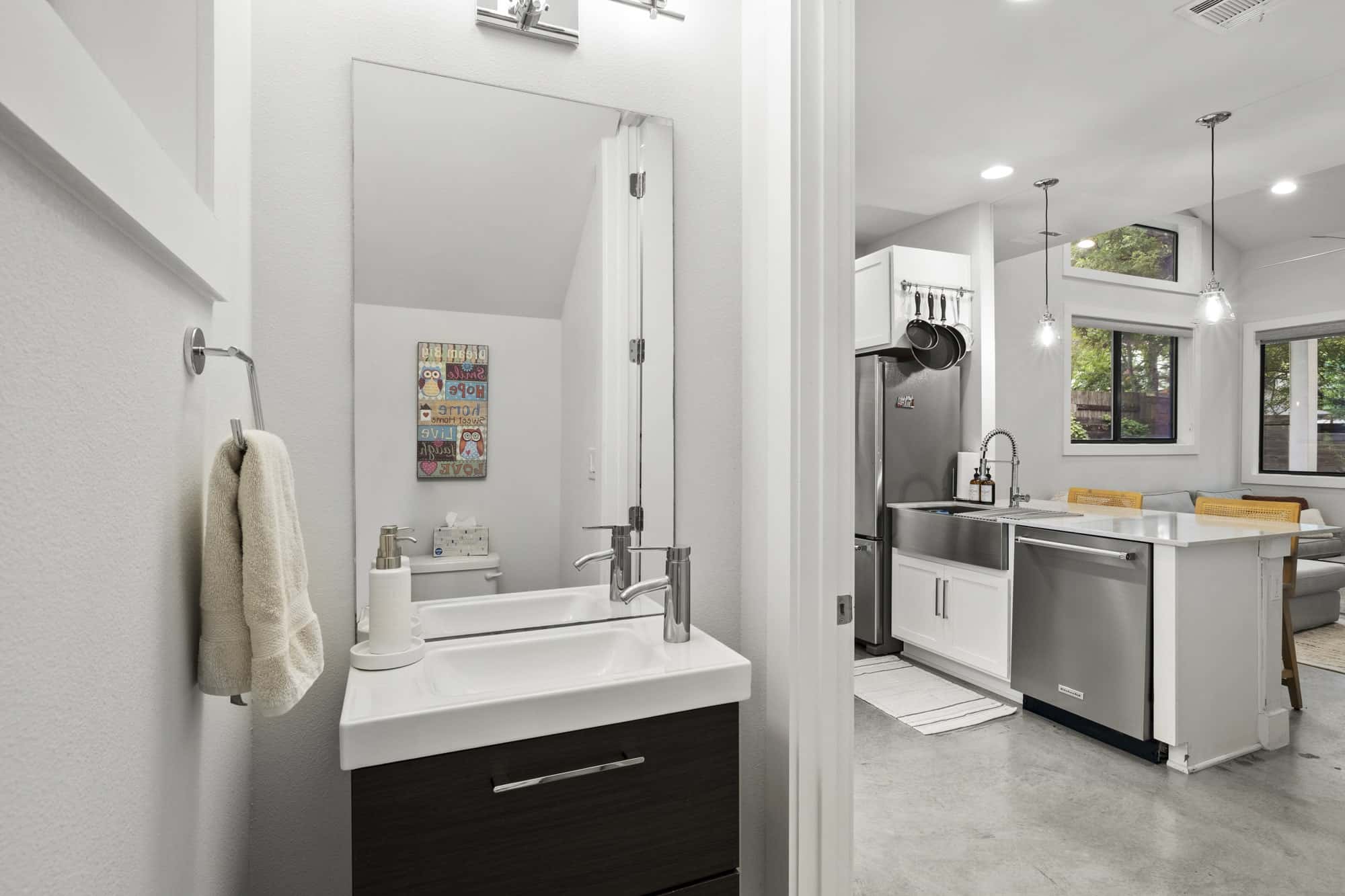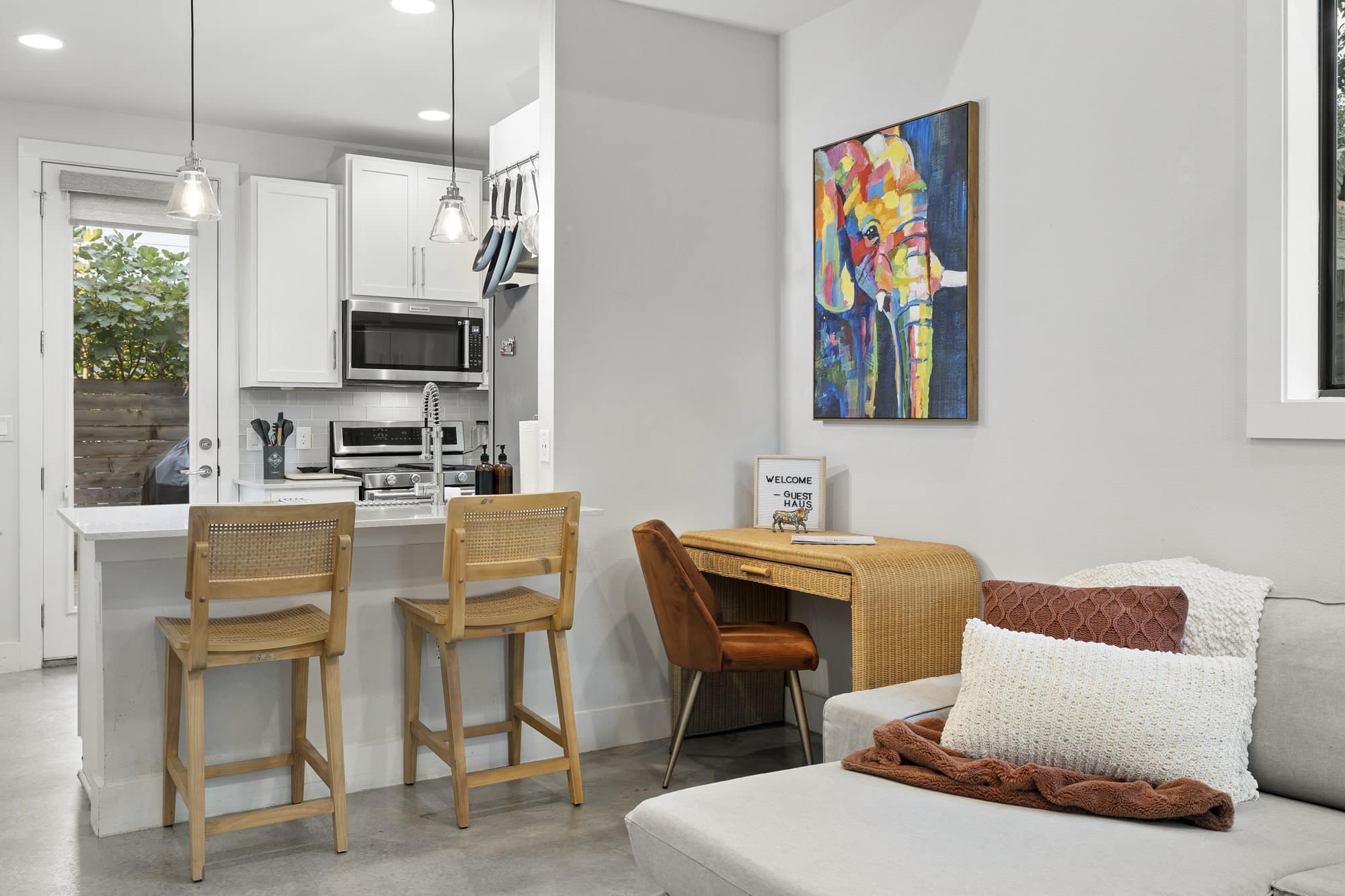 Welcome to this stylish and comfortable 2-story home, thoughtfully designed for relaxation and entertainment. On the first floor, you’ll find a cozy living room equipped with a comfortable couch, TV, record player, and a selection of board games—perfect for unwinding after a day of exploring Austin. There’s also a dedicated desk for those who need space to work, making this home ideal for both leisure and productivity. The open-concept kitchen provides all the essentials for preparing meals, and a convenient half bathroom is located just off the living area.