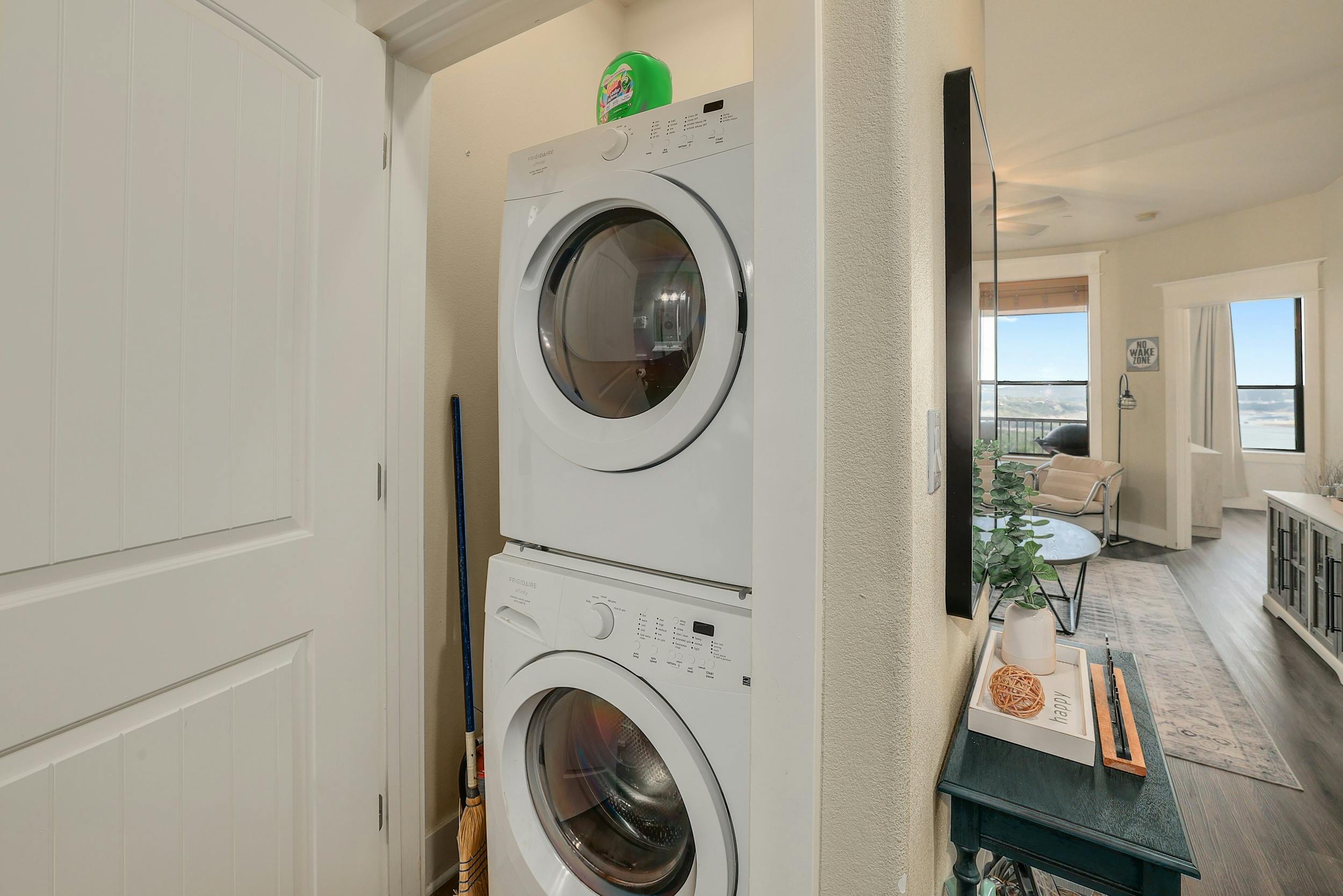 Enjoy a fully equipped kitchen where you can prepare meals with ease before heading out to the balcony. Take in panoramic views of Lake Travis from this serene outdoor space, ideal for morning coffee or evening sunsets.