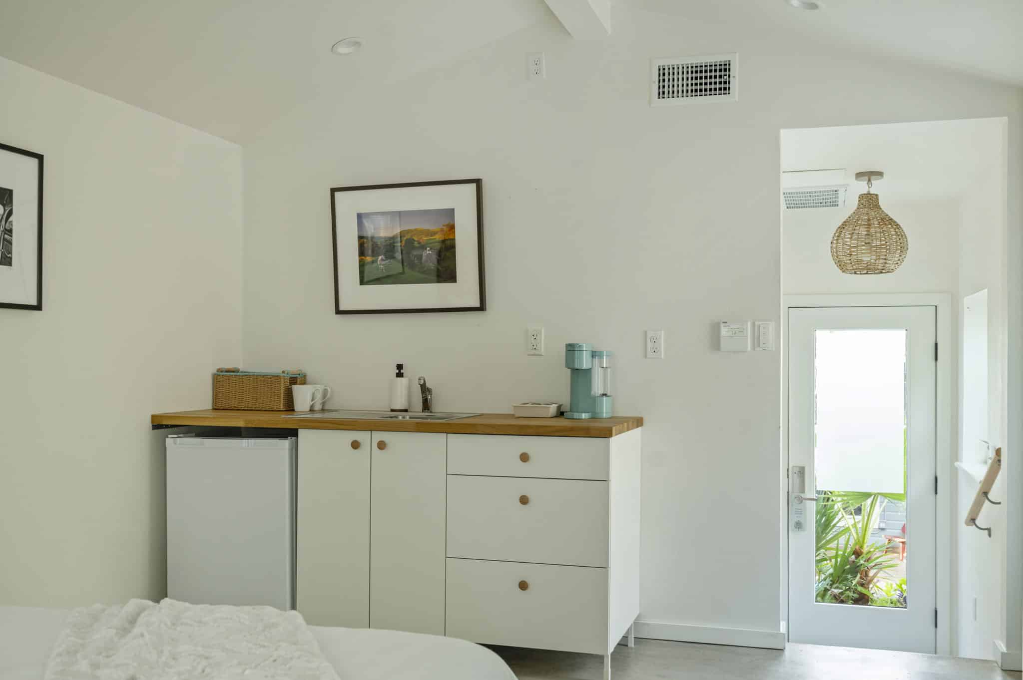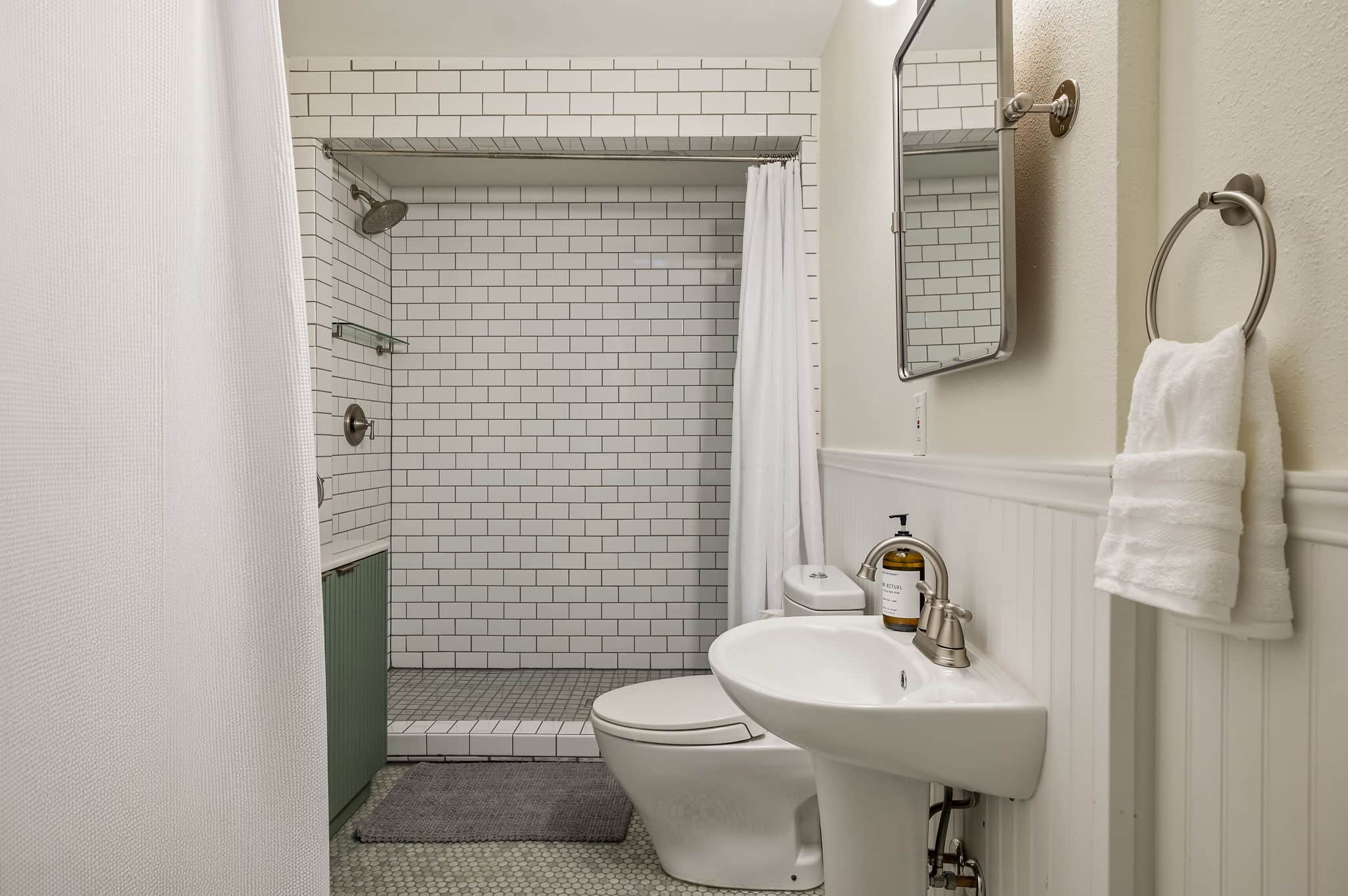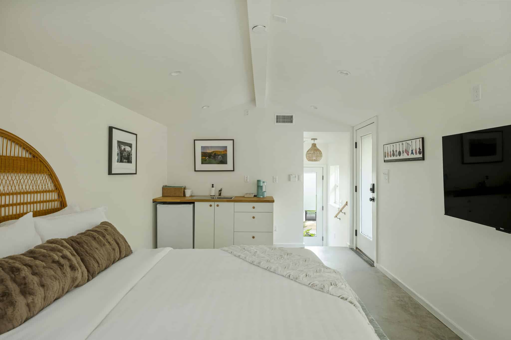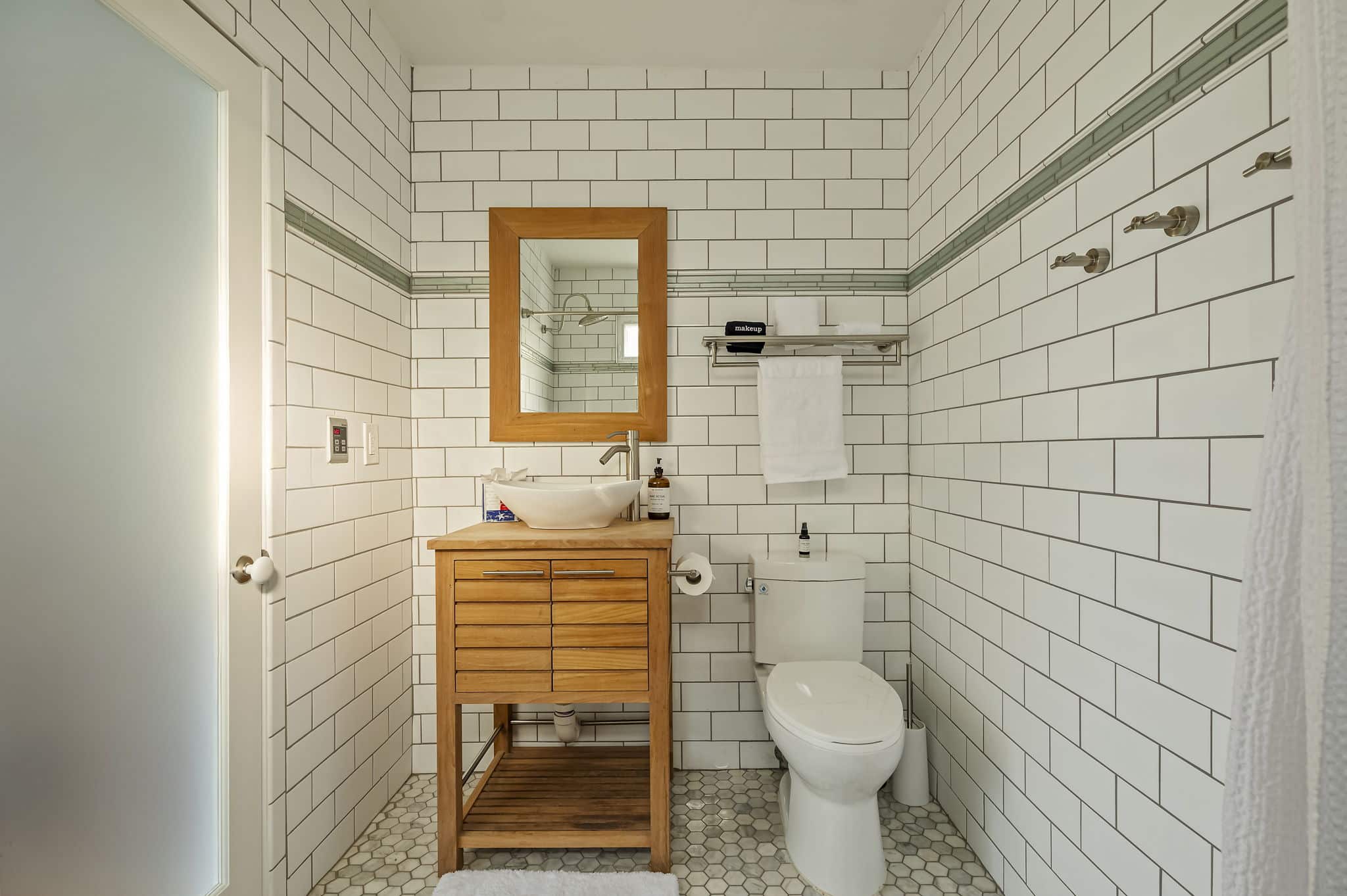 Descending further, the main house reveals itself with glass doors and light pouring into its open plan. The kitchen blends farmhouse charm with modern touches, equipped with eco-friendly cookware, flowing into a dining space framed by a wall of windows and the greenery beyond. The living area is warm and inviting, anchored by thoughtful design details. Two bedrooms and two full baths round out this level – the primary with a king bed and the second with a queen – each styled for both comfort and calm.