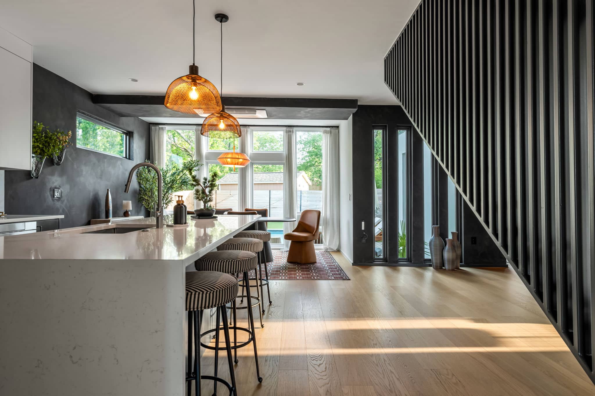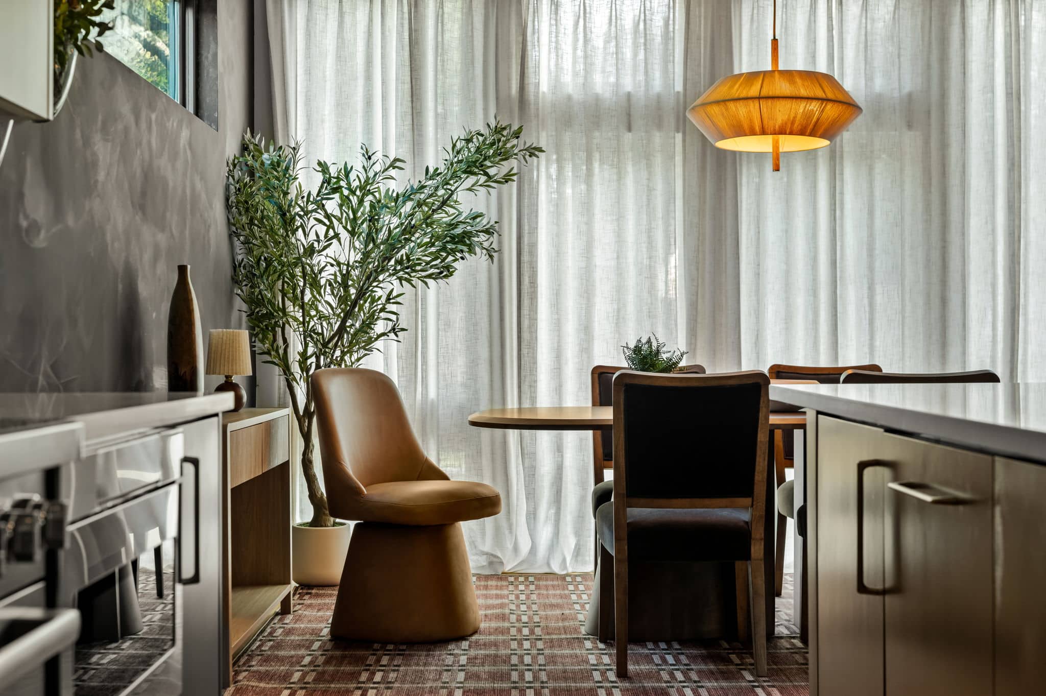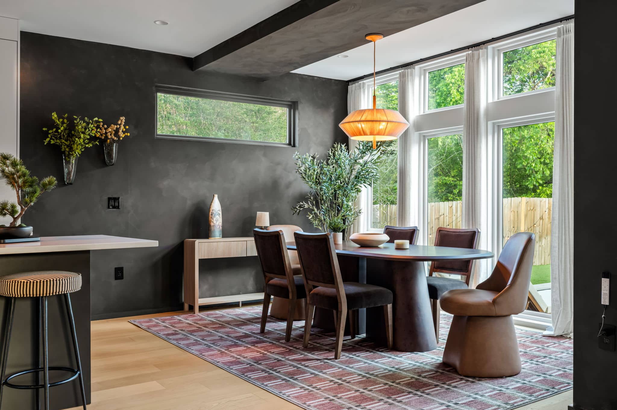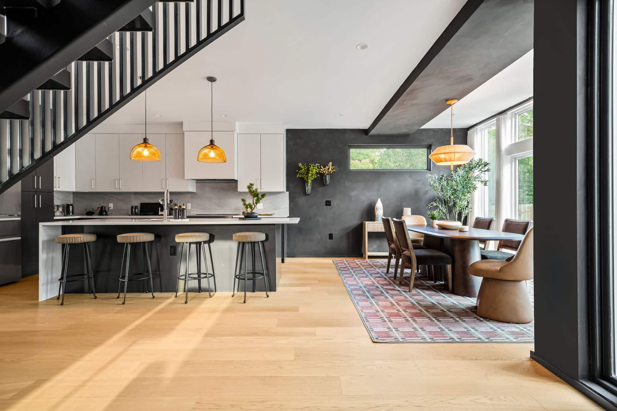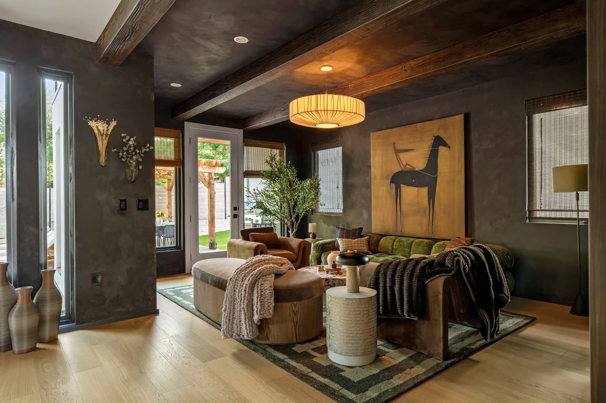 Step through the front door of the main house and the mood hits immediately – dark, textured walls, warm light, and a space that feels nothing like a vacation rental.