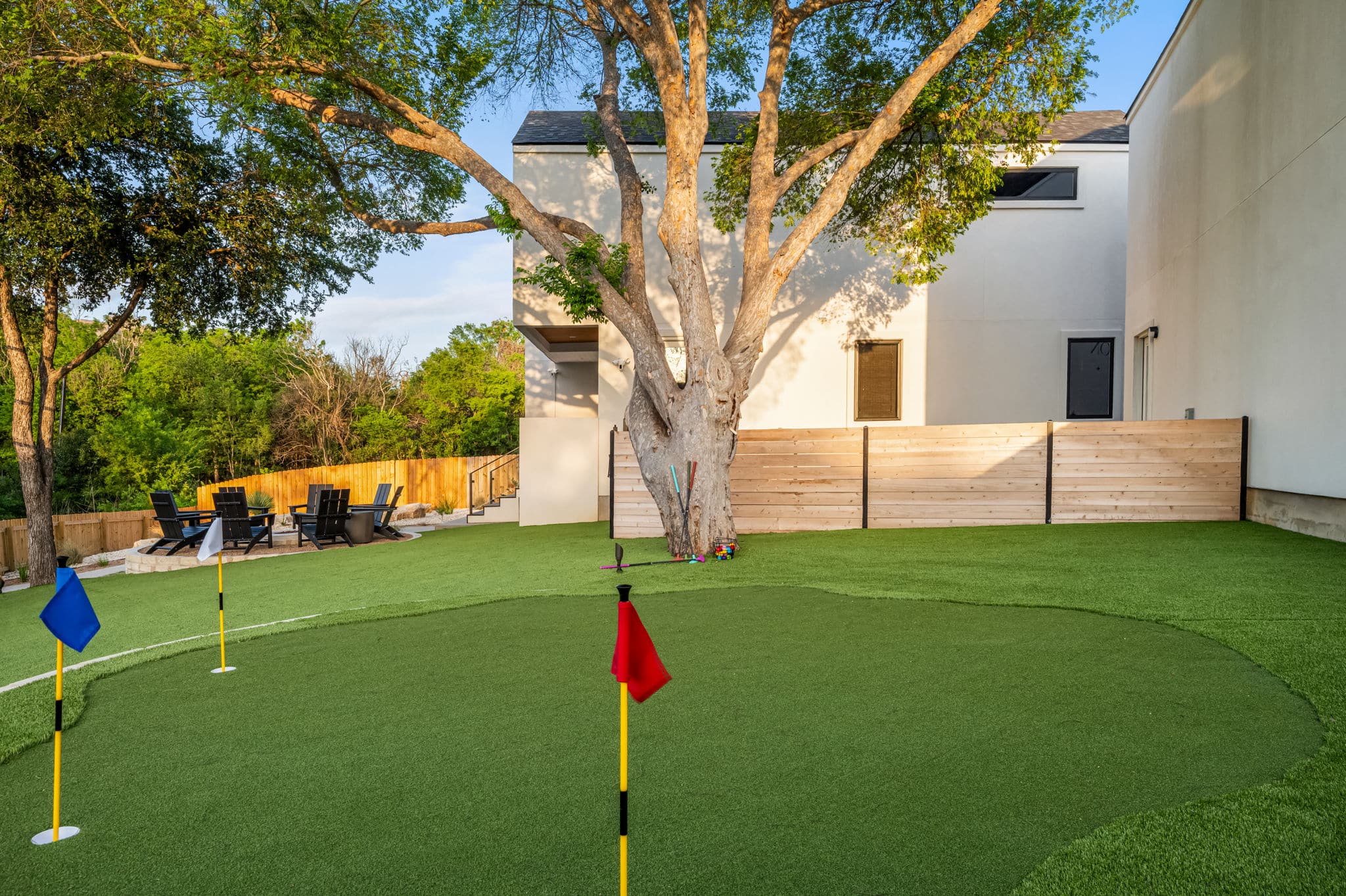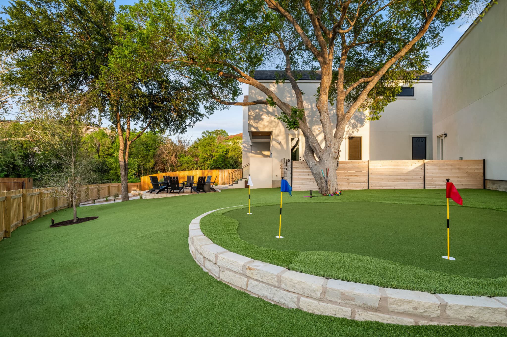 Out front, a fire pit circle with 8 Adirondack chairs and a putting green round out the estate grounds.