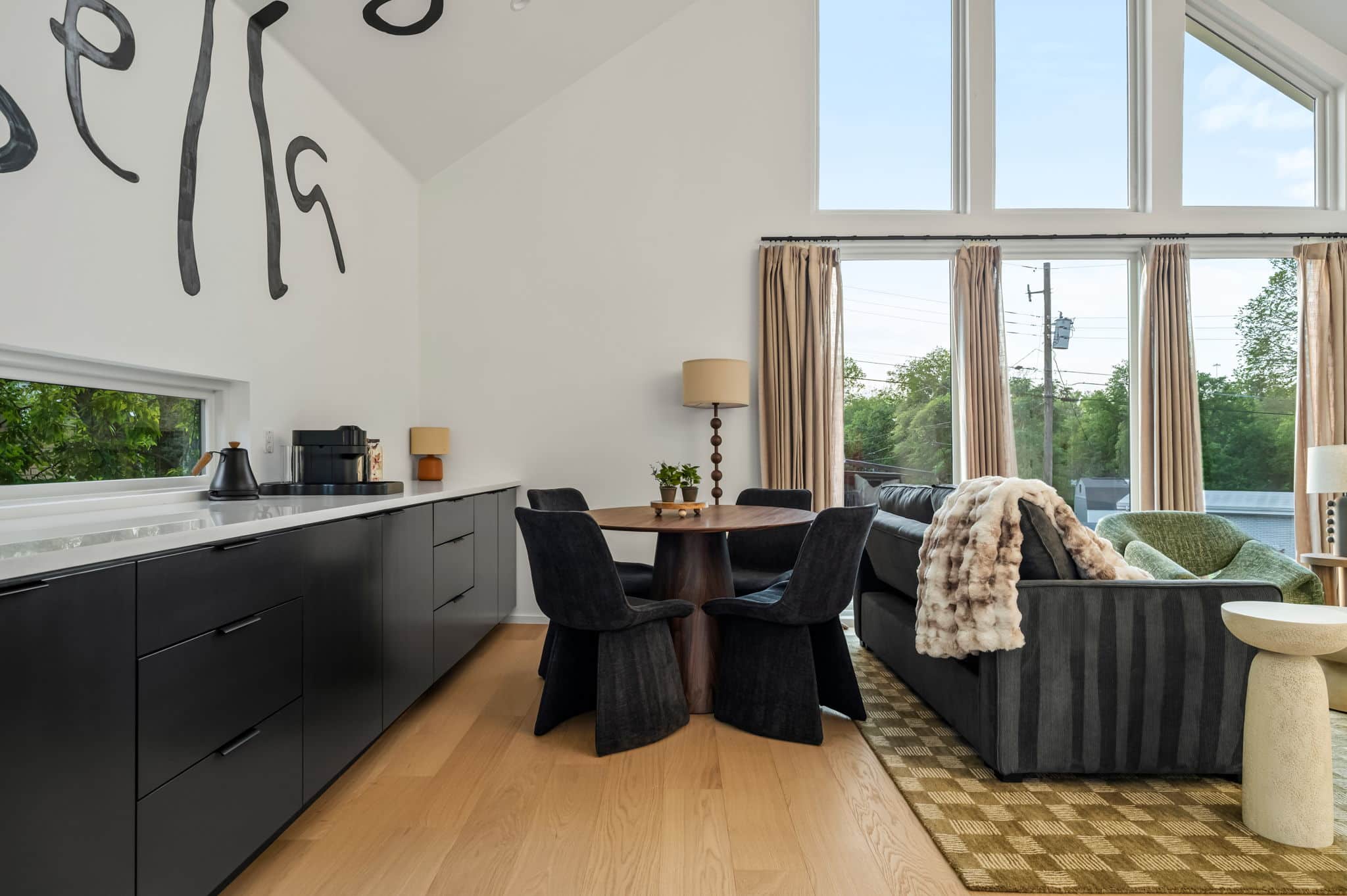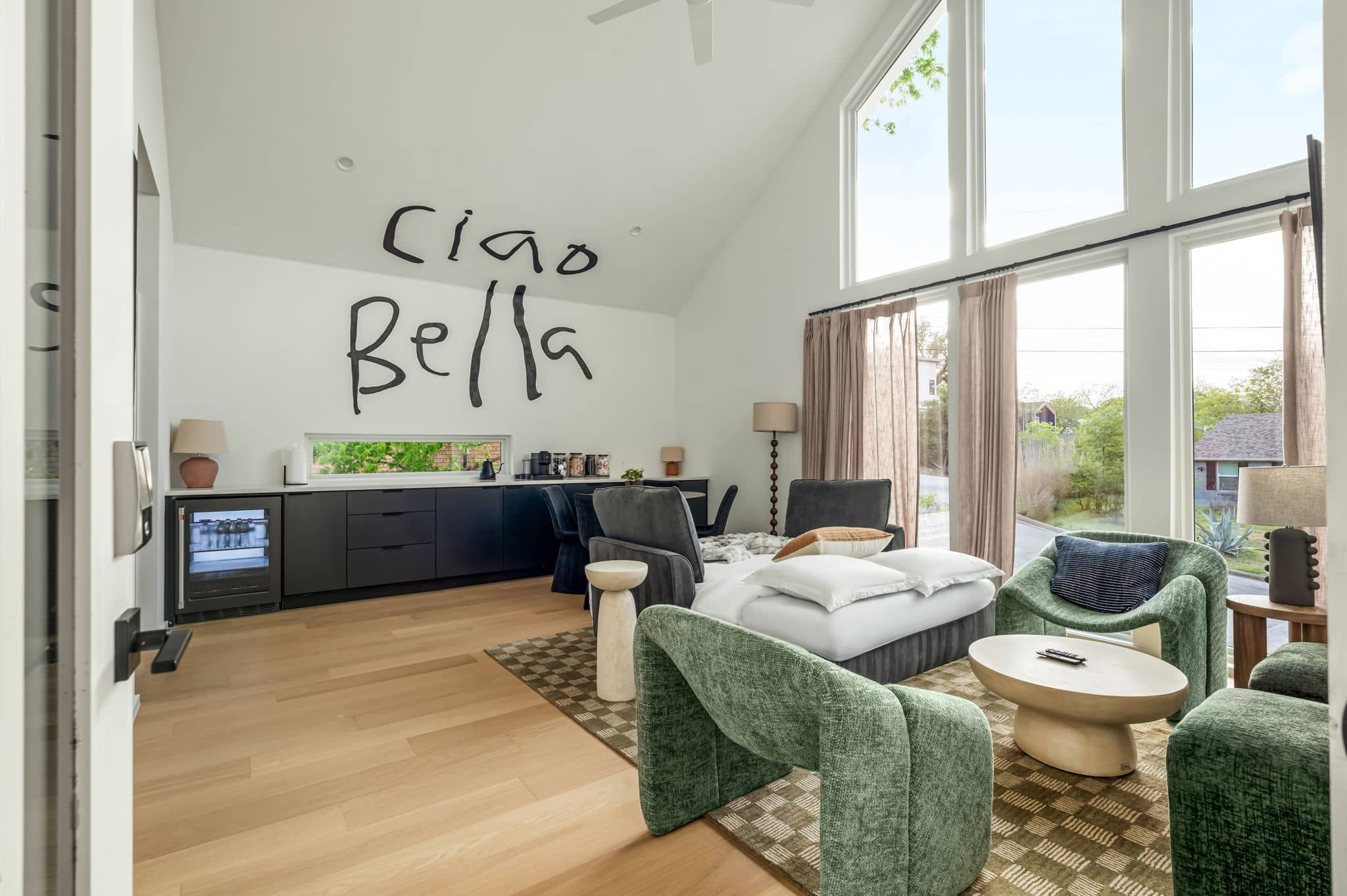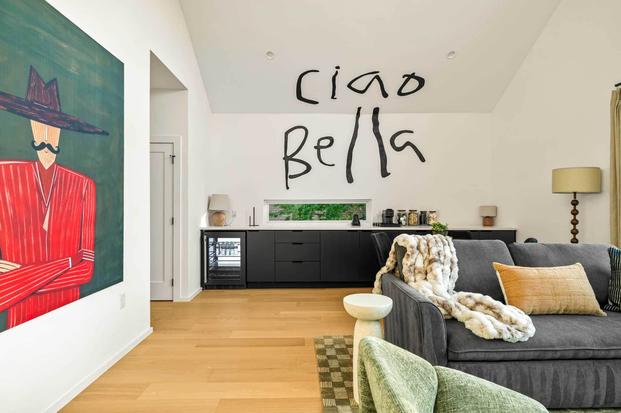 Head up the stairs and you’re in the loft – a bright, playful contrast to the main house’s dark drama. “Ciao Bella” is painted across the vaulted wall in bold brushstrokes. The open living area features a queen sleeper sofa, a flat screen TV, a dining nook, a coffee station and a mini fridge. The private king bedroom is calm and considered, with its own ensuite bath featuring a walk-in glass shower and designer tile.