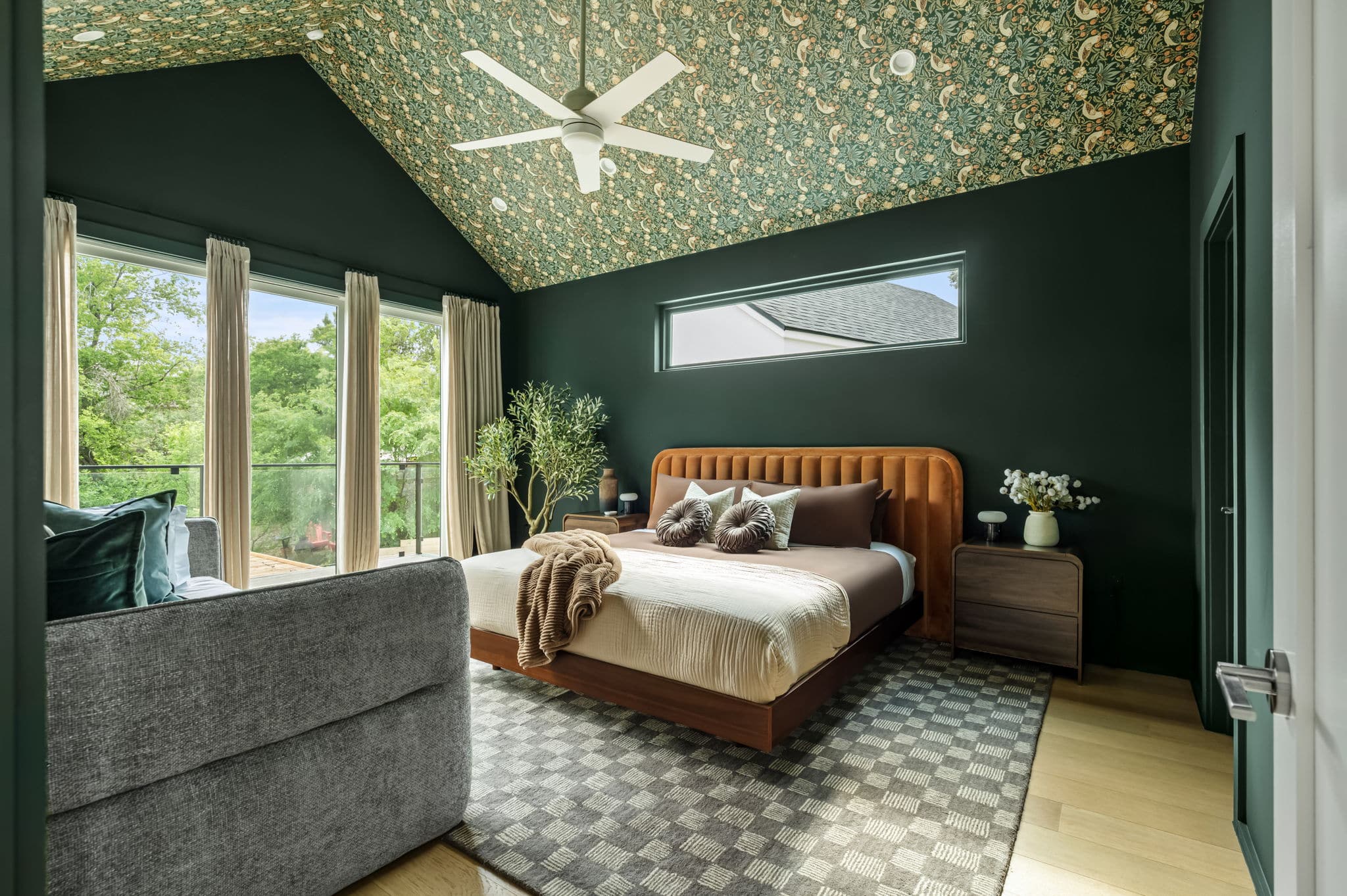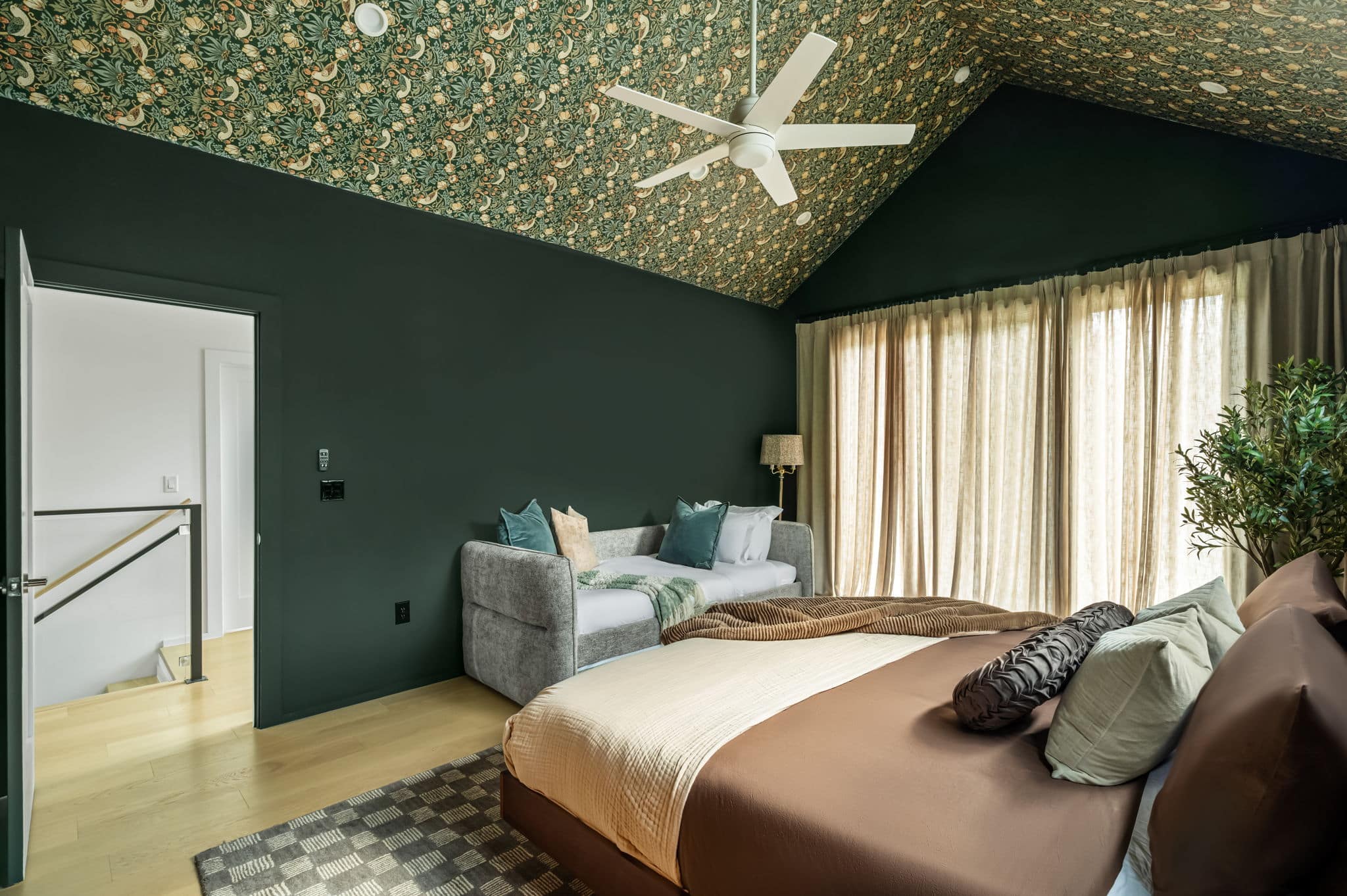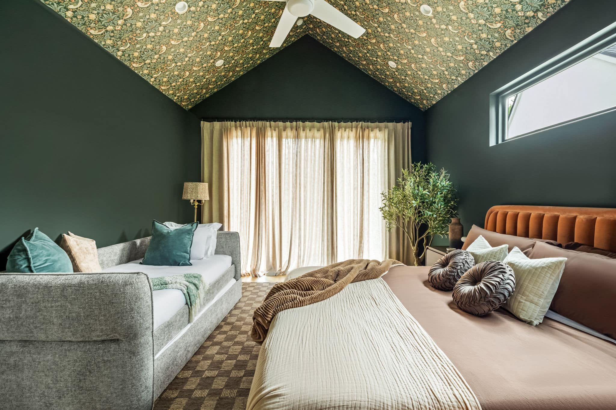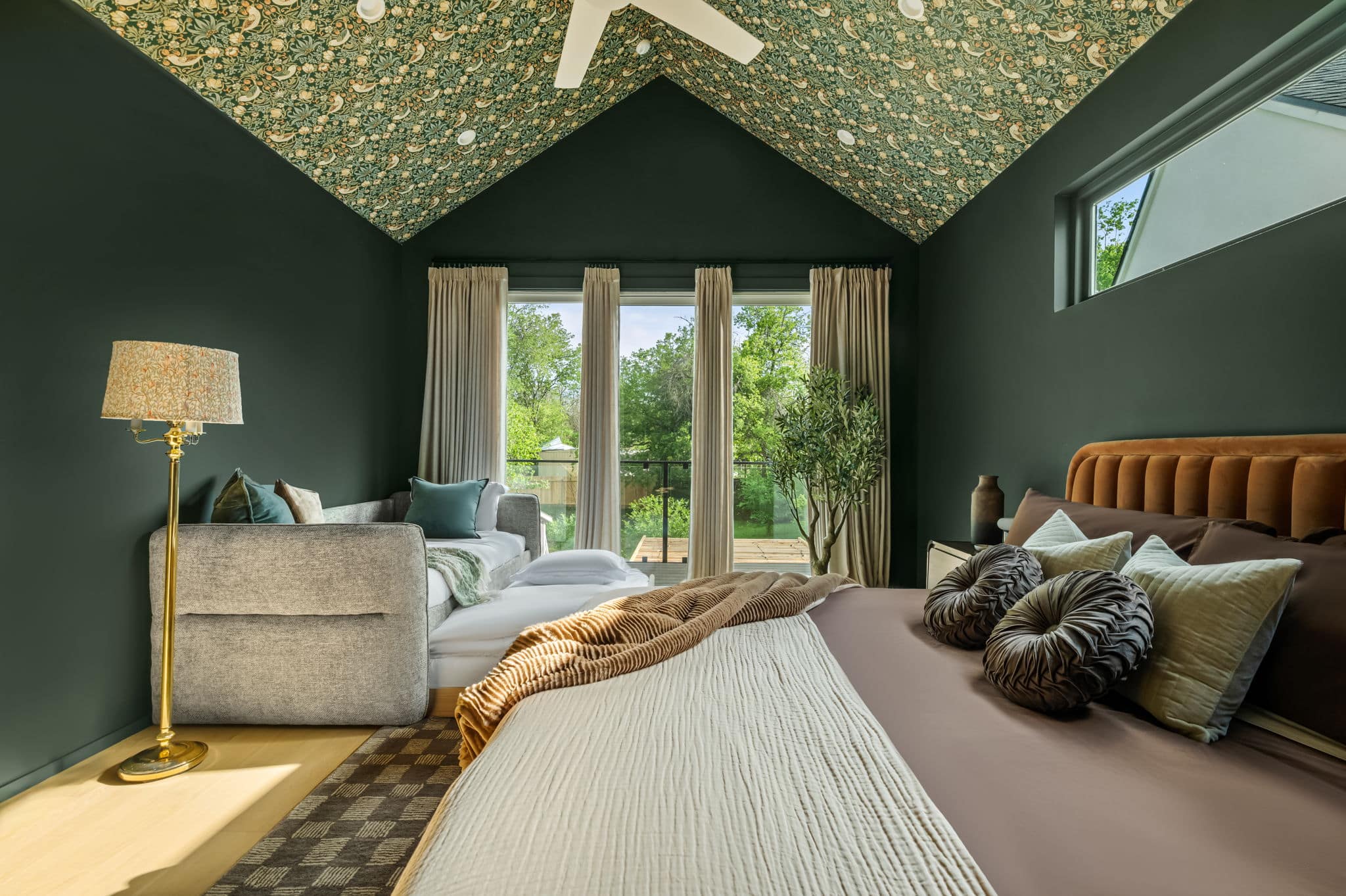 The primary suite is the crown jewel – a king bed beneath a botanical wallpapered vaulted ceiling, a burnt orange velvet headboard, a daybed with trundle for up to 2 additional guests, a private balcony overlooking the pool, a walk-in closet with a vanity nook, and an ensuite bath with a freestanding soaking tub and double vanity.