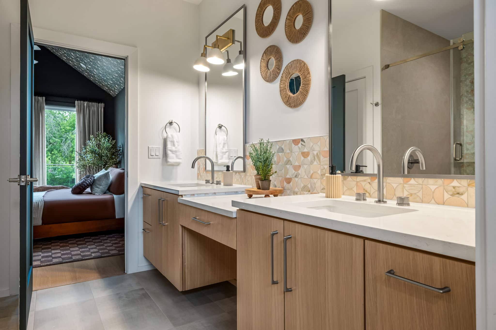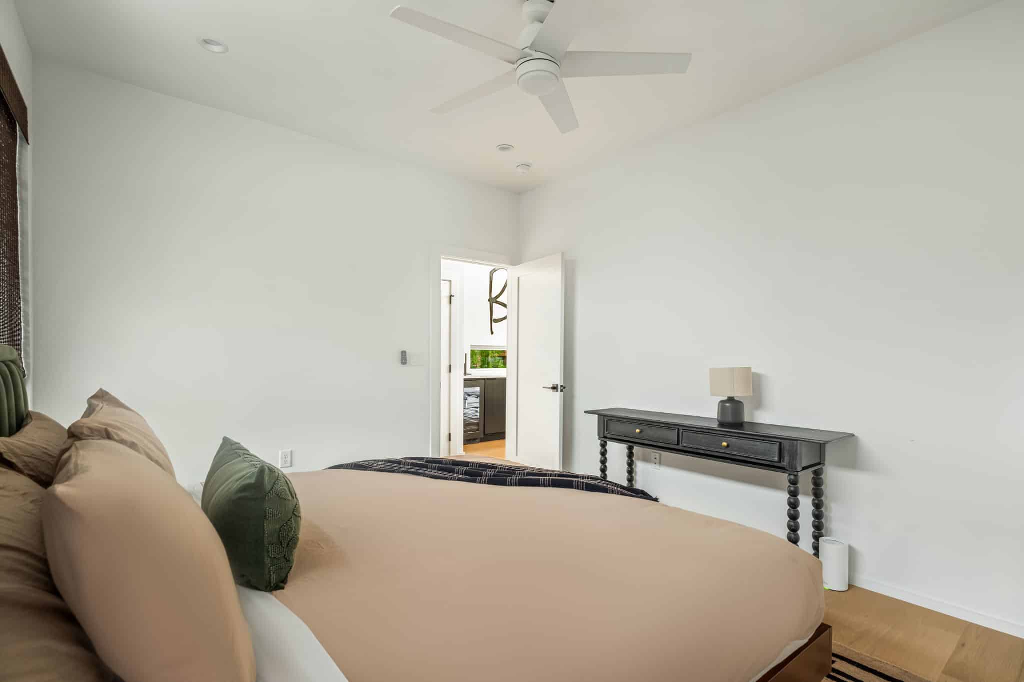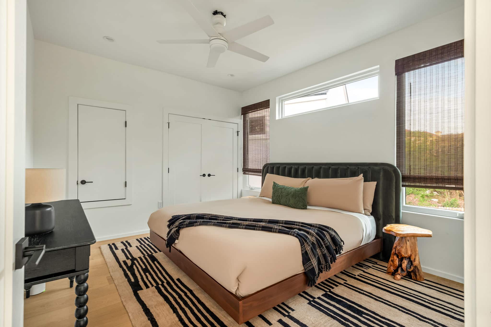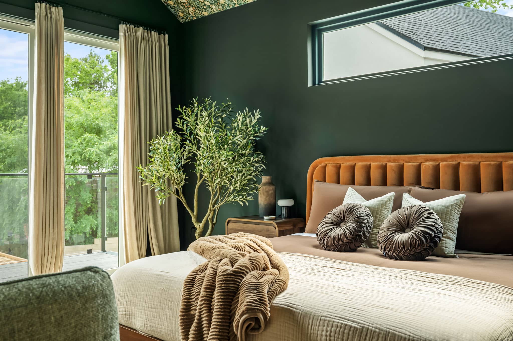 The primary suite is the crown jewel – a king bed beneath a botanical wallpapered vaulted ceiling, a burnt orange velvet headboard, a daybed with trundle for up to 2 additional guests, a private balcony overlooking the pool, a walk-in closet with a vanity nook, and an ensuite bath with a freestanding soaking tub and double vanity.