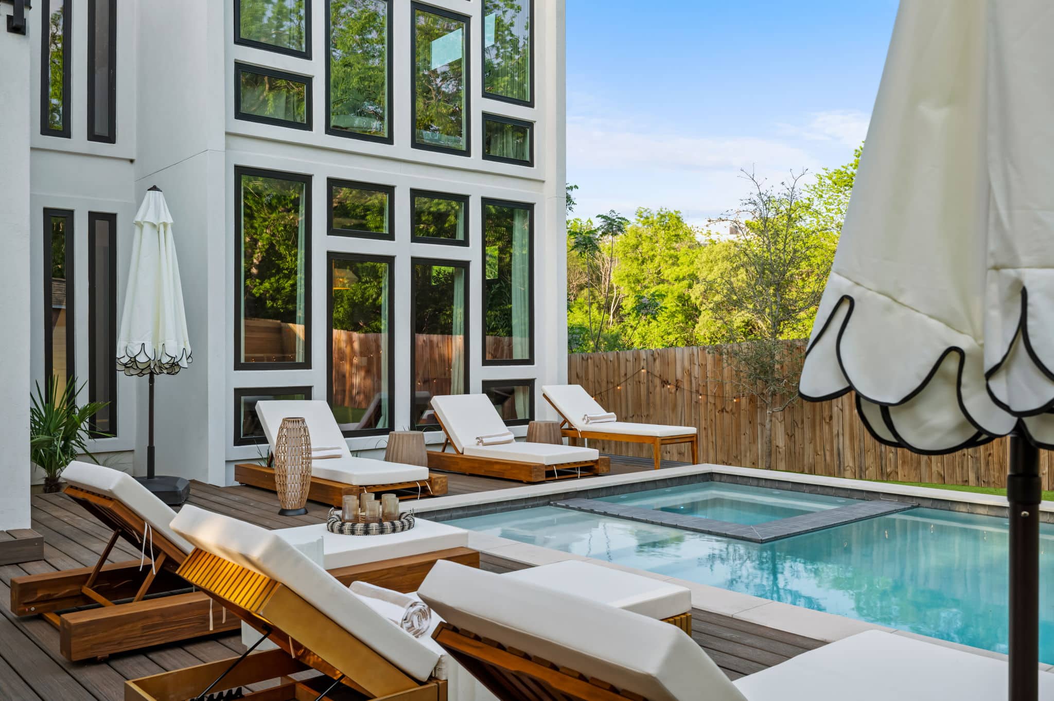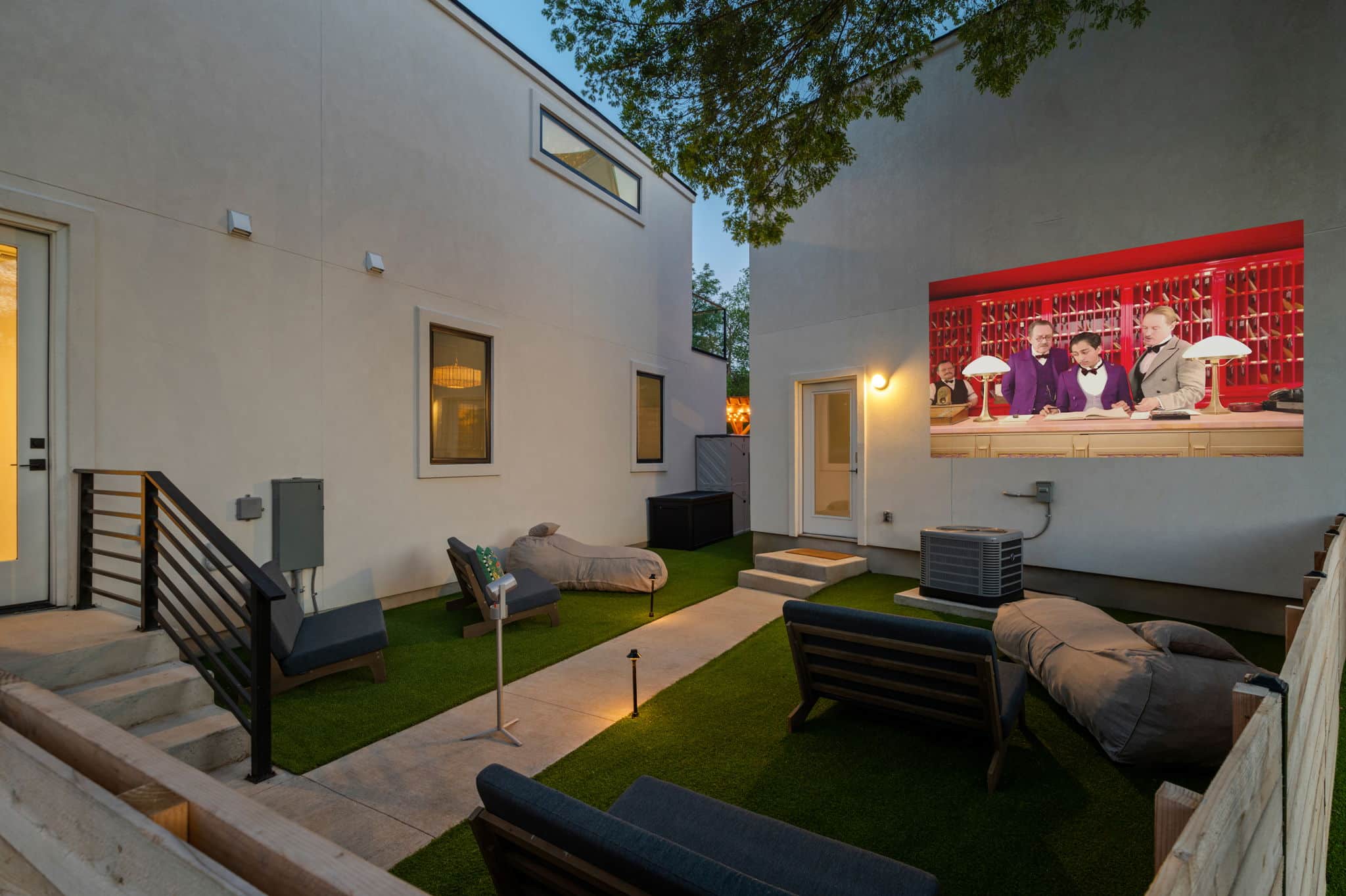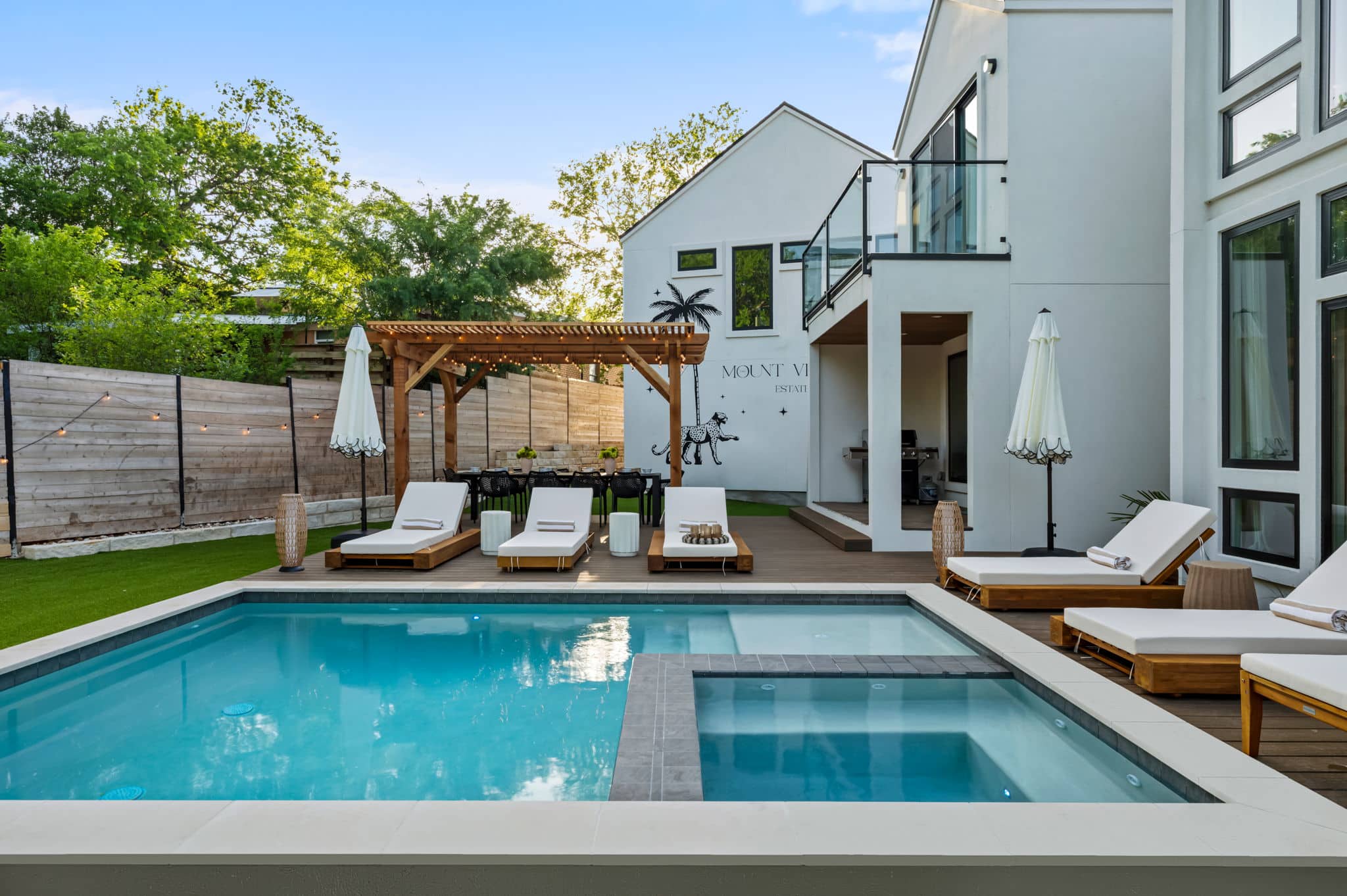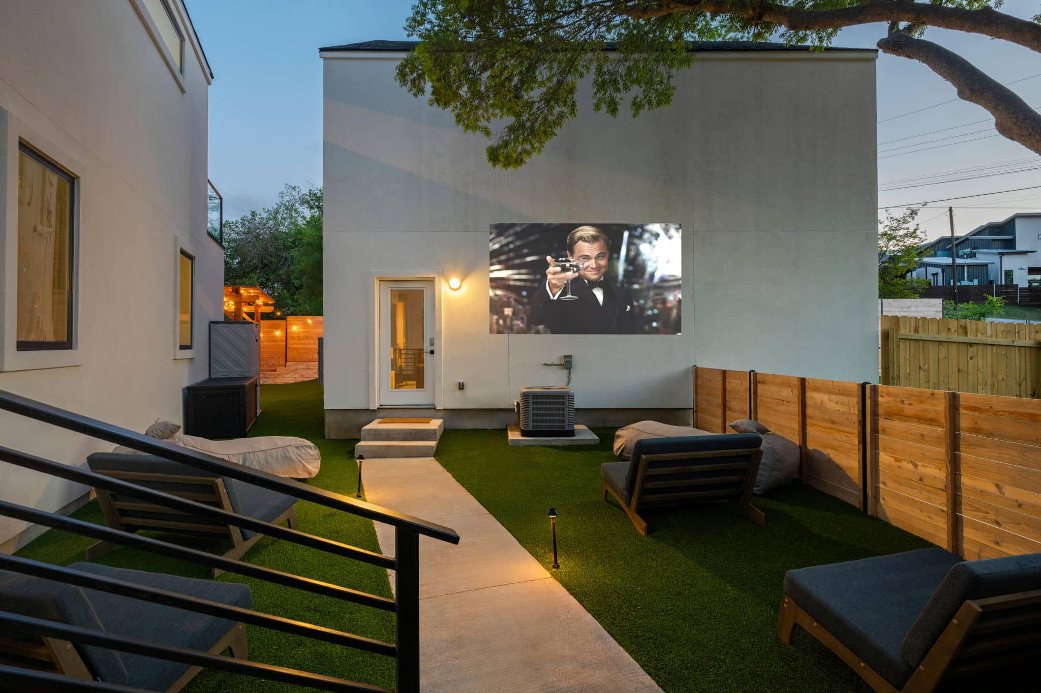 The backyard is where the group gathers. A heated pool and hot tub sit center stage on a warm wood deck surrounded by sun loungers. A pergola shades the outdoor dining table, with a gas grill ready to go. On the side of the house, the outdoor cinema projects onto a white wall with 4 seats and 2 loungers – perfect for a late-night movie under the Austin sky.