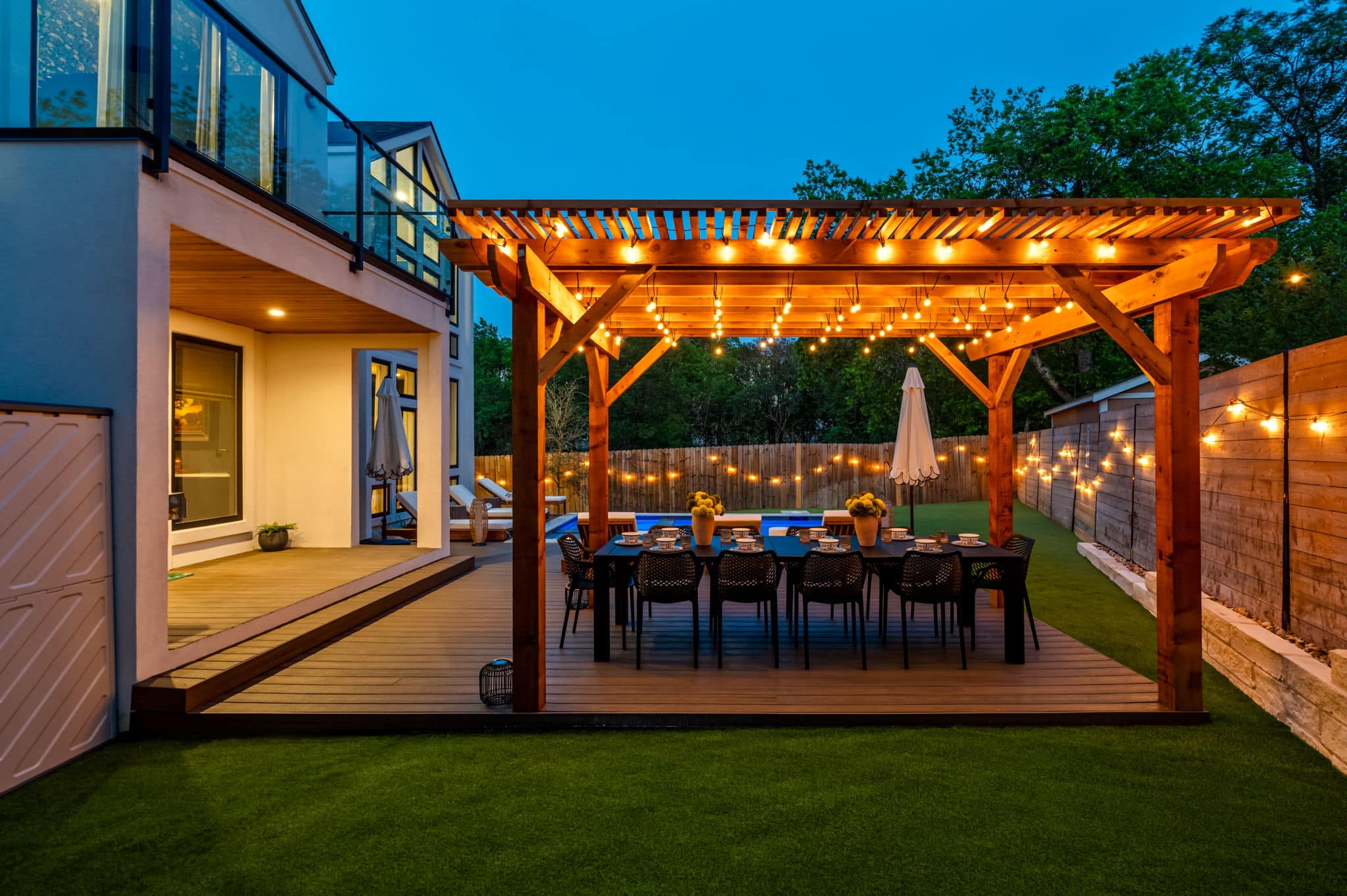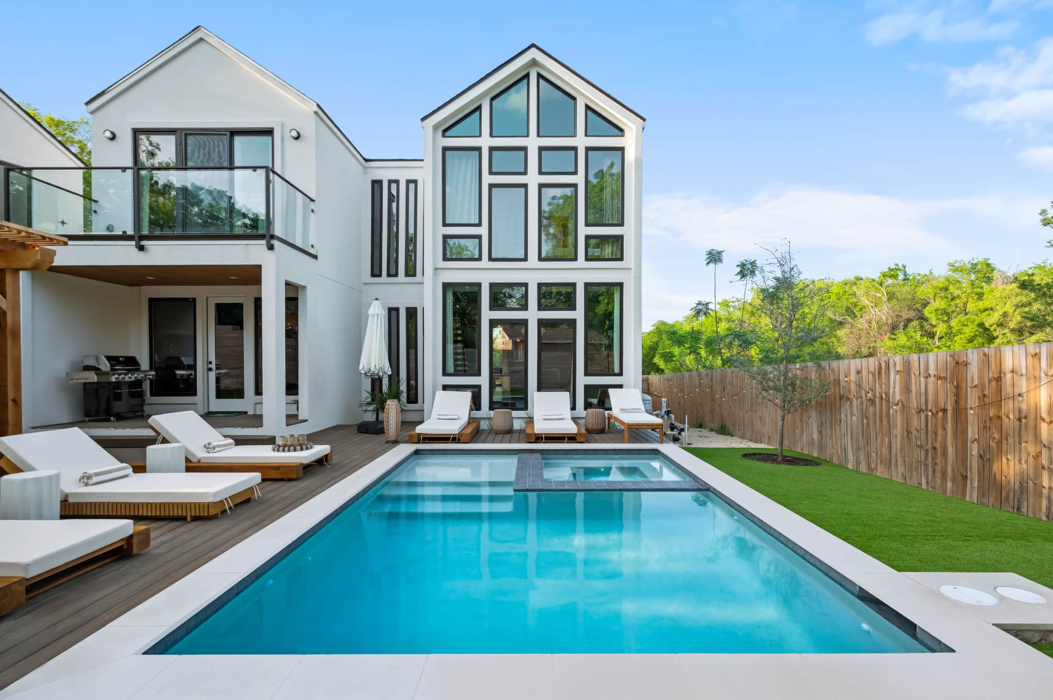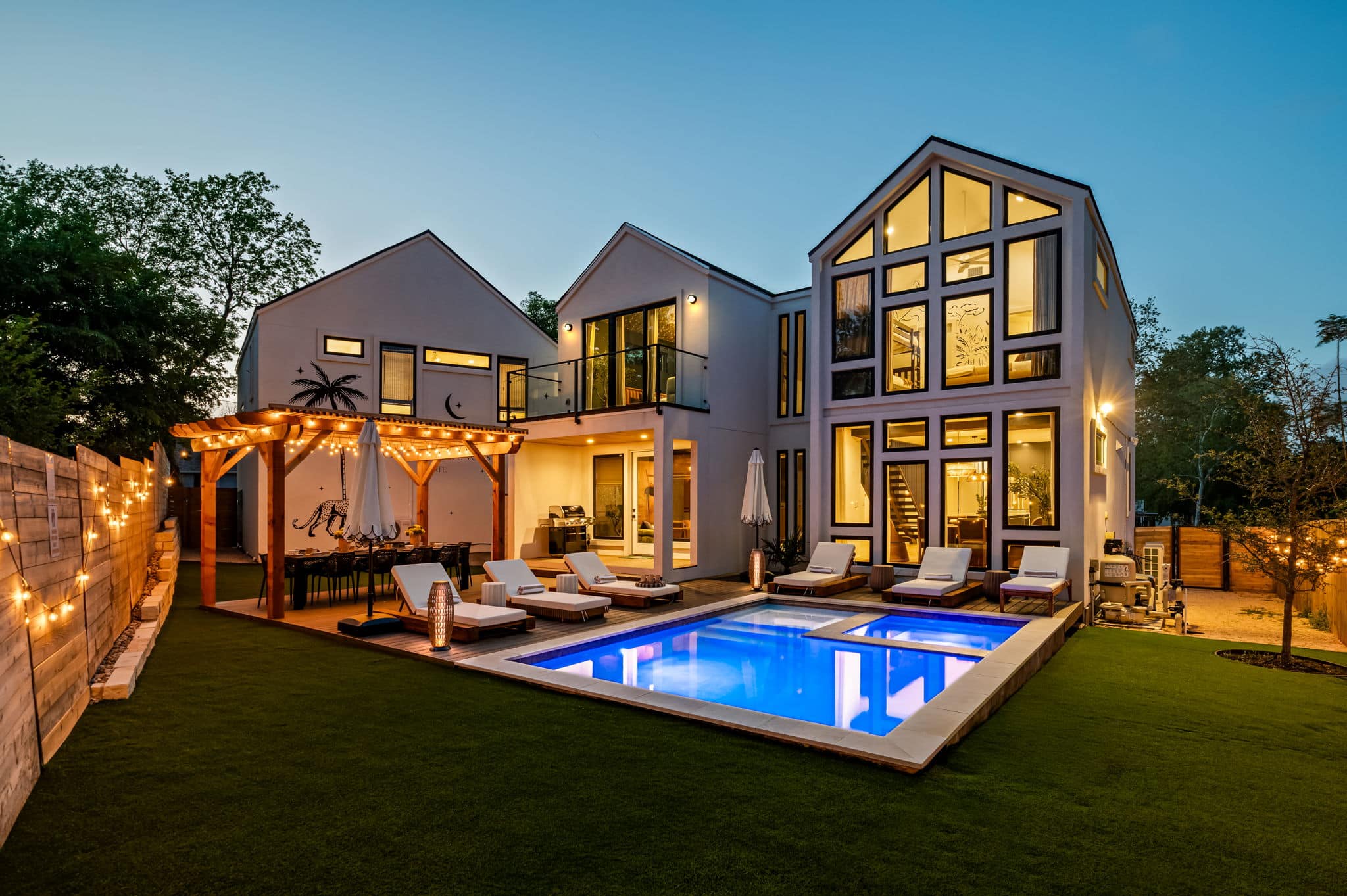 The backyard is where the group gathers. A heated pool and hot tub sit center stage on a warm wood deck surrounded by sun loungers. A pergola shades the outdoor dining table, with a gas grill ready to go. On the side of the house, the outdoor cinema projects onto a white wall with 4 seats and 2 loungers – perfect for a late-night movie under the Austin sky.