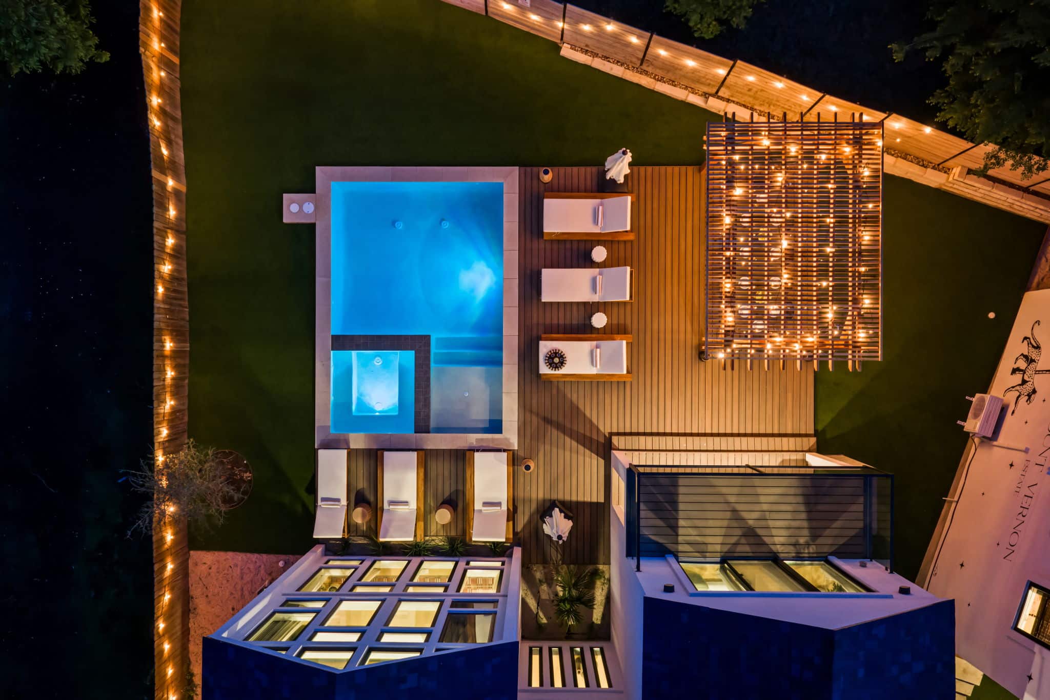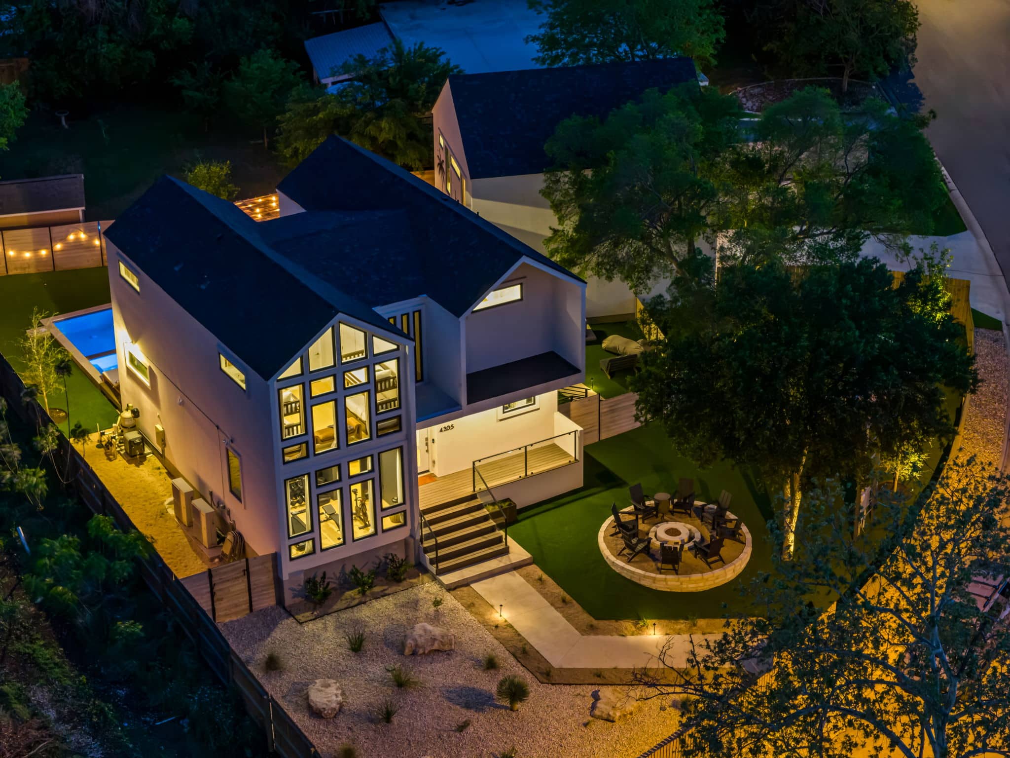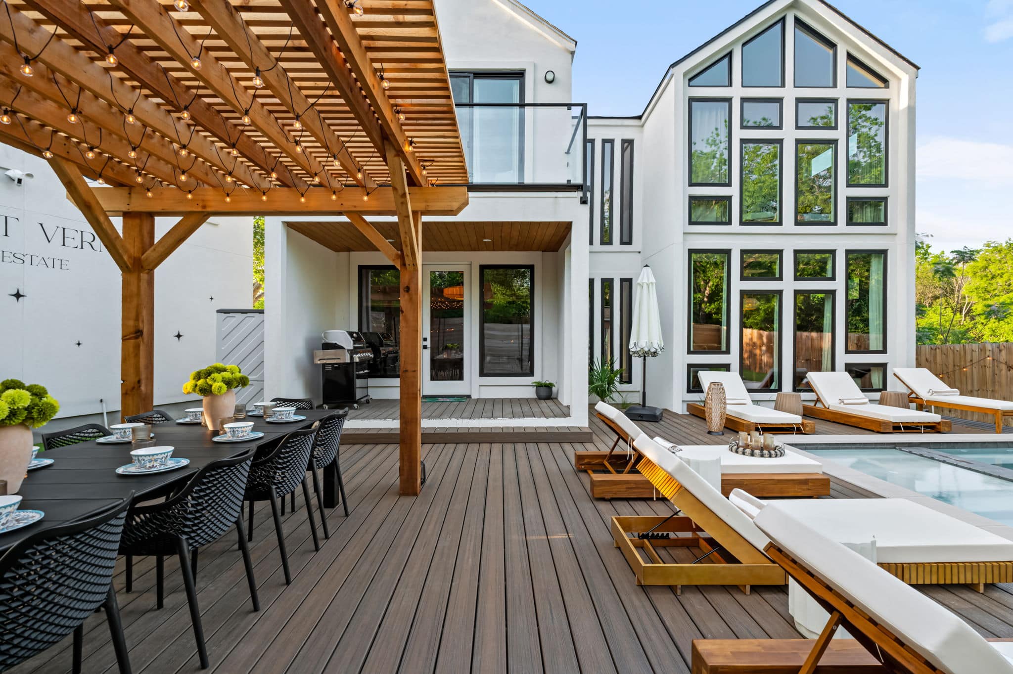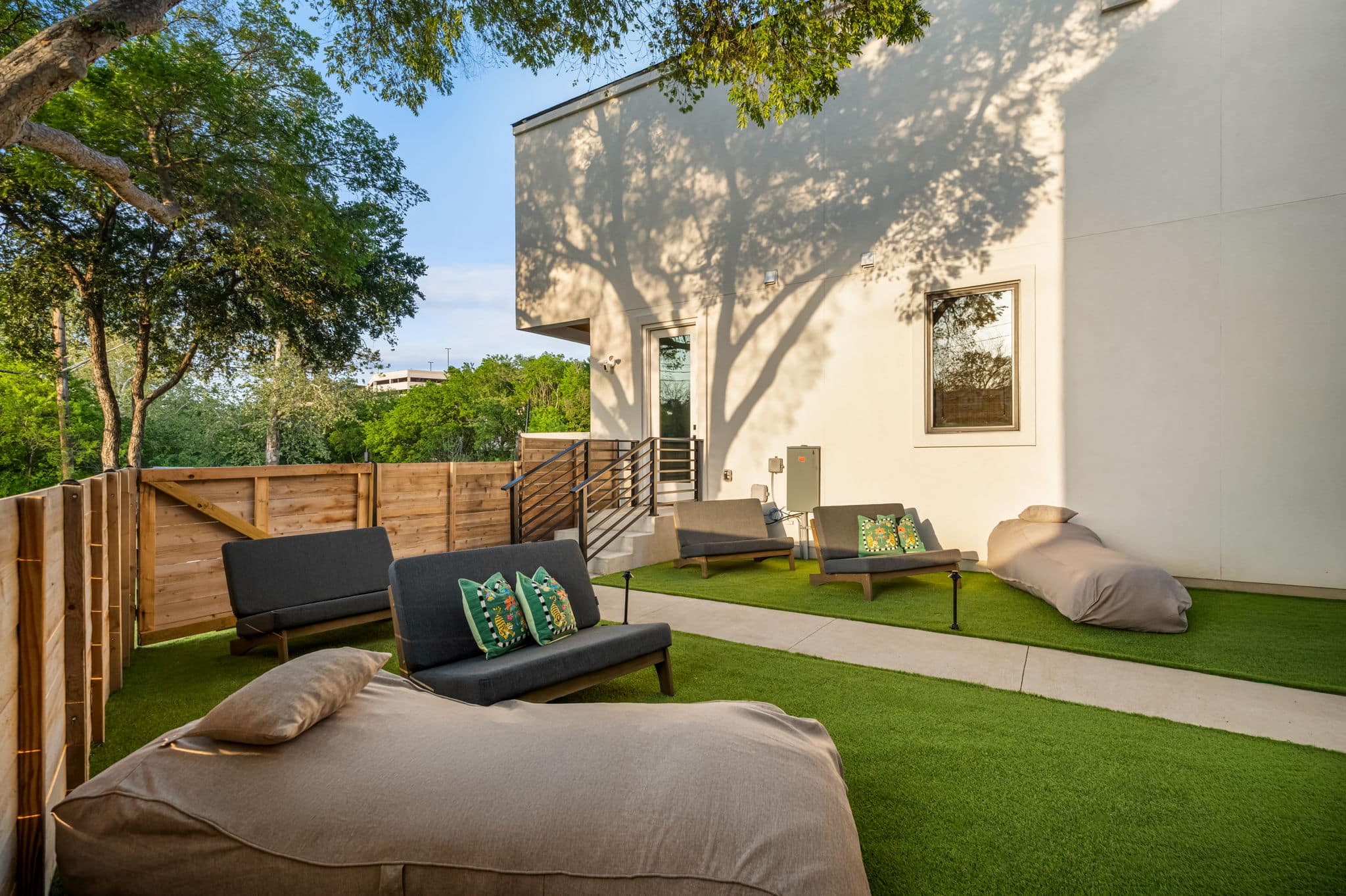 The backyard is where the group gathers. A heated pool and hot tub sit center stage on a warm wood deck surrounded by sun loungers. A pergola shades the outdoor dining table, with a gas grill ready to go. On the side of the house, the outdoor cinema projects onto a white wall with 4 seats and 2 loungers – perfect for a late-night movie under the Austin sky.
