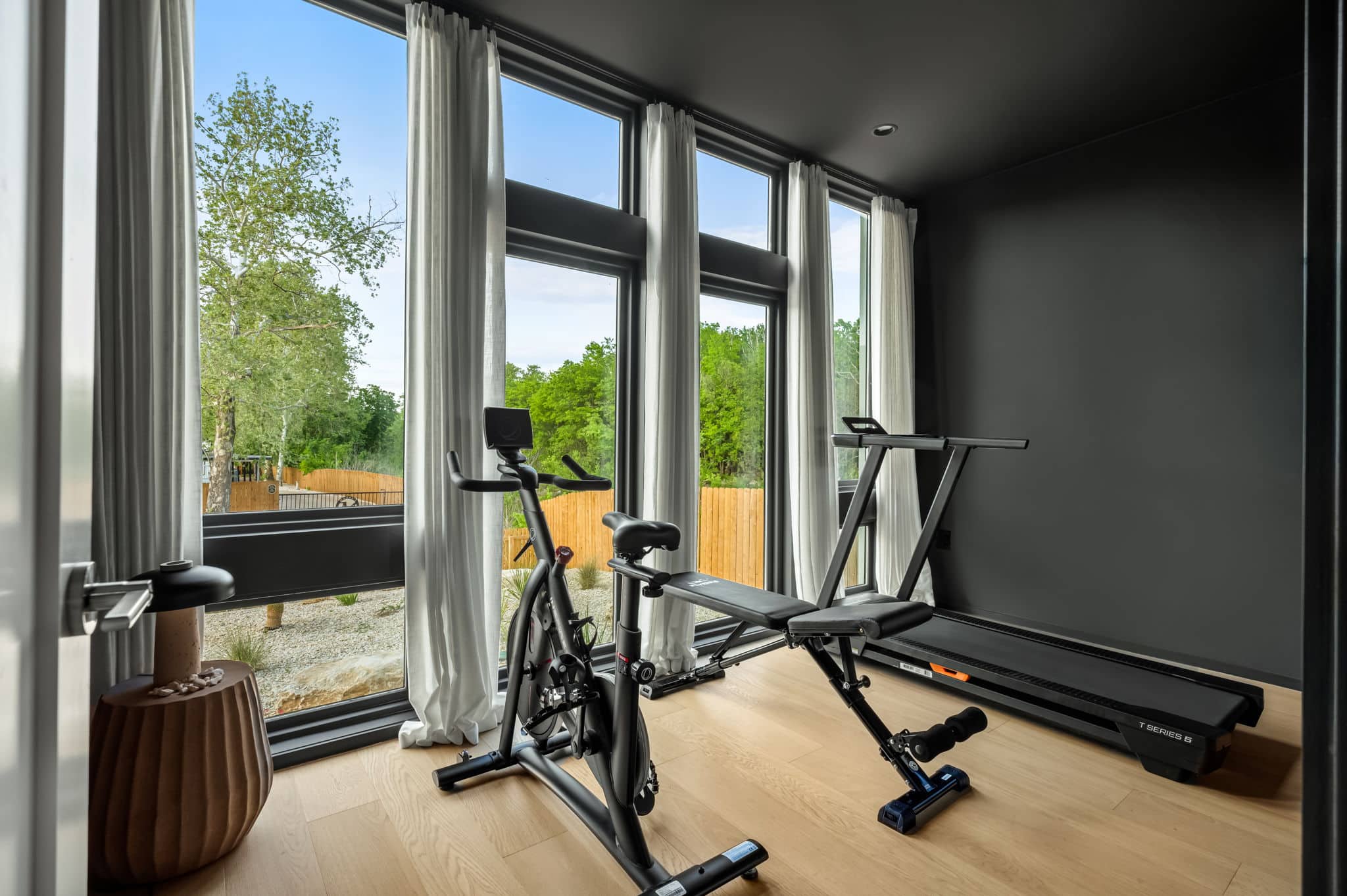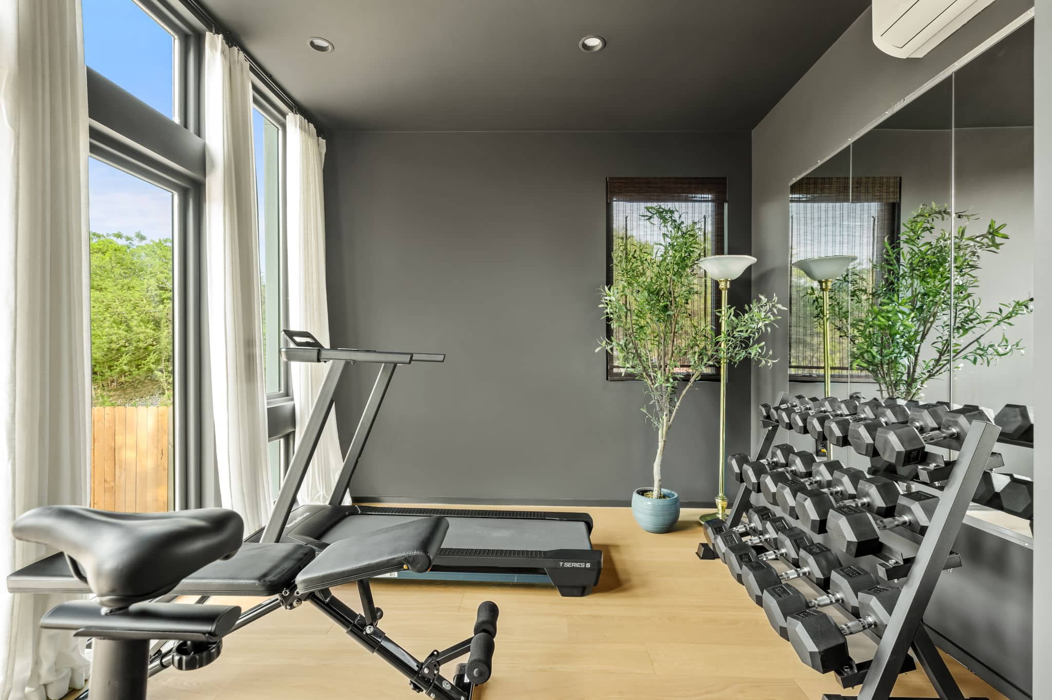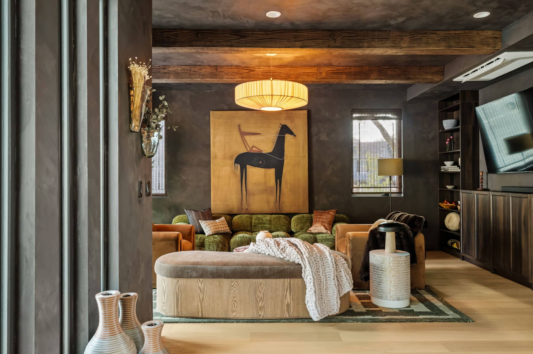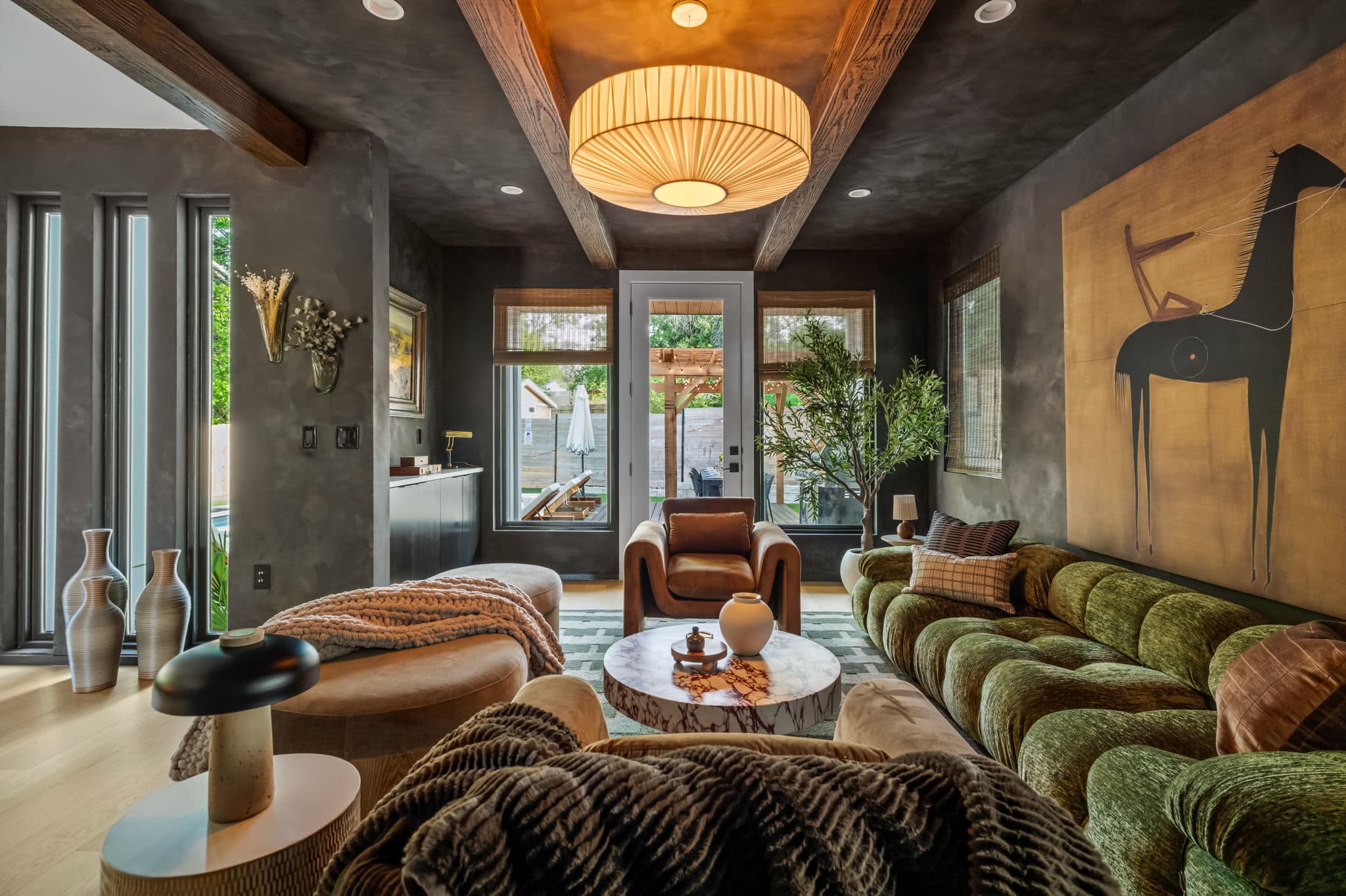 The ground floor flows naturally from front to back. Just past the entry you’ll find a half bath, laundry room and the private gym – equipped with a treadmill, spin bike, adjustable bench, and a full dumbbell rack. Beyond that, the fully-equipped chef’s kitchen opens into the dining area and living room, where a sculptural green velvet sectional, cognac leather chairs, a veined marble coffee table, and a massive gold equestrian canvas set the tone. The living room opens directly to the backyard – heated pool, hot tub, and the cheetah mural wall are right there.