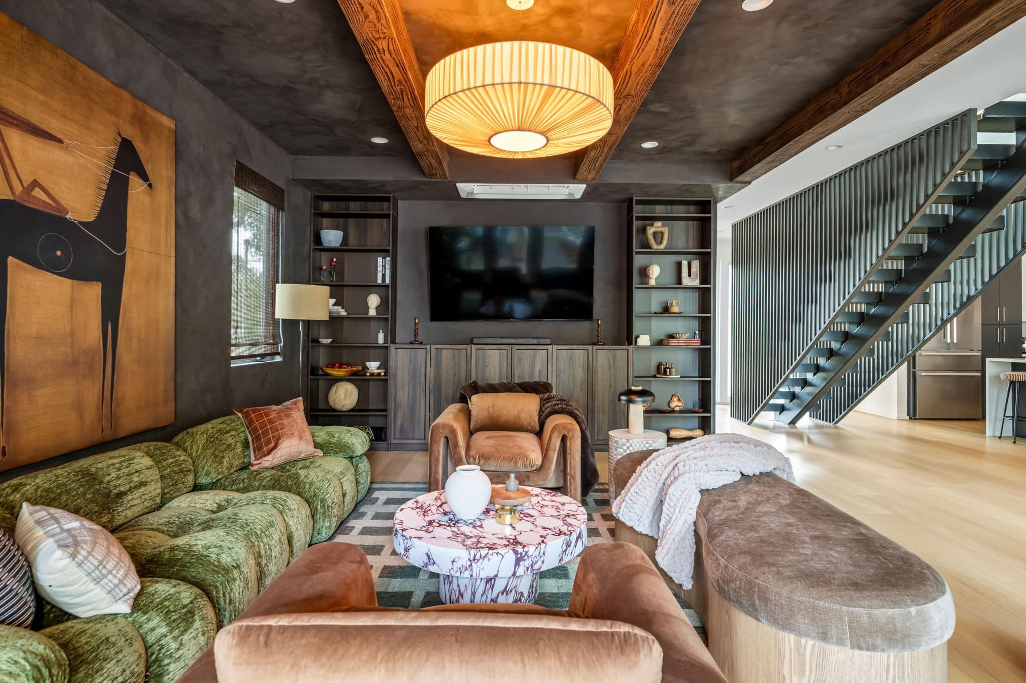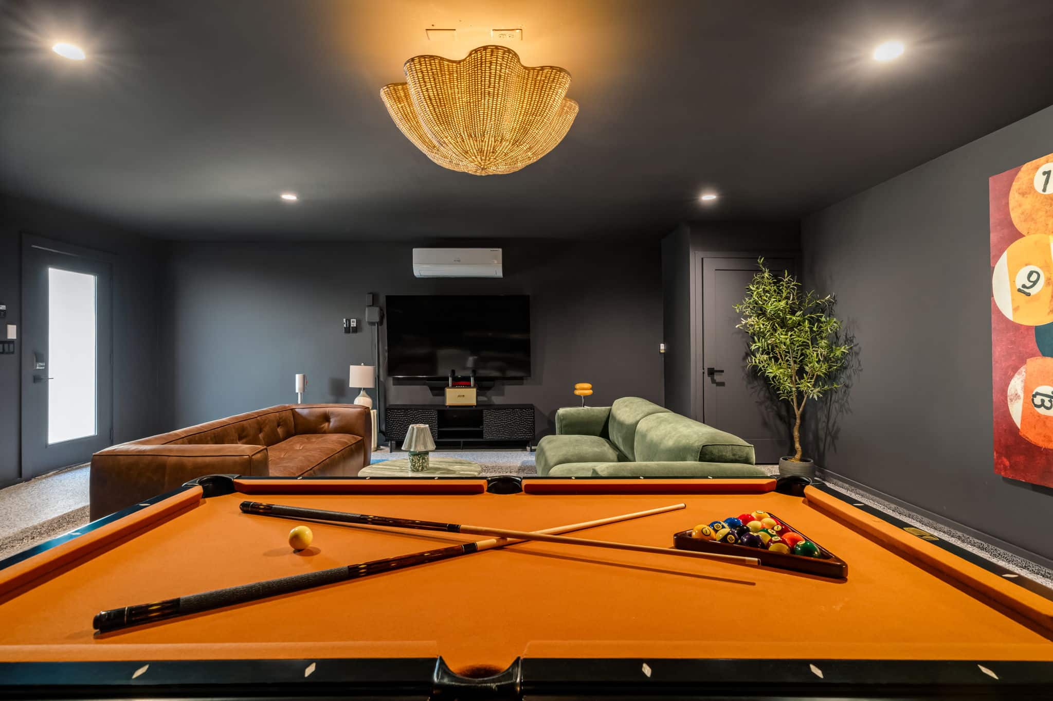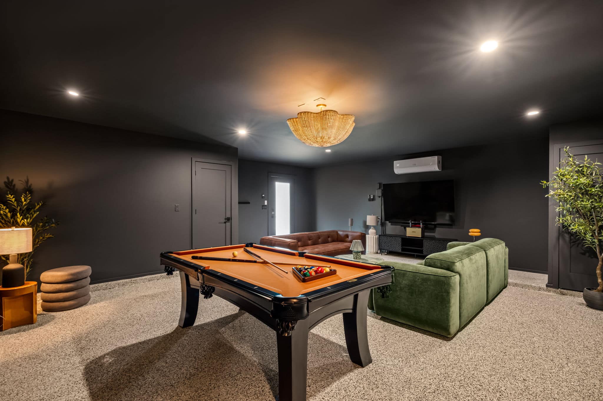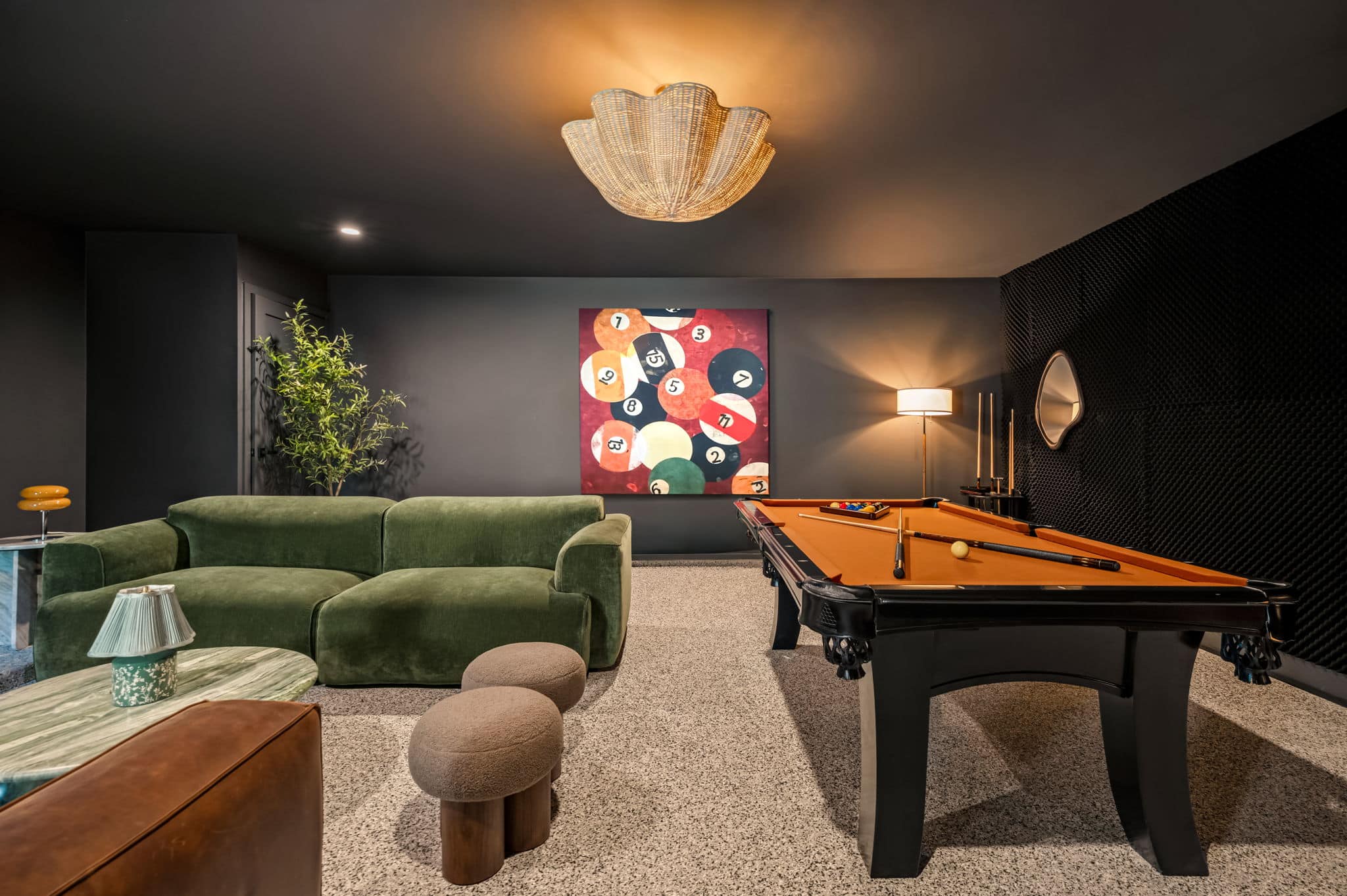 The ground floor of the second building houses the game room – a moody, designer lounge with a full-size pool table, flat screen TV, green velvet sectional, cognac leather sofa, and a sculptural marble coffee table. It’s a private club, not a game room.
