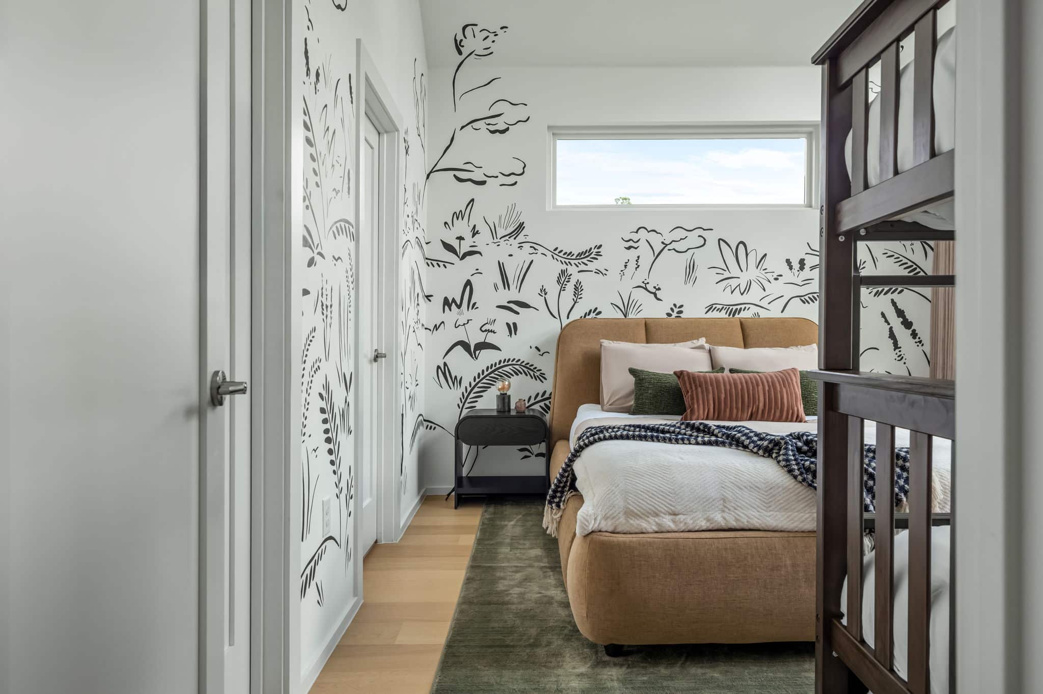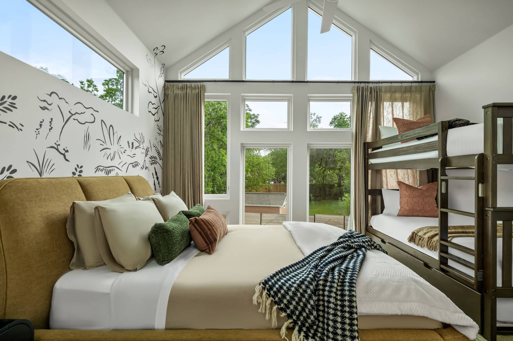 Guest Bedroom 1 features a queen bed and a twin-over-twin bunk beneath soaring ceilings and a hand-drawn botanical mural wall – sleeping up to 4.