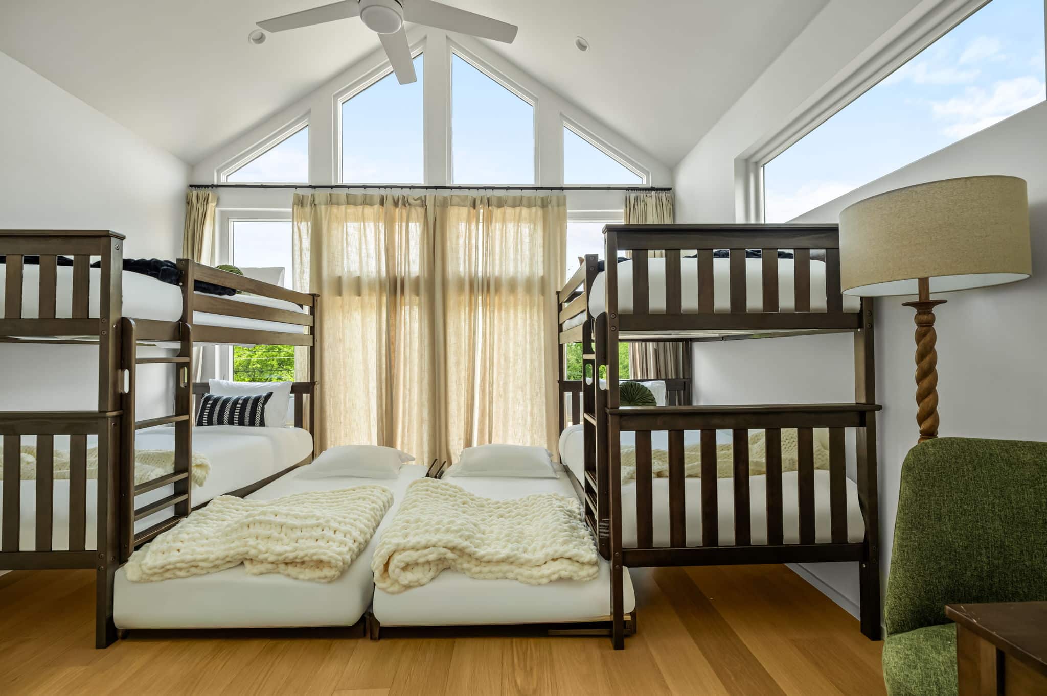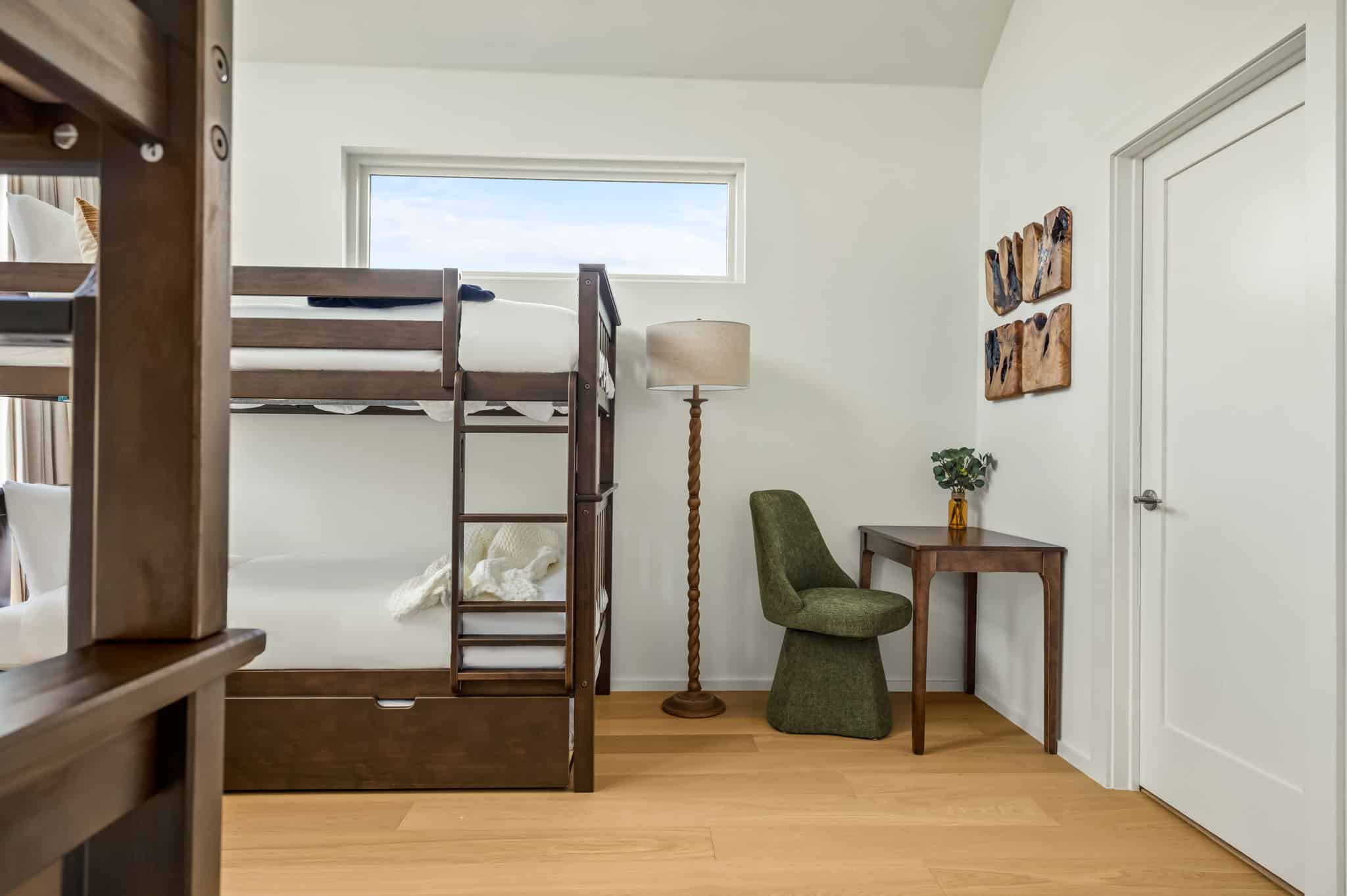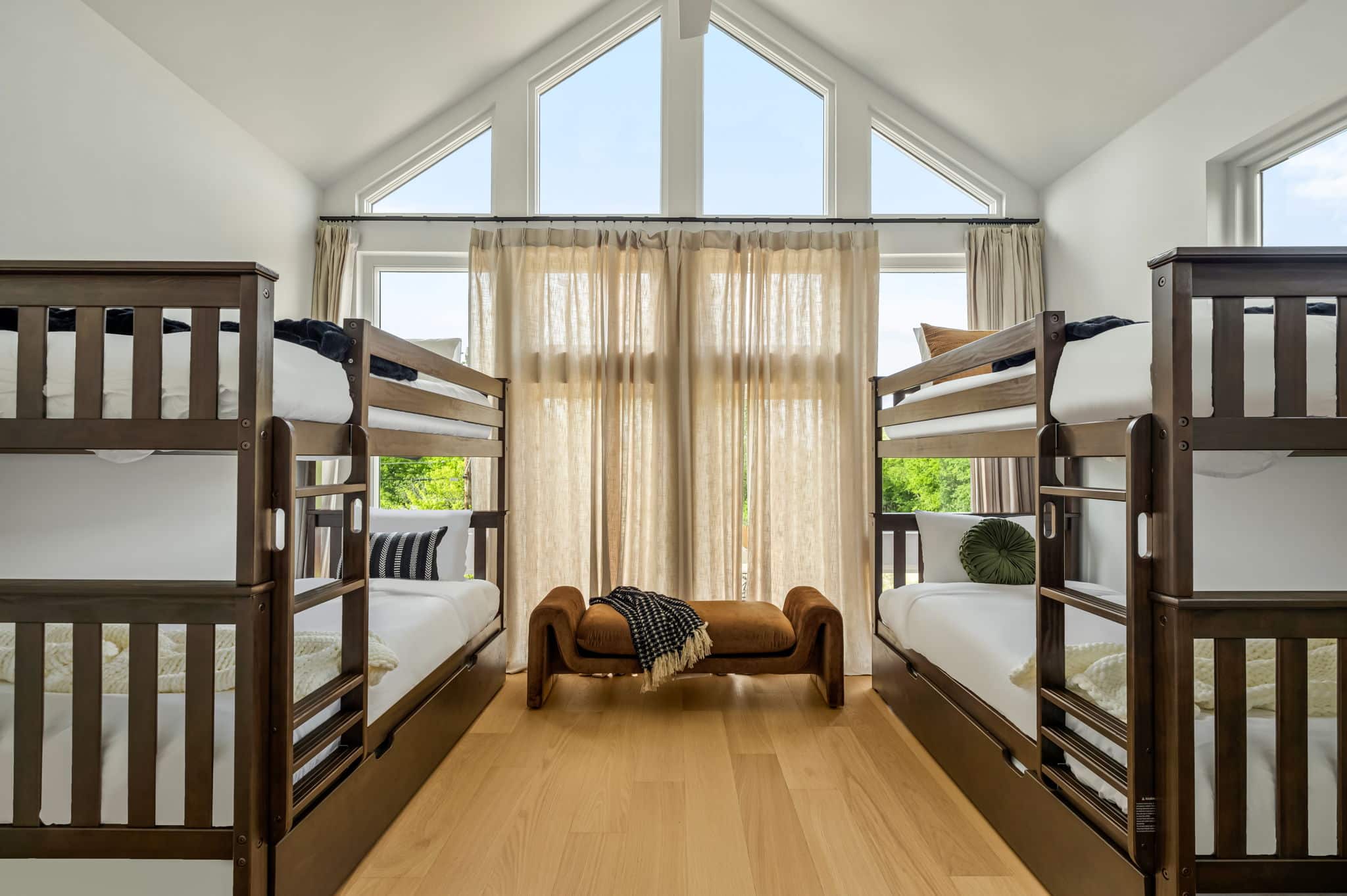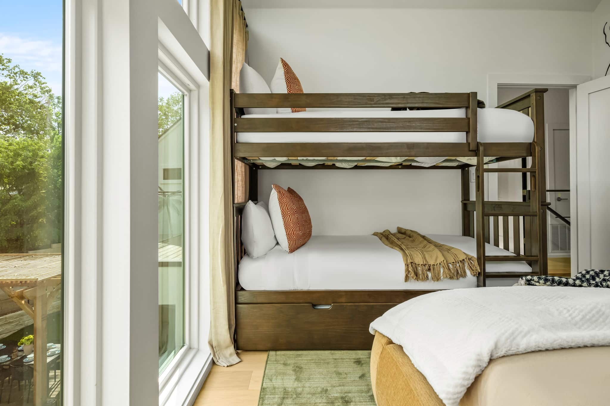 Guest Bedroom 2 is the bunk room – two twin-over-twin bunk beds with trundles offering 2 additional twin beds beneath floor-to-ceiling windows, sleeping up to 6. Both guest bedrooms share a beautifully appointed full bath.
