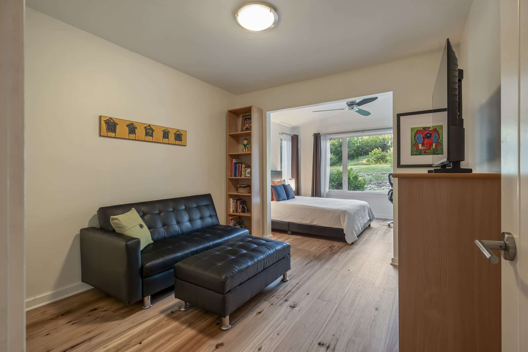 Enjoy the entire property during your stay, featuring a spacious 3-bedroom, 2-bath main home plus a private studio guest house. Perfect for groups who want to be together but still have extra space and privacy, this pet-friendly retreat offers multiple outdoor seating areas, a BBQ grill, and hammock. Backing onto 50 acres of greenery and only 15 minutes from downtown Austin, it’s the ideal spot to relax, connect, and enjoy open-air Texas living.