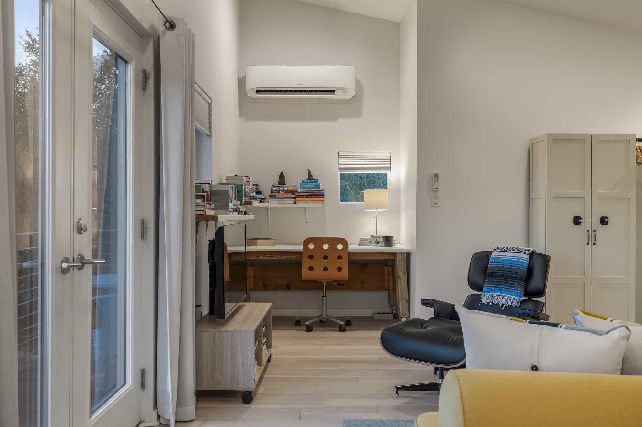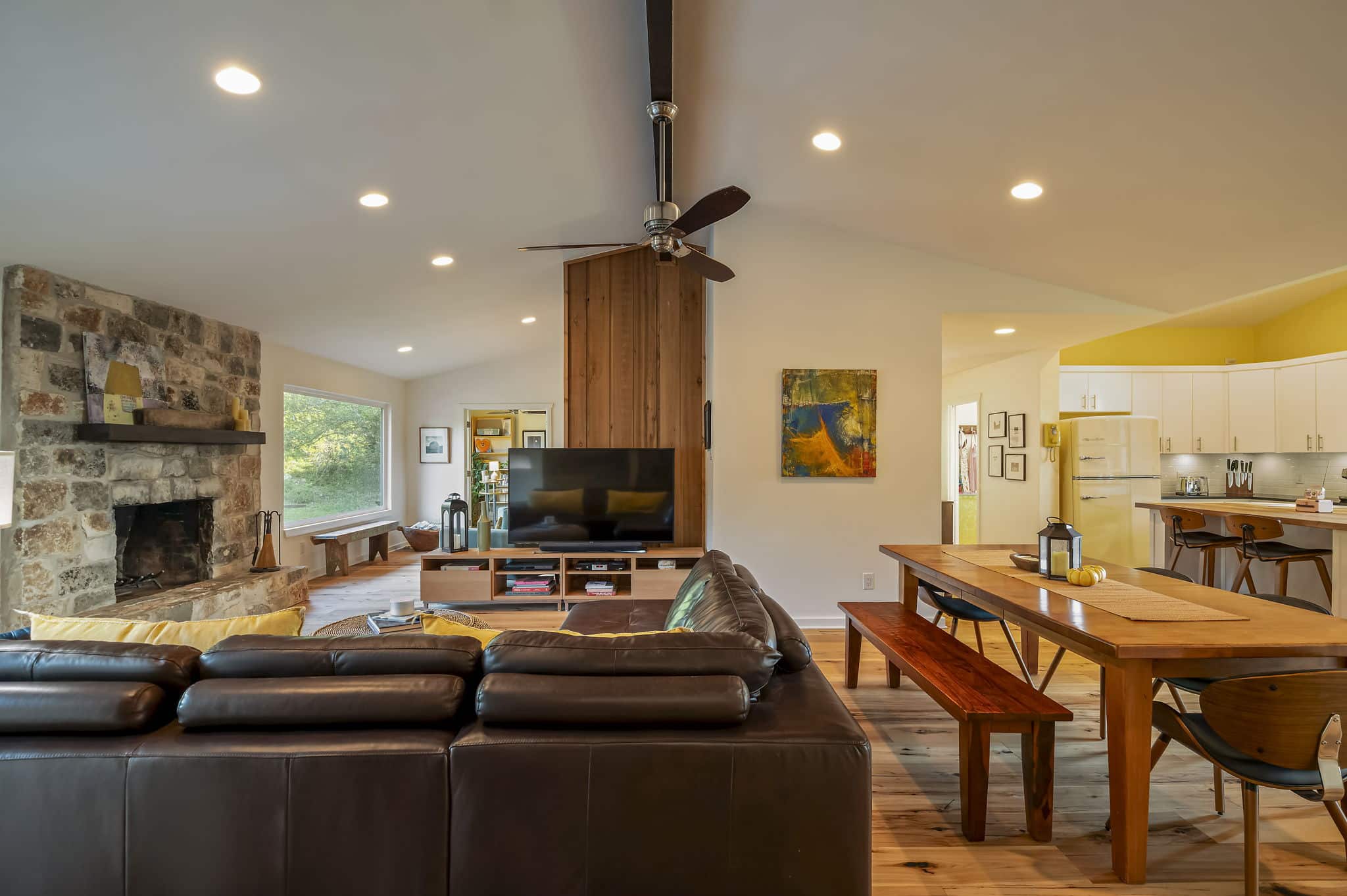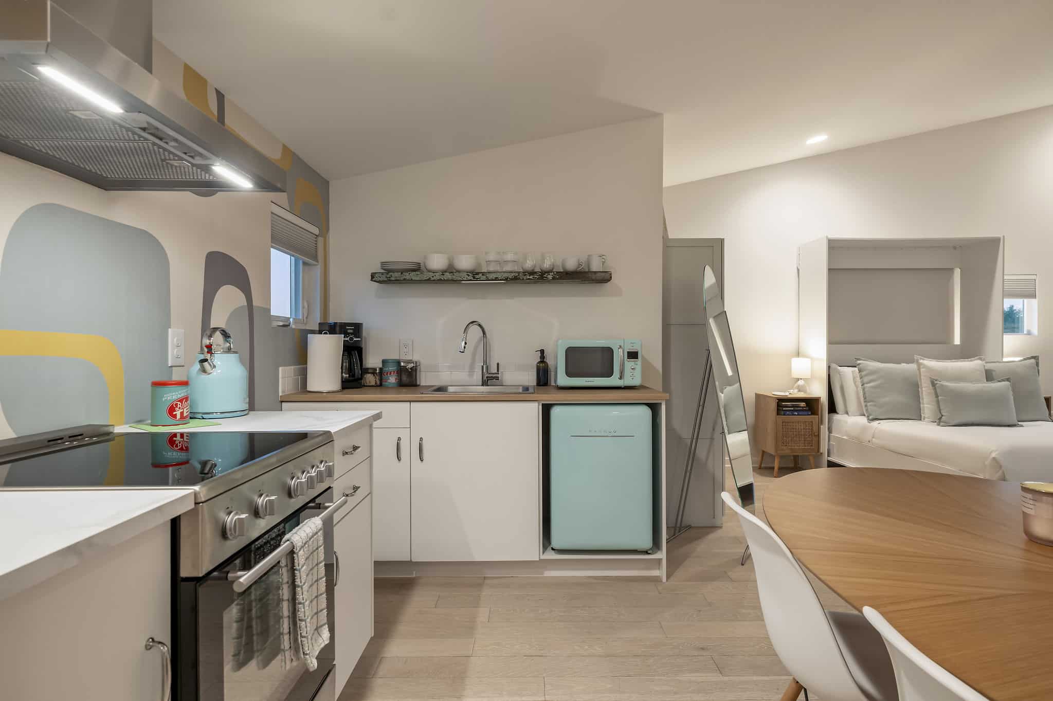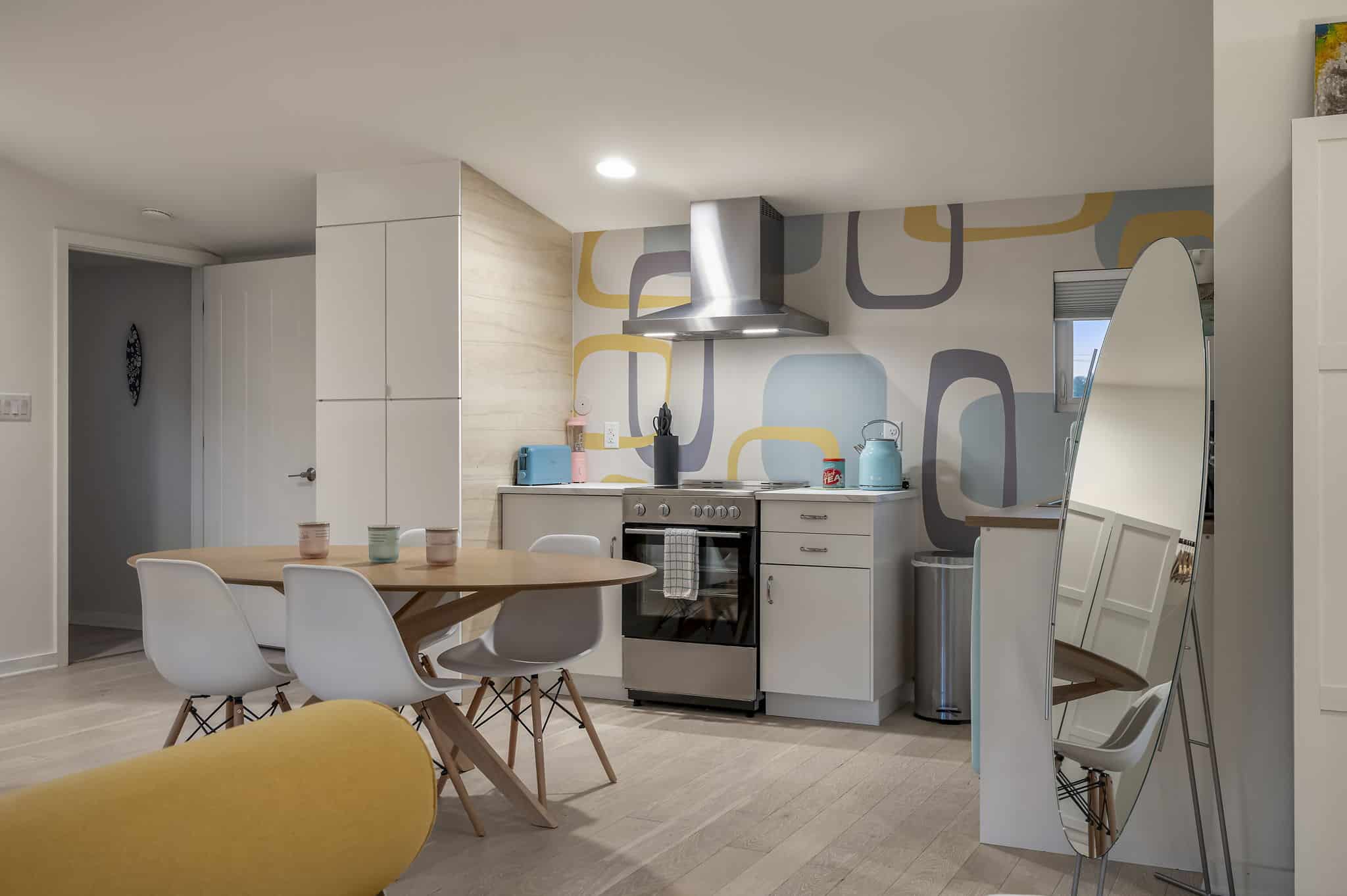 The 3-bedroom, 2-bath home offers a bright open living area with large windows, a leather sectional, and mid-century chairs. The retro-inspired kitchen features a vintage-style refrigerator, modern appliances, and a central island for casual dining. The primary bedroom has an ensuite bath with a walk-in shower and soaking tub, while 2 additional bedrooms share a second full bath. A separate office provides a quiet place to work or create.