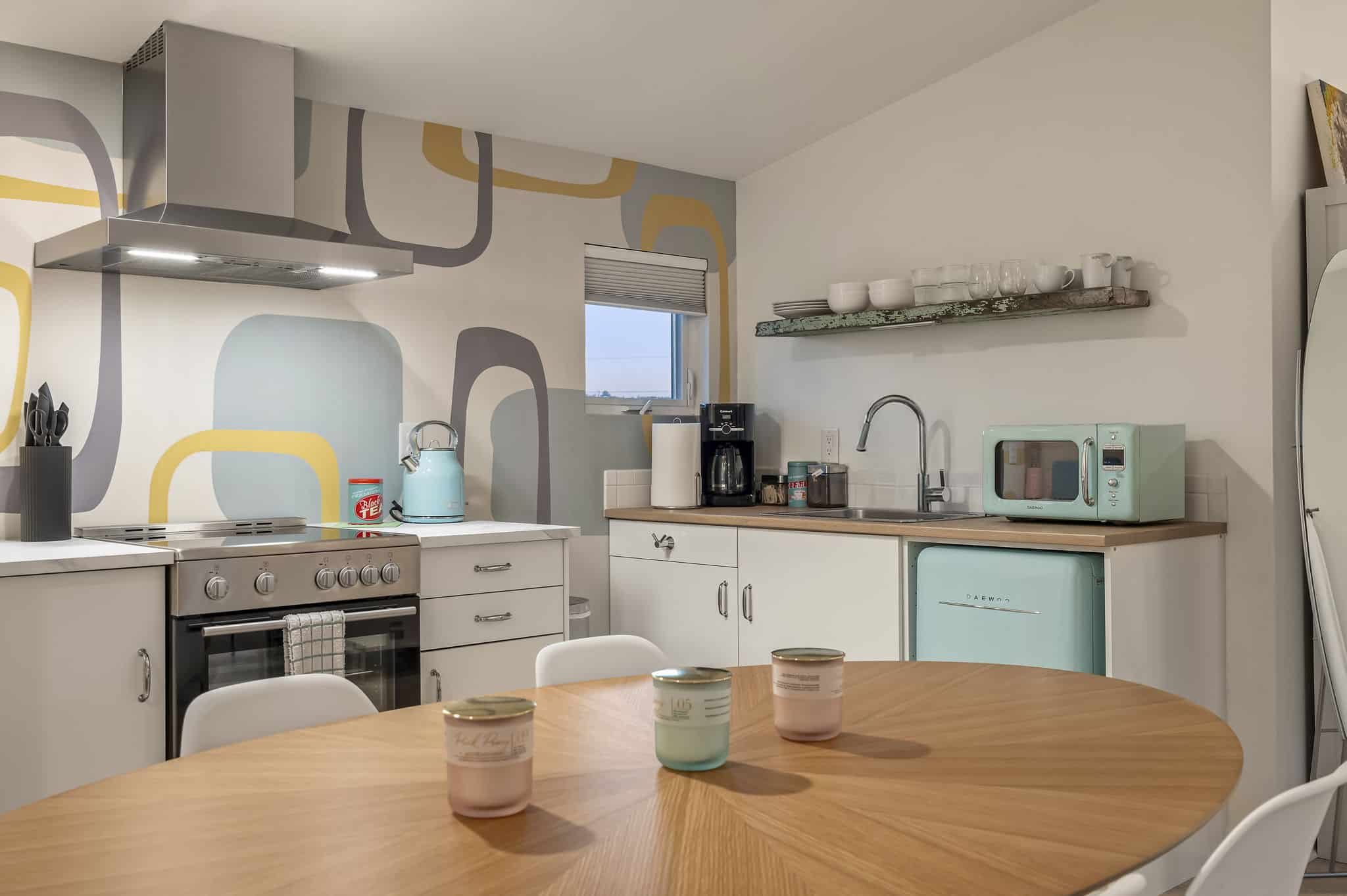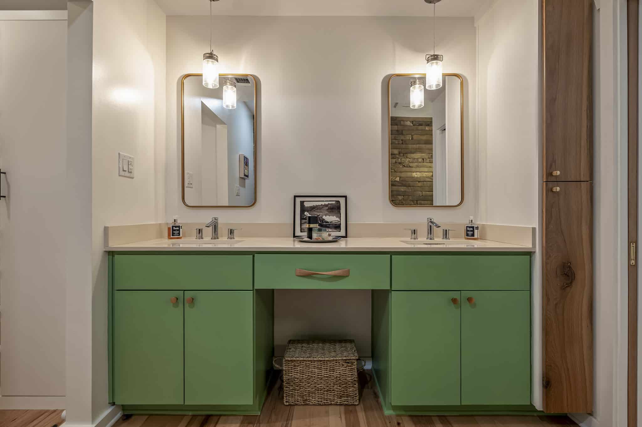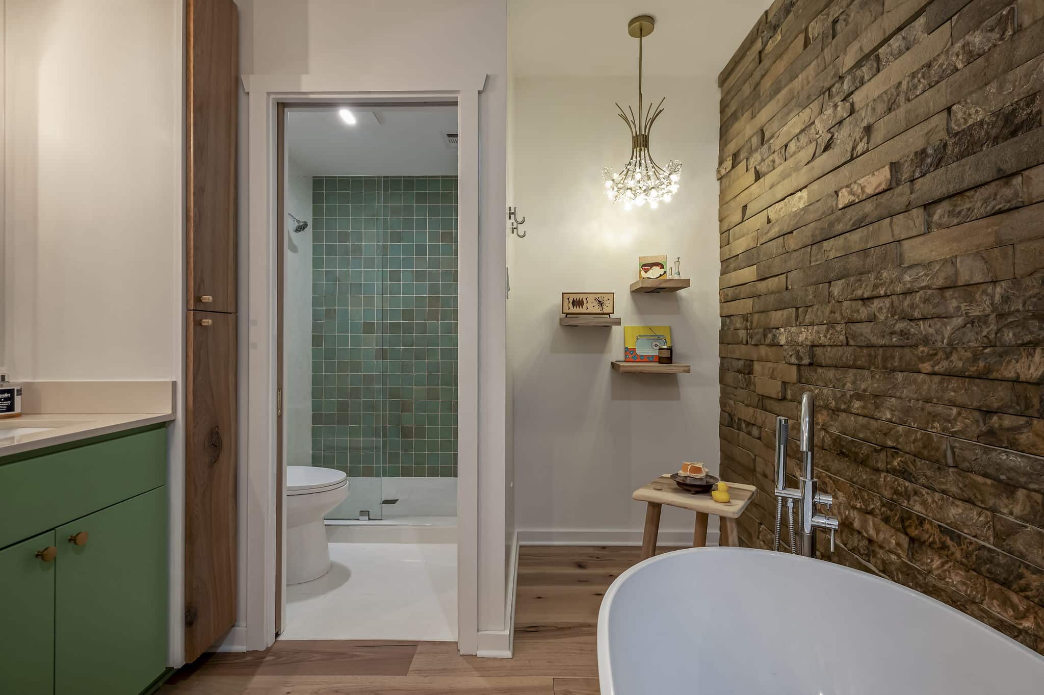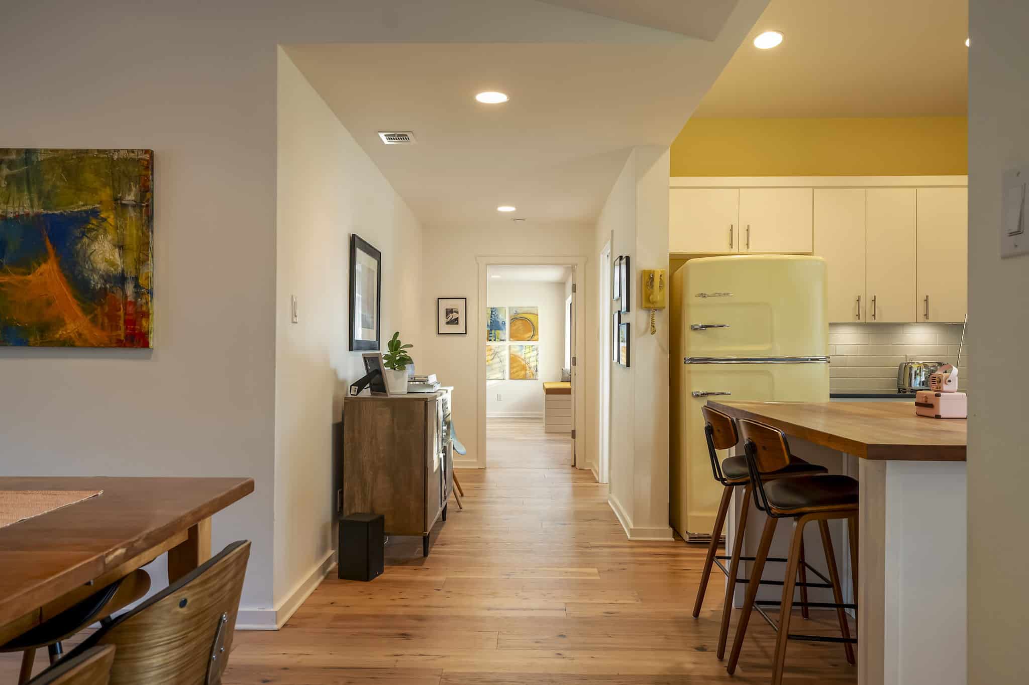 The 3-bedroom, 2-bath home offers a bright open living area with large windows, a leather sectional, and mid-century chairs. The retro-inspired kitchen features a vintage-style refrigerator, modern appliances, and a central island for casual dining. The primary bedroom has an ensuite bath with a walk-in shower and soaking tub, while 2 additional bedrooms share a second full bath. A separate office provides a quiet place to work or create.
