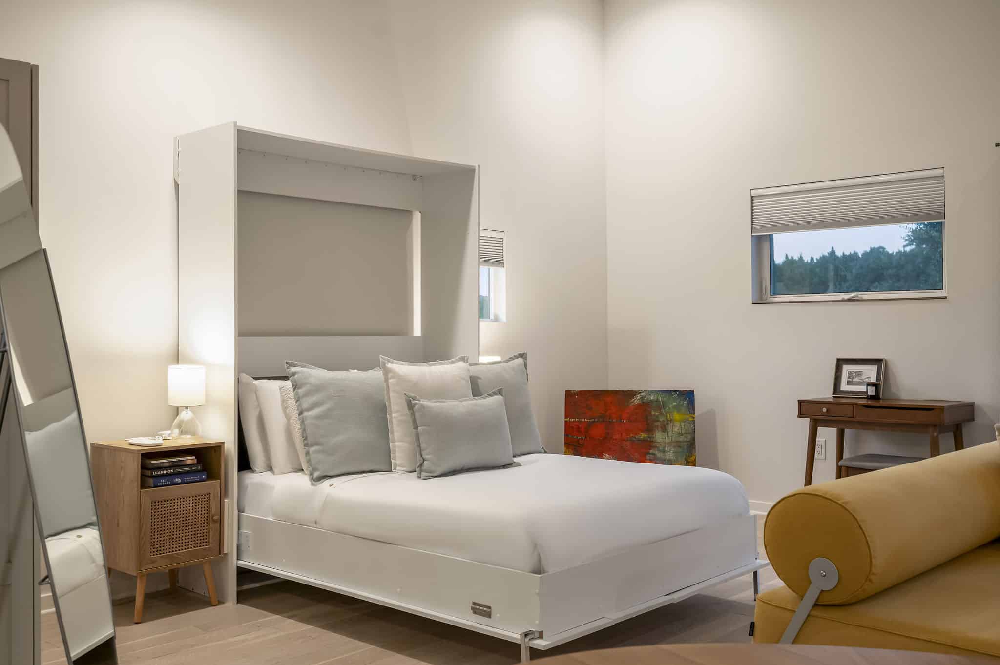 Located in its own separate building with a private entrance, the second-floor studio features a Murphy bed, a futon, and a balcony with treetop views. The kitchenette includes a mini-fridge, microwave, sink, and coffee maker, while the bathroom offers a walk-in shower.