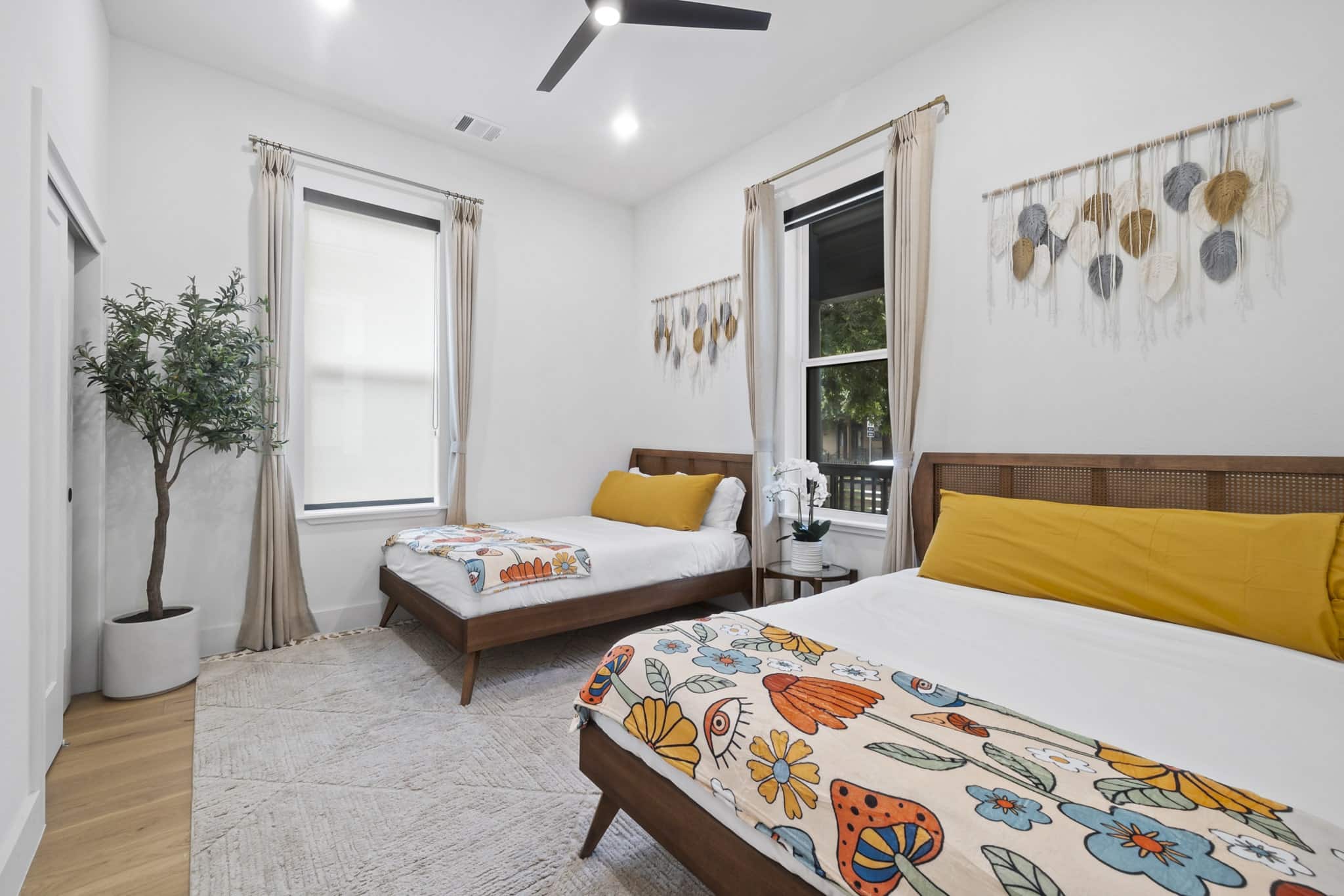 The home features 3 thoughtfully appointed bedrooms, one of which includes two beds to accommodate additional guests or family members. Each room is a peaceful retreat, promising restful nights after exploring the city’s vibrant offerings. The residence also boasts two full bathrooms, providing convenience and privacy for all guests.