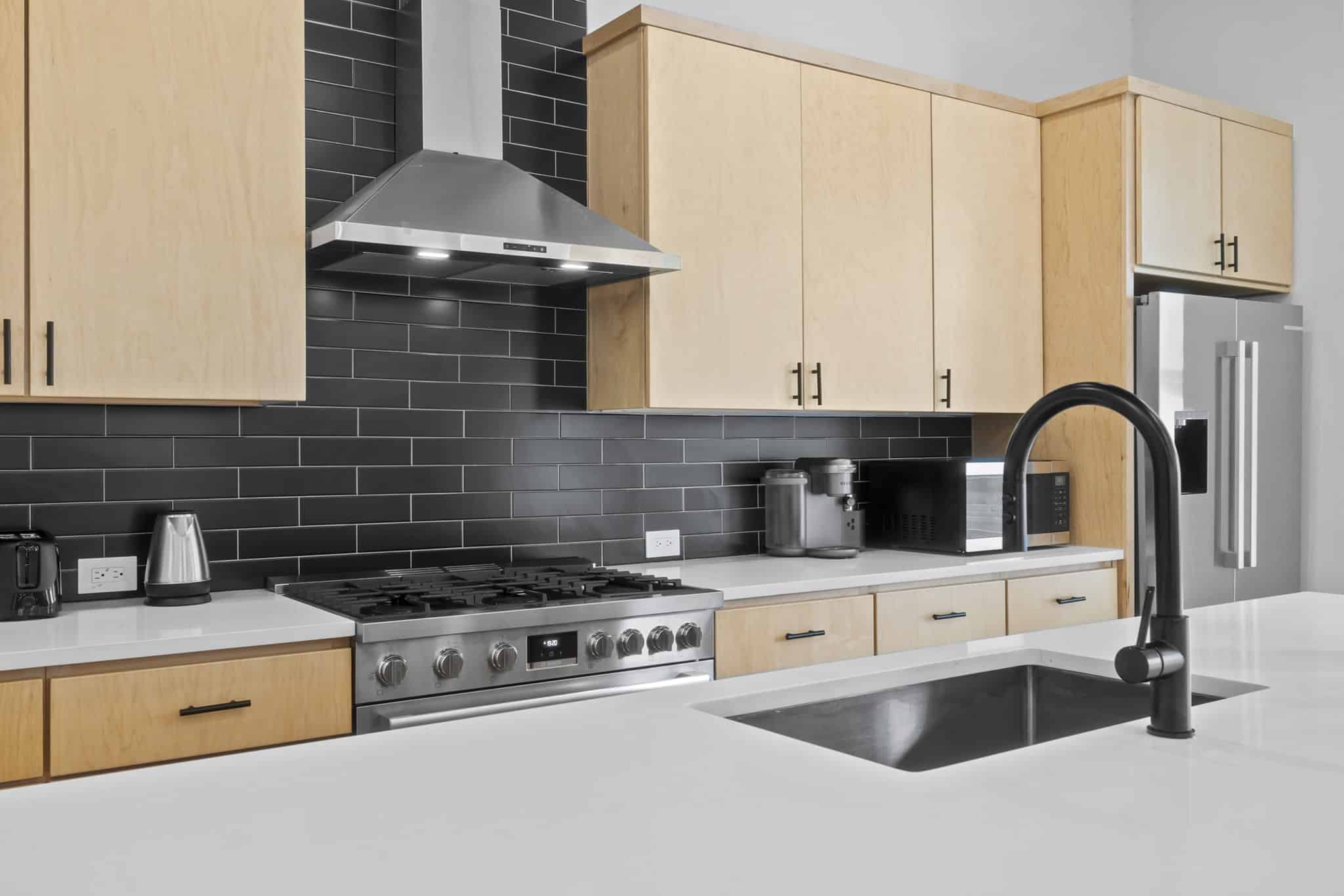 The inviting living room welcomes you, offering a regular couch and a sleeper couch, making it the perfect spot for relaxation or social gatherings. Sunlight filters through the windows, illuminating the space with a warm, natural glow. The open-concept layout leads you to a fully-equipped kitchen, where you can craft meals with ease, surrounded by modern amenities and stylish finishes.