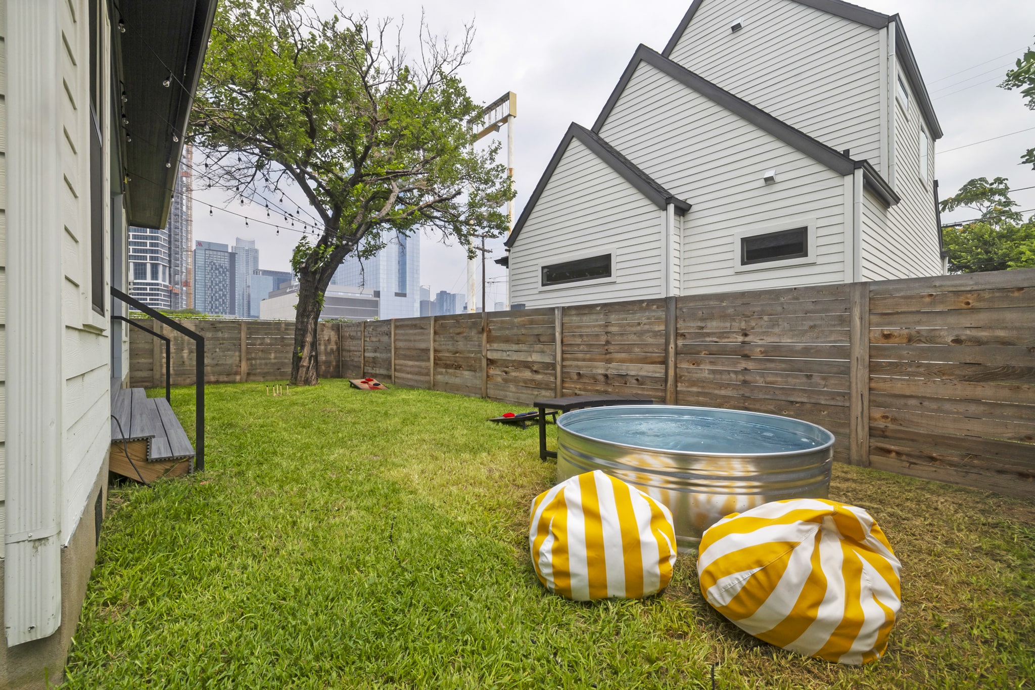 Step outside to discover a fenced backyard, an oasis in the city. Enjoy a refreshing dip in the unique cowboy pool, perfect for cooling off after a day of adventure. This private outdoor space invites you to enjoy serene mornings with a cup of coffee or unwind in the evenings under the stars.