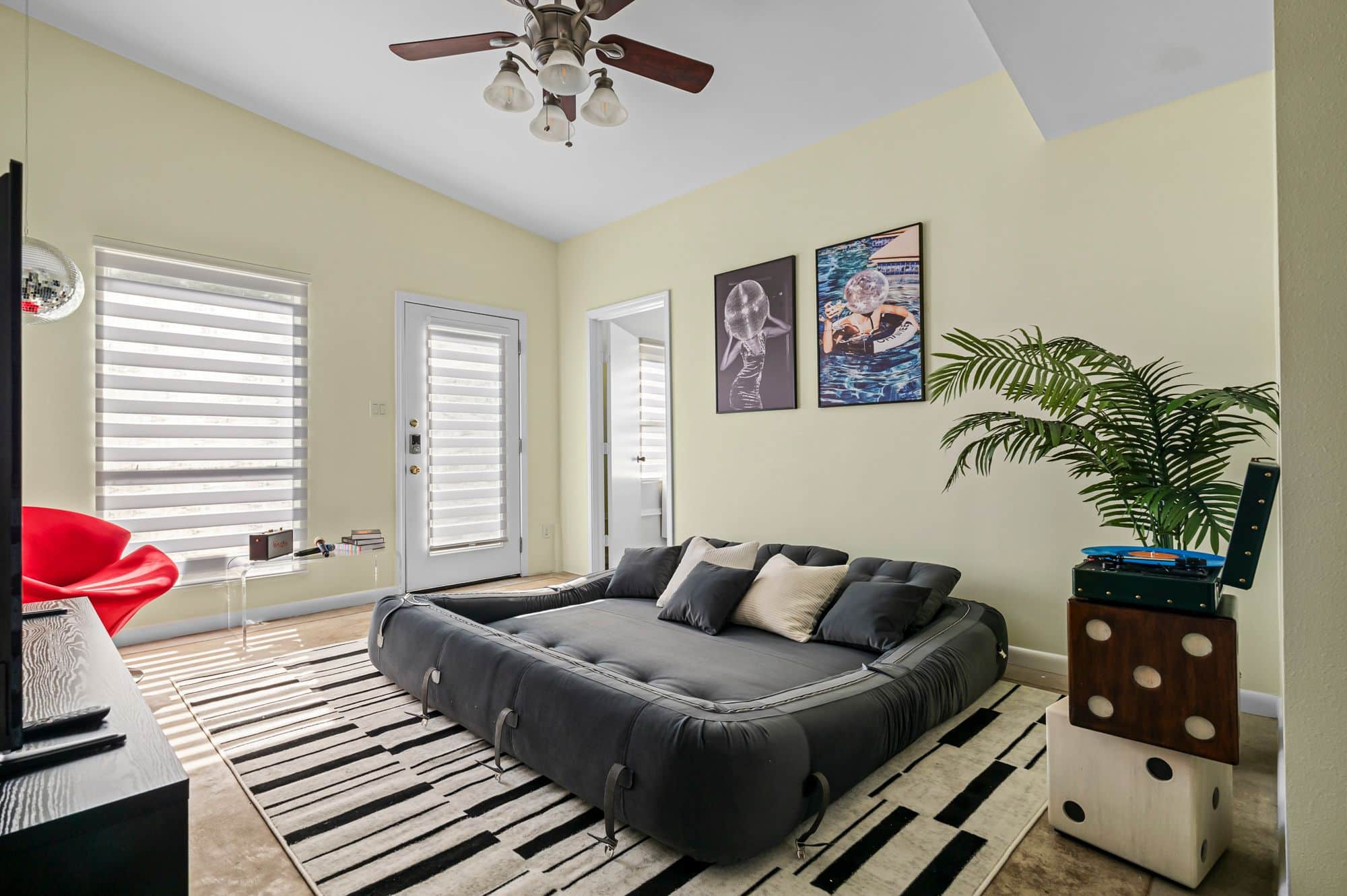Take a couple of steps down and you’ll arrive at the home’s true centerpiece: the main living room. This is where the retro music theme shines. A 60s-inspired couch (which doubles as a queen-size sleeper) invites you to kick back while a record player spins vinyl nearby. With a karaoke machine (complete with 2 mics), a disco ball, and a bold red chair, this room is designed for fun and lively gatherings—whether you’re reliving old hits or creating new memories.
