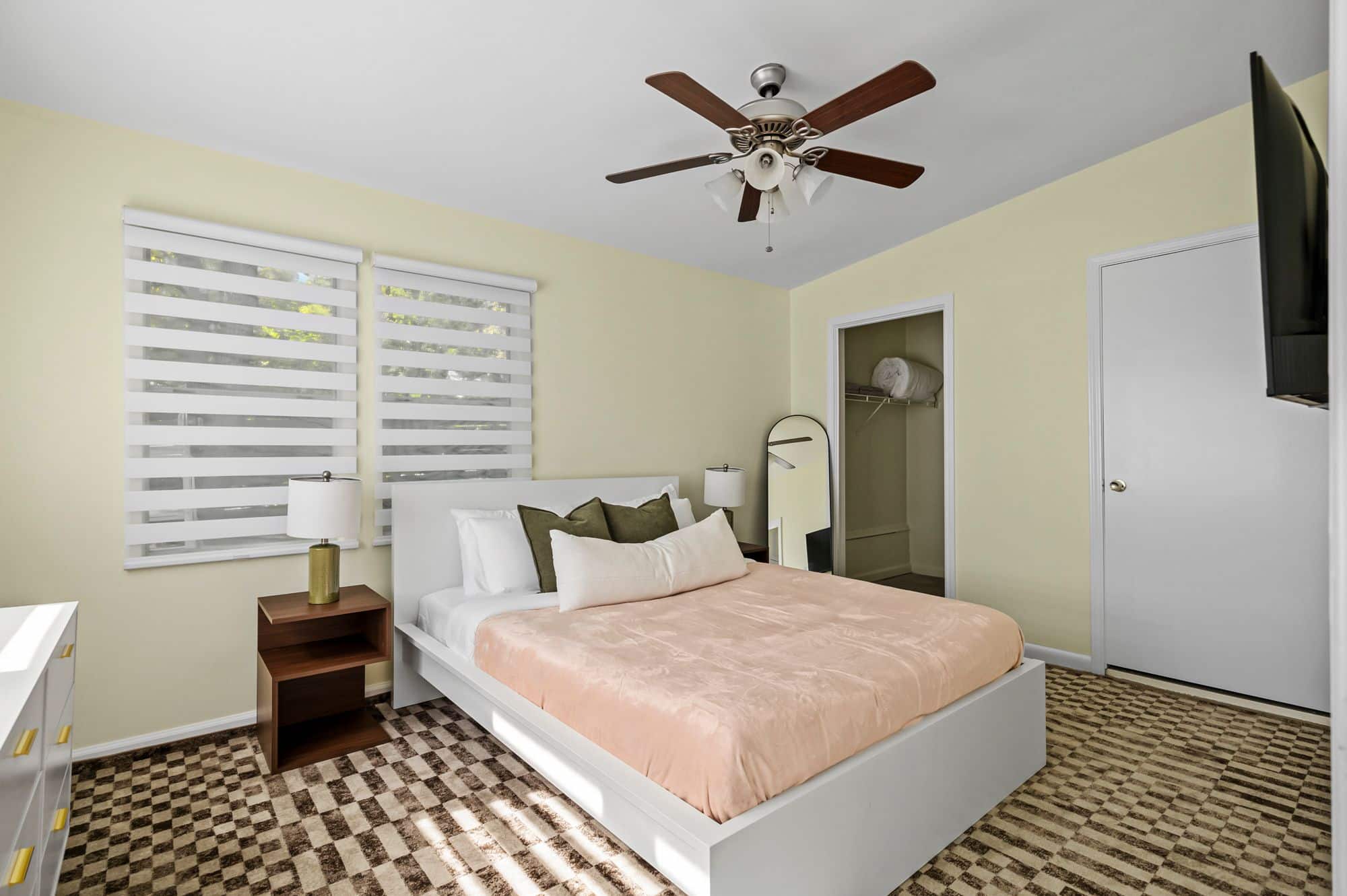 Tucked just off this space is the master bedroom, offering a queen bed, TV, and an ensuite bathroom for extra privacy and comfort.