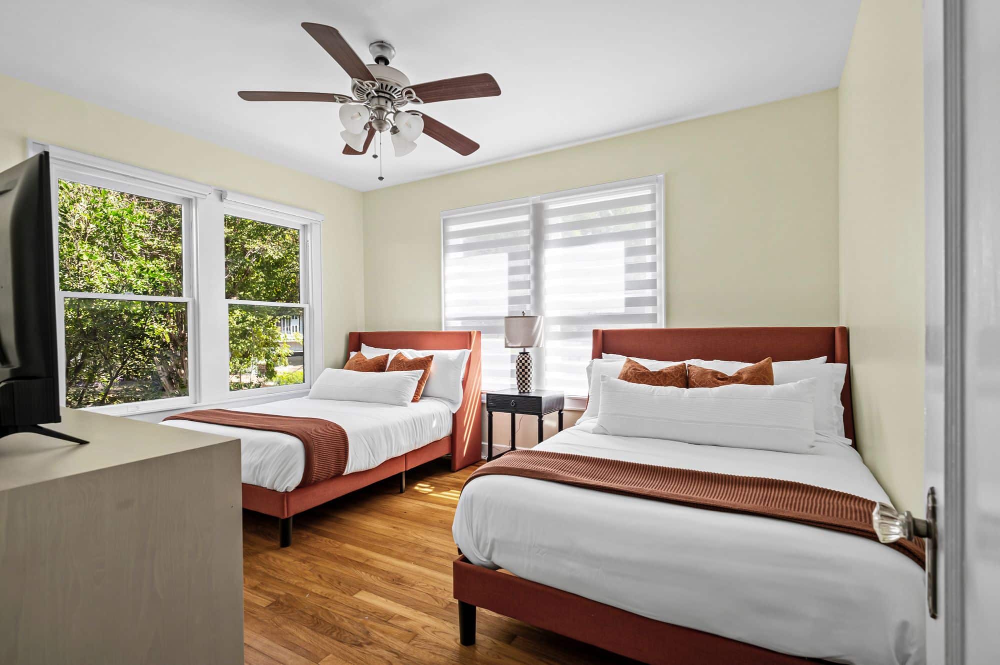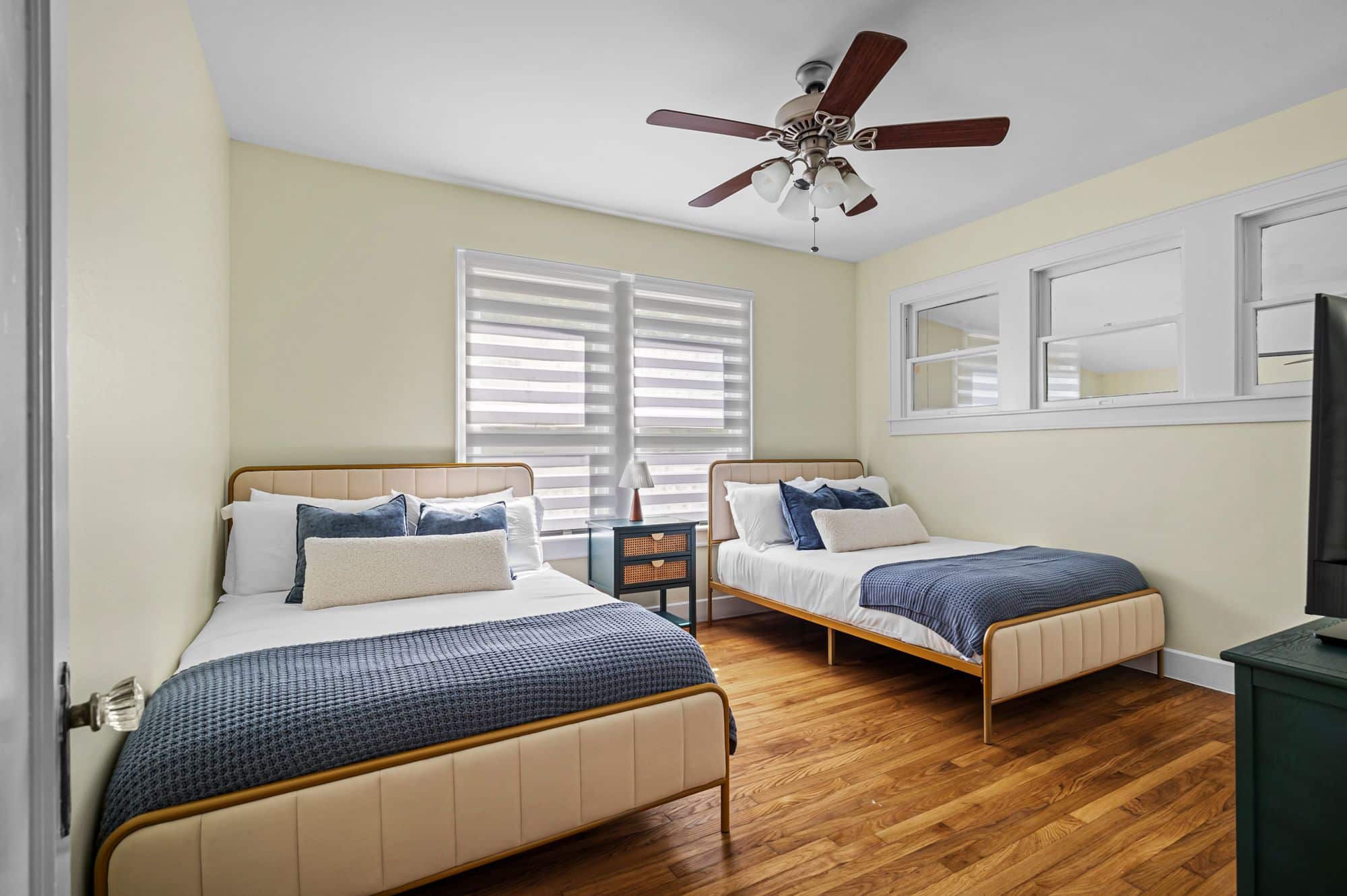 Just off the dining room is the kitchen, a nostalgic nod to the past with all the modern conveniences. It’s fully equipped with everything you need, including a coffee machine to fuel your Austin adventures. Down the hall, you’ll find the guest bathroom and two welcoming guest bedrooms, each featuring 2 full beds and their own TVs—perfect for winding down in private after a busy day.