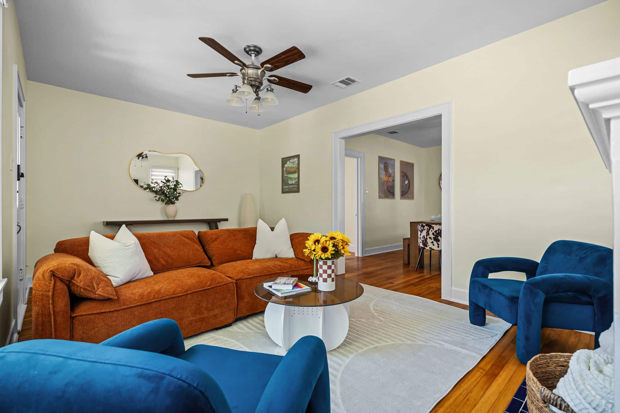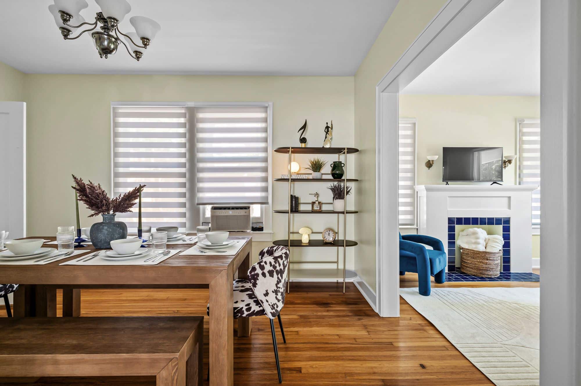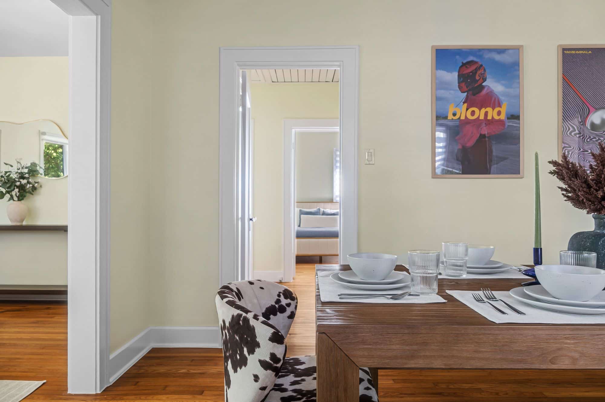 As you enter the home, you’re greeted by a bright, inviting living room that balances comfort and character. The plush couch and vibrant accent pieces set the tone, while the TV makes it easy to unwind after a day out. This space opens into the dining area, where cool chairs and cozy benches offer plenty of seating, surrounded by quirky, retro decor that adds a playful vibe to the space.