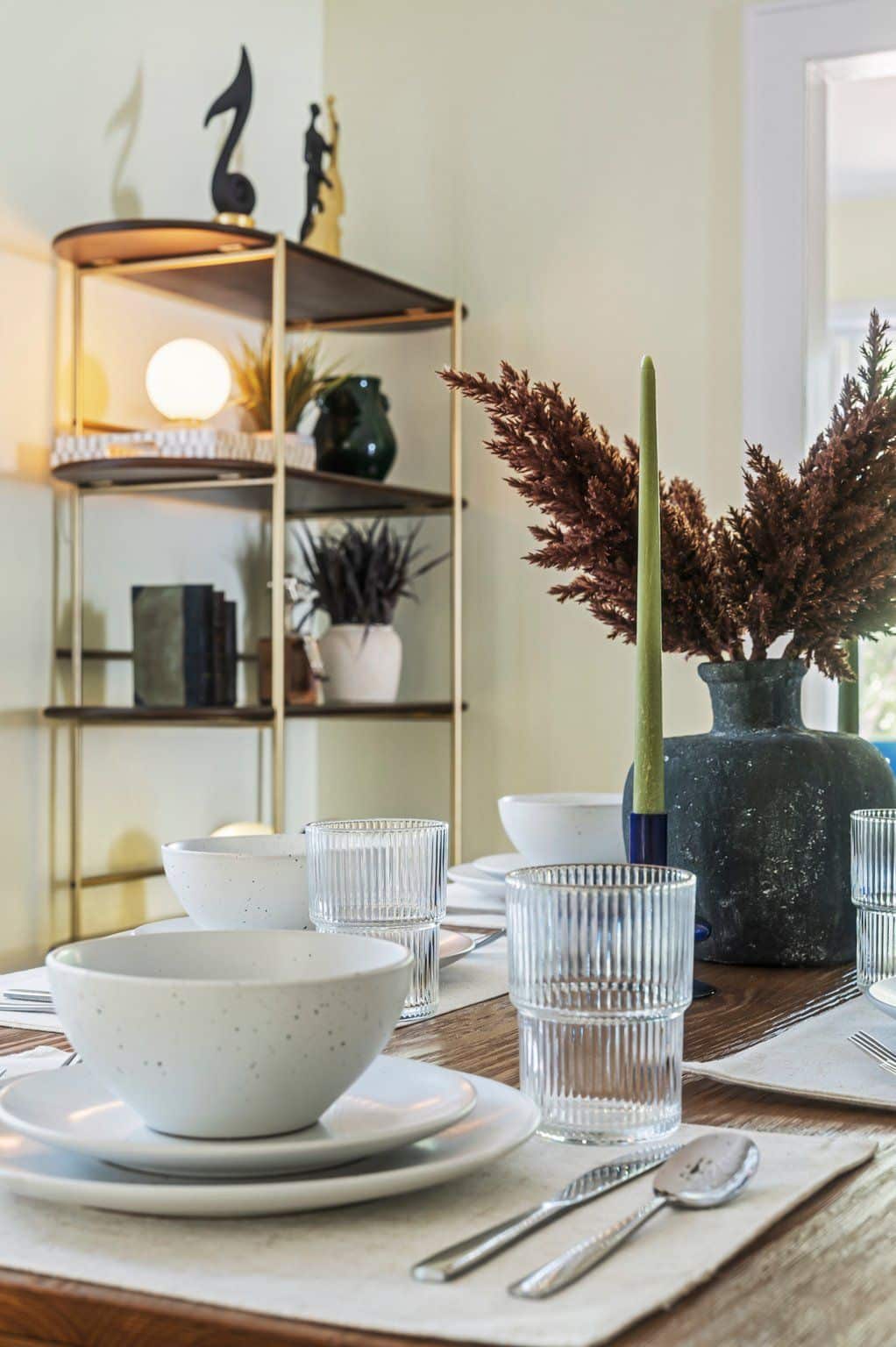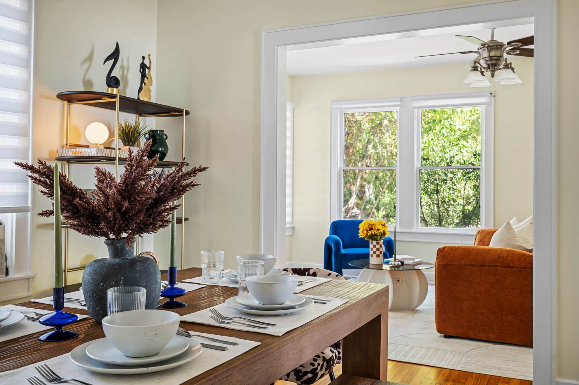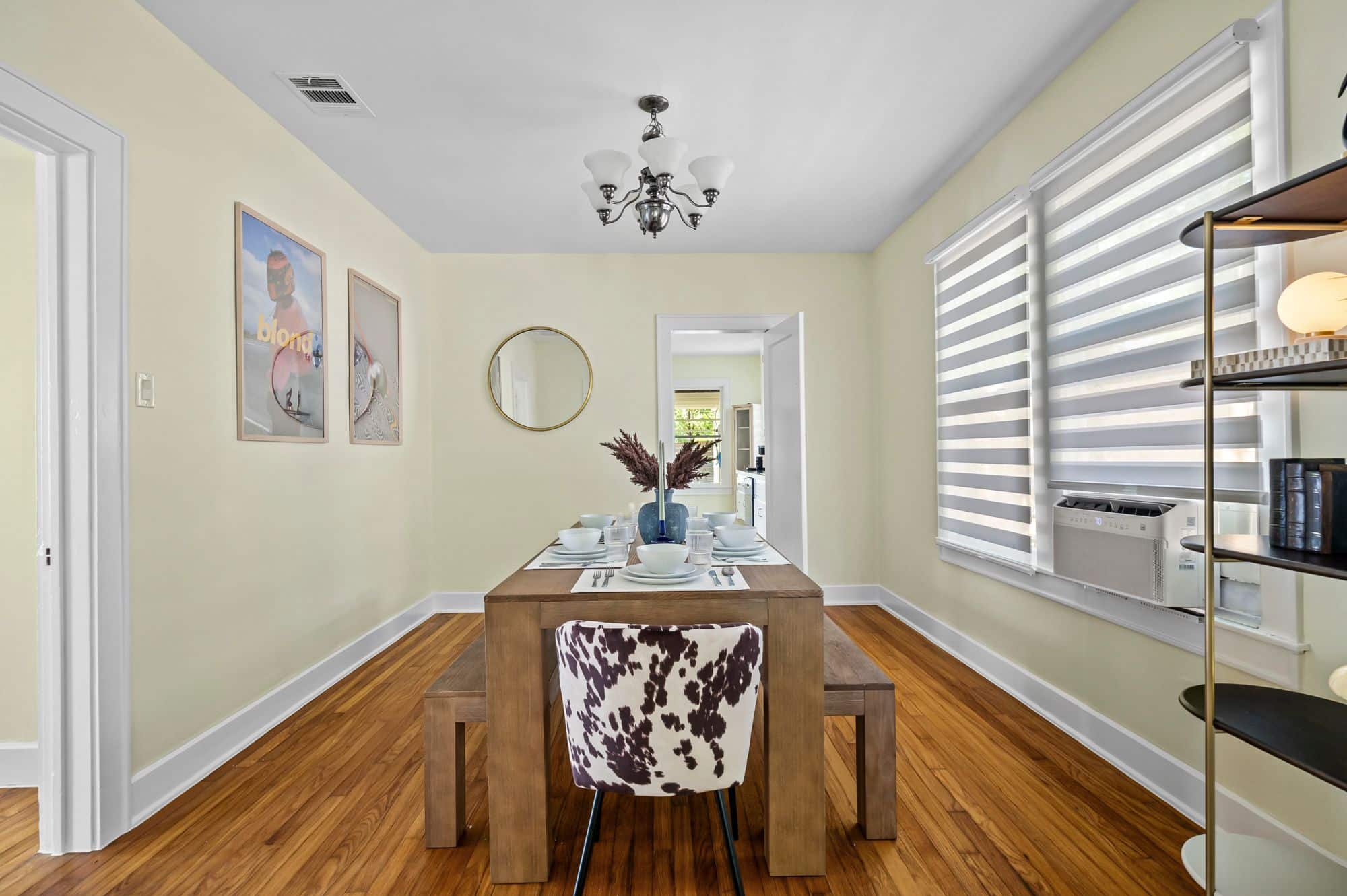 As you enter the home, you’re greeted by a bright, inviting living room that balances comfort and character. The plush couch and vibrant accent pieces set the tone, while the TV makes it easy to unwind after a day out. This space opens into the dining area, where cool chairs and cozy benches offer plenty of seating, surrounded by quirky, retro decor that adds a playful vibe to the space.