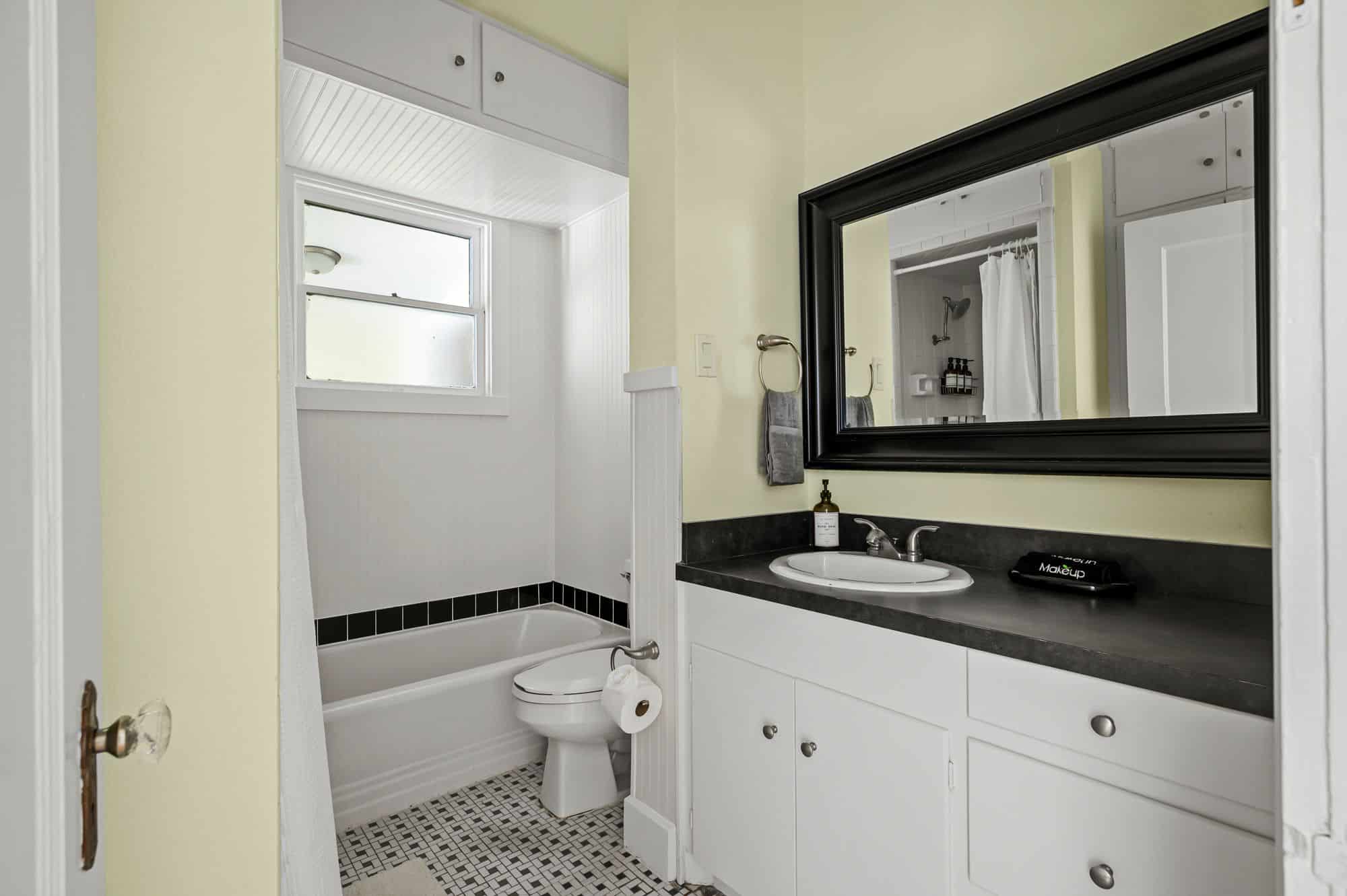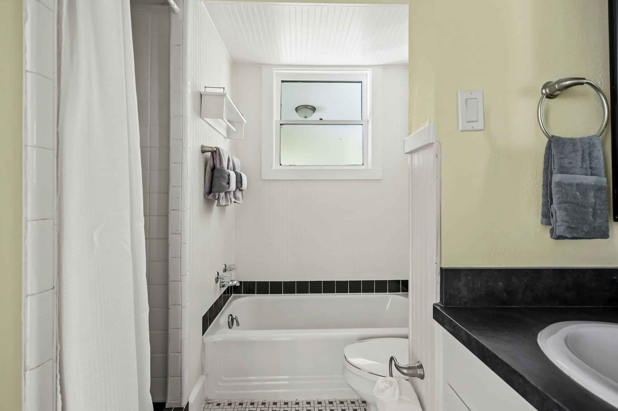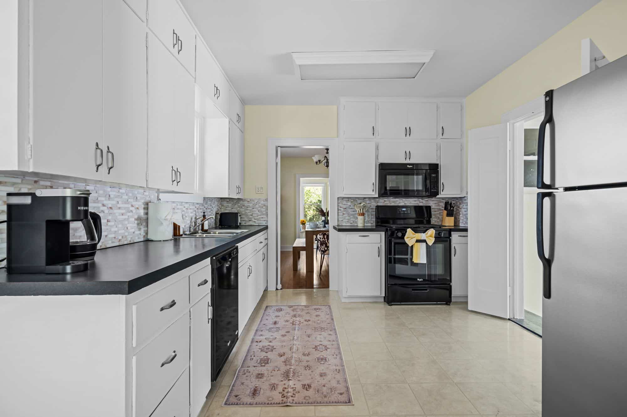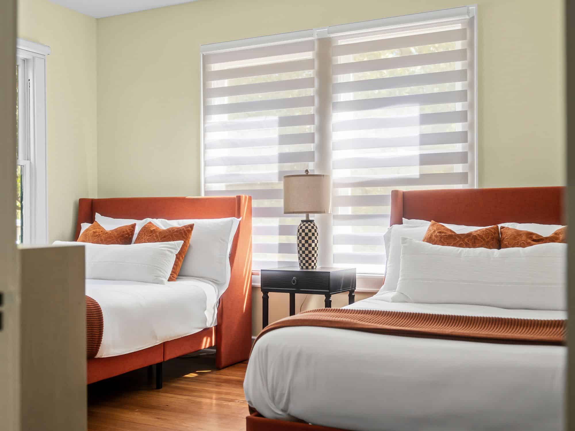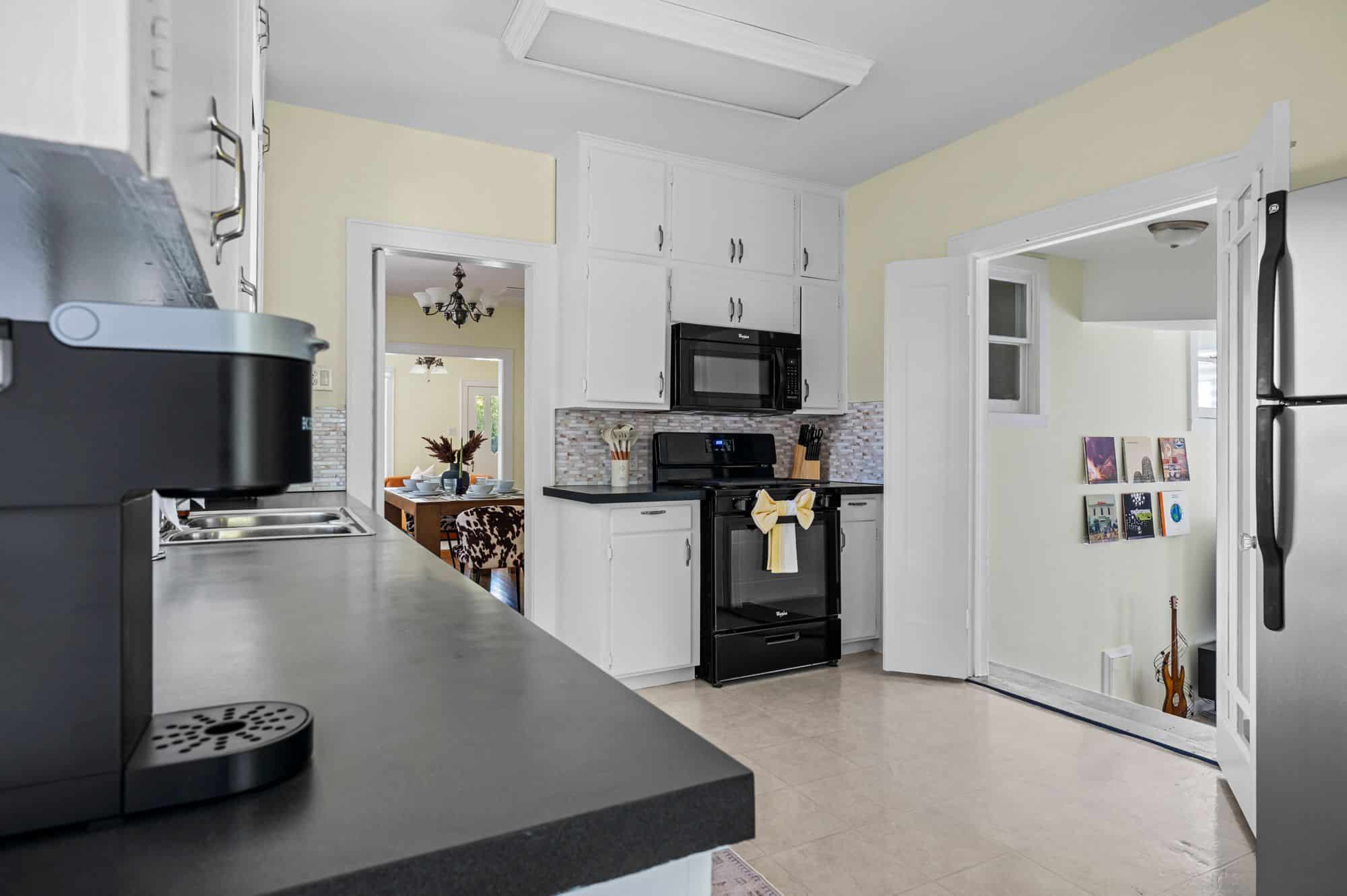 Just off the dining room is the kitchen, a nostalgic nod to the past with all the modern conveniences. It’s fully equipped with everything you need, including a coffee machine to fuel your Austin adventures. Down the hall, you’ll find the guest bathroom and two welcoming guest bedrooms, each featuring 2 full beds and their own TVs—perfect for winding down in private after a busy day.