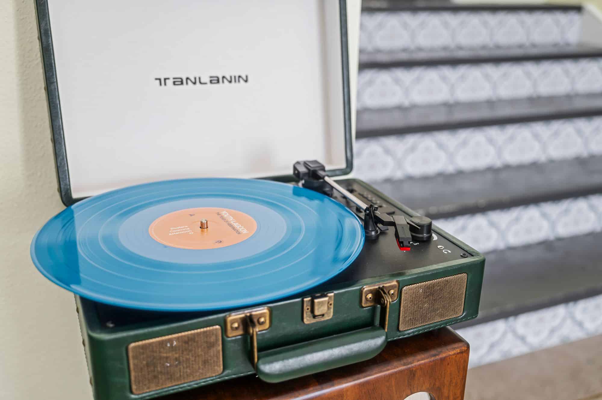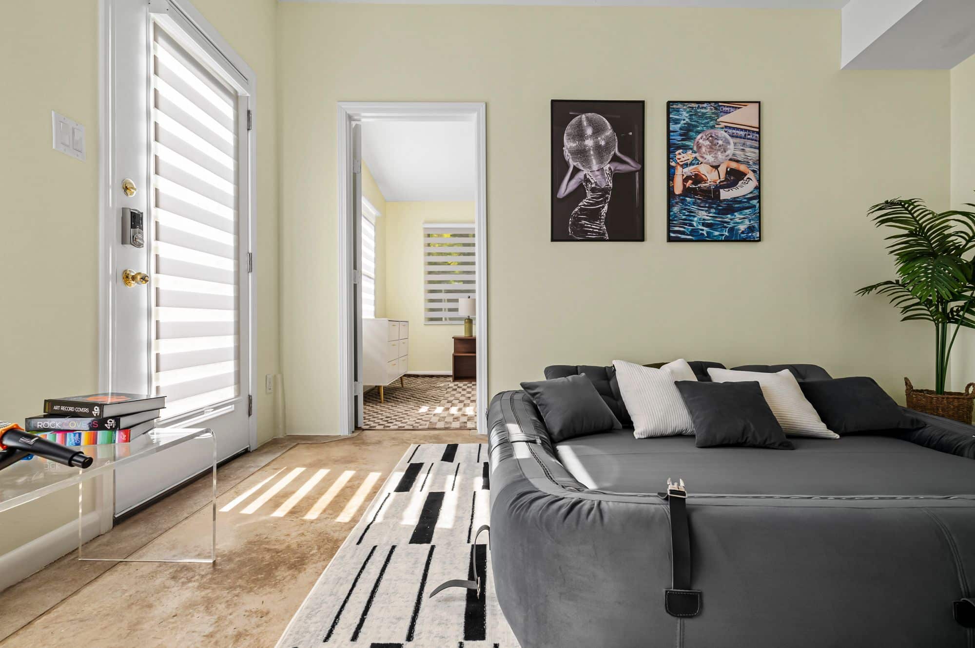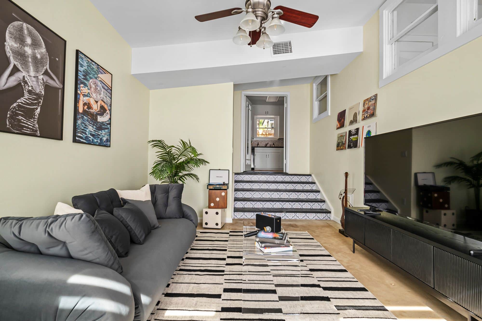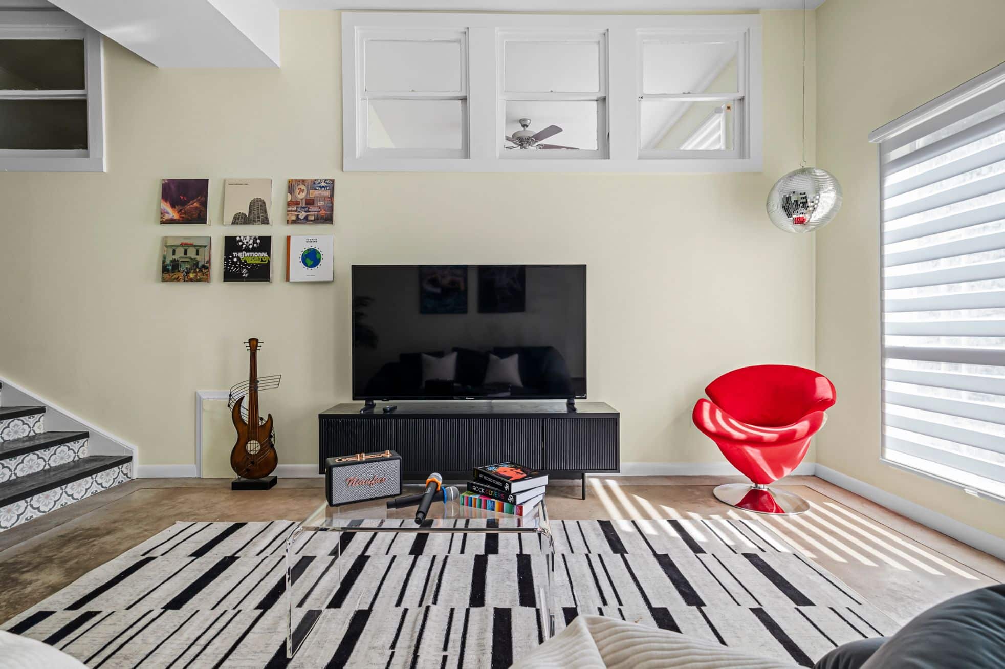 Take a couple of steps down and you’ll arrive at the home’s true centerpiece: the main living room. This is where the retro music theme shines. A 60s-inspired couch (which doubles as a queen-size sleeper) invites you to kick back while a record player spins vinyl nearby. With a karaoke machine (complete with 2 mics), a disco ball, and a bold red chair, this room is designed for fun and lively gatherings—whether you’re reliving old hits or creating new memories.