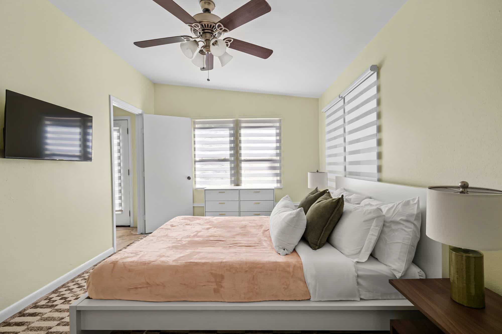 Tucked just off this space is the master bedroom, offering a queen bed, TV, and an ensuite bathroom for extra privacy and comfort.