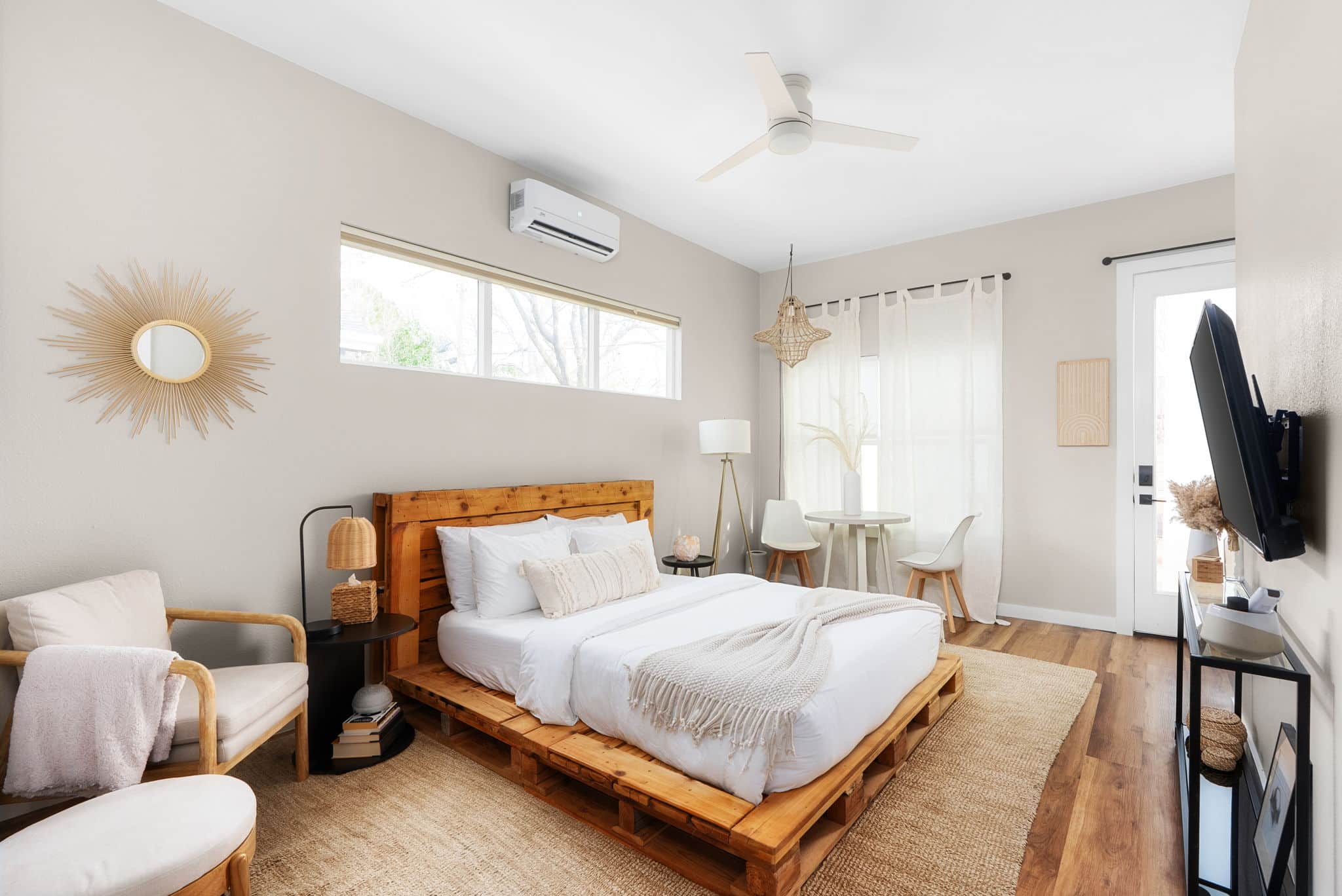This East Austin retreat was designed with the polish of a boutique hotel and the intimacy of a private residence. Inside, curated textures and thoughtful details create a calm backdrop, while the private indoor infrared sauna invites a ritual of restoration. Step outside and the atmosphere shifts – string-lit evenings in the hot tub, fireside conversations that linger past midnight, and open-air dining that turns every meal into an occasion.