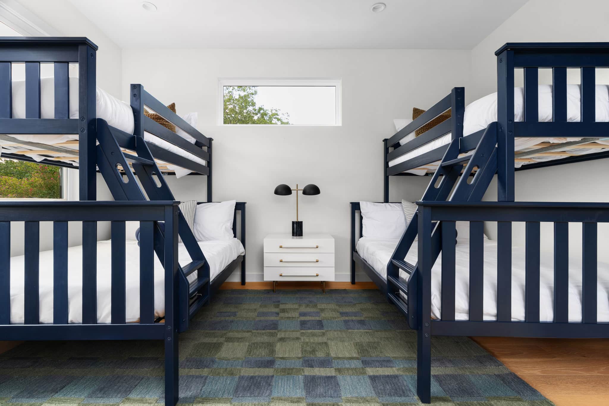 Outside, a separate loft space offers even more room. Walk up the private stairs and you’ll find a bedroom with two twin-over-full bunk beds, a full bathroom, and a small coffee station. Glass doors lead to a private outdoor patio with a fire pit and lounge seating.