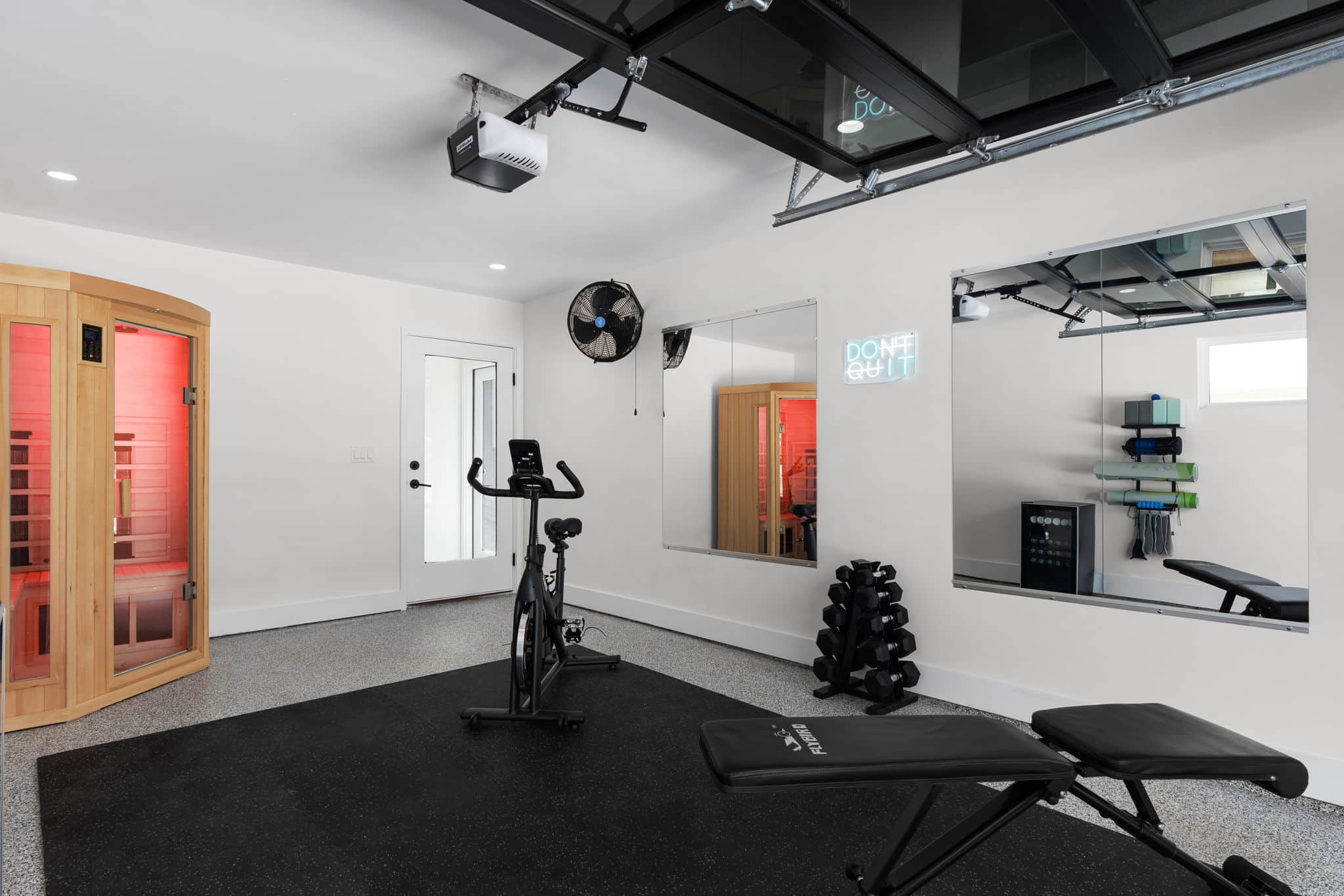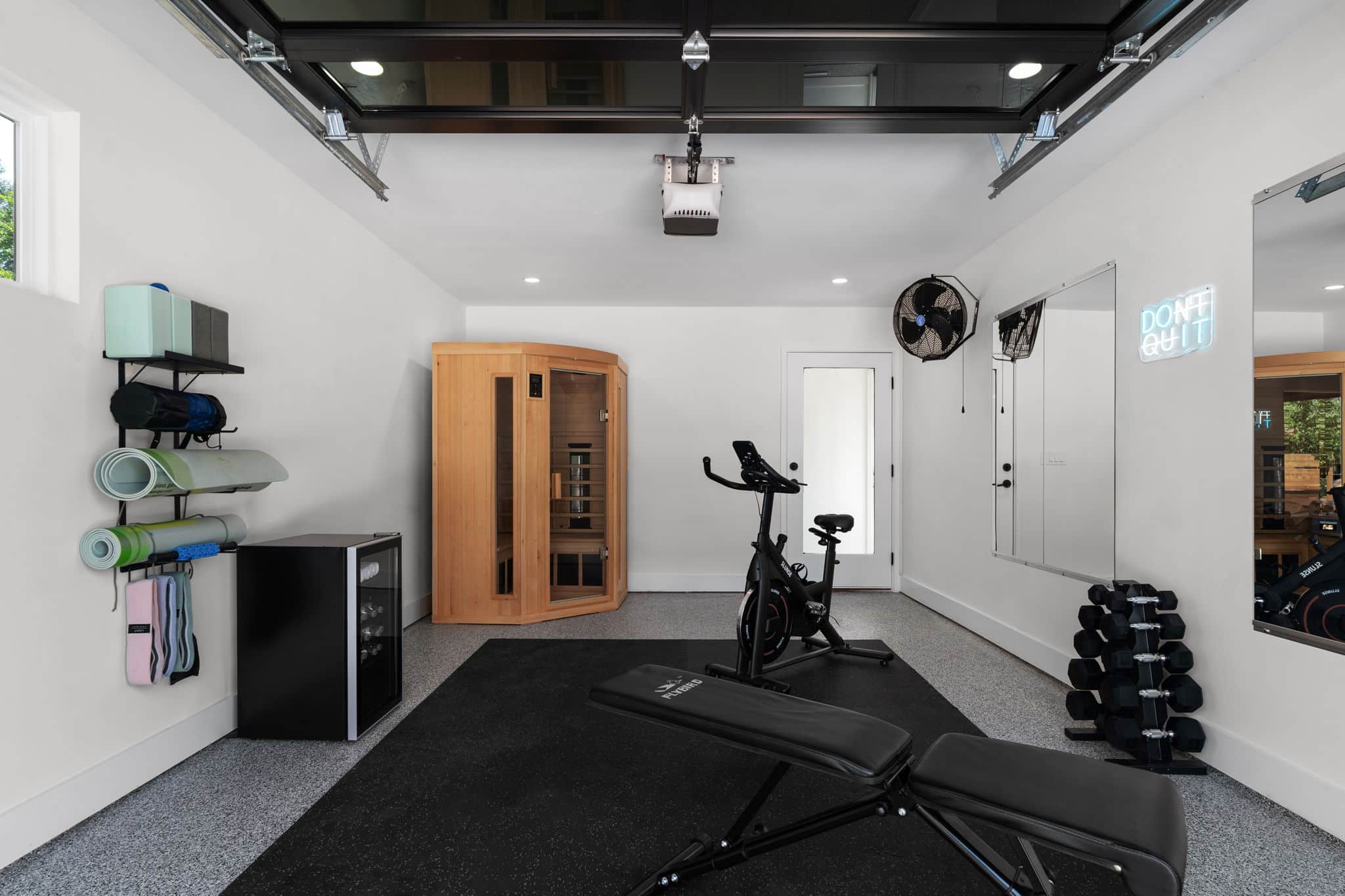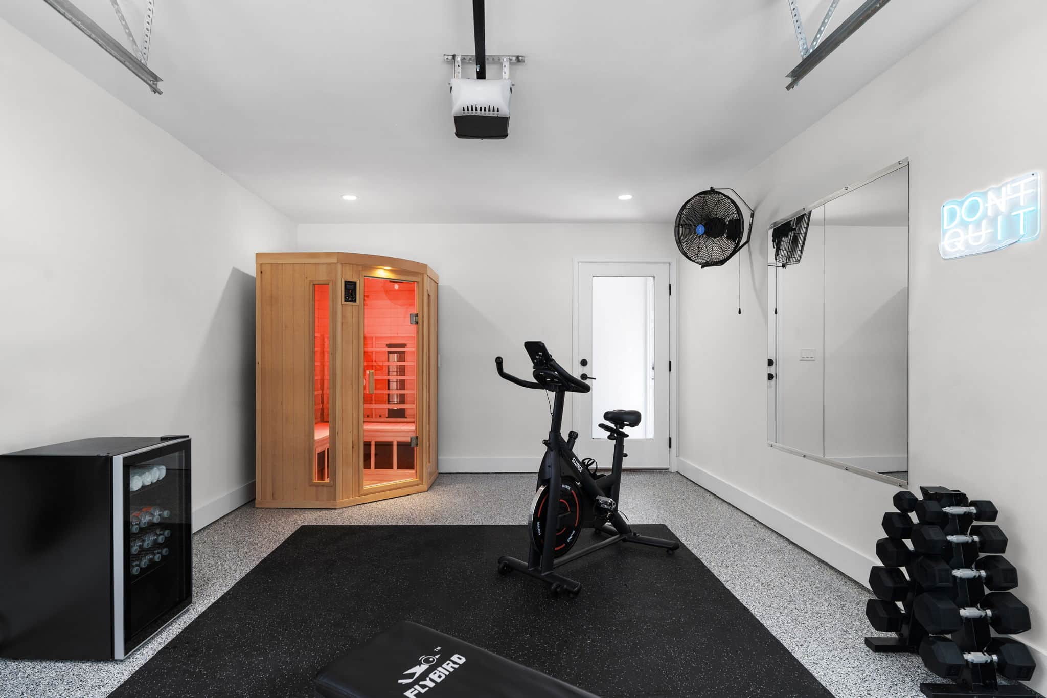 Below the loft is a fully equipped gym with everything you need to stay active: free weights, a stationary bike, yoga gear, mirrors, a bench, and even a fridge stocked with chilled towels. There’s also a sauna for when it’s time to relax and recover.