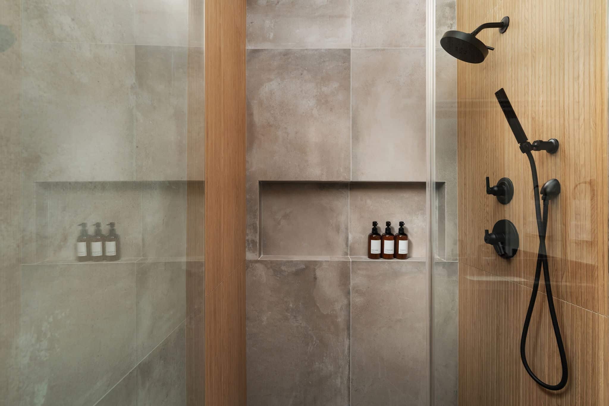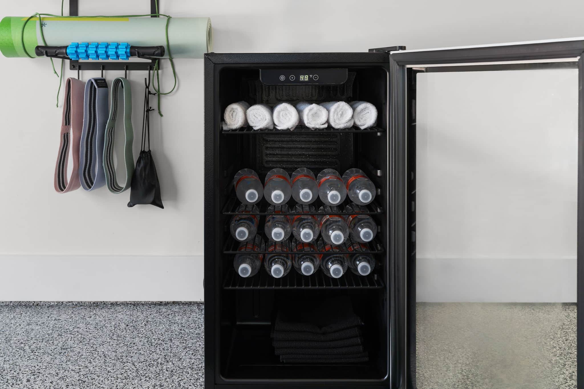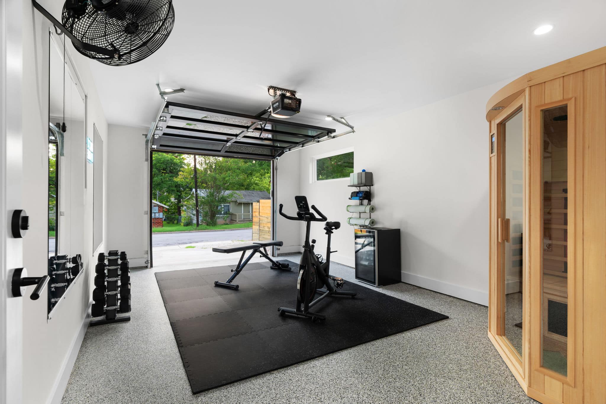 Below the loft is a fully equipped gym with everything you need to stay active: free weights, a stationary bike, yoga gear, mirrors, a bench, and even a fridge stocked with chilled towels. There’s also a sauna for when it’s time to relax and recover.