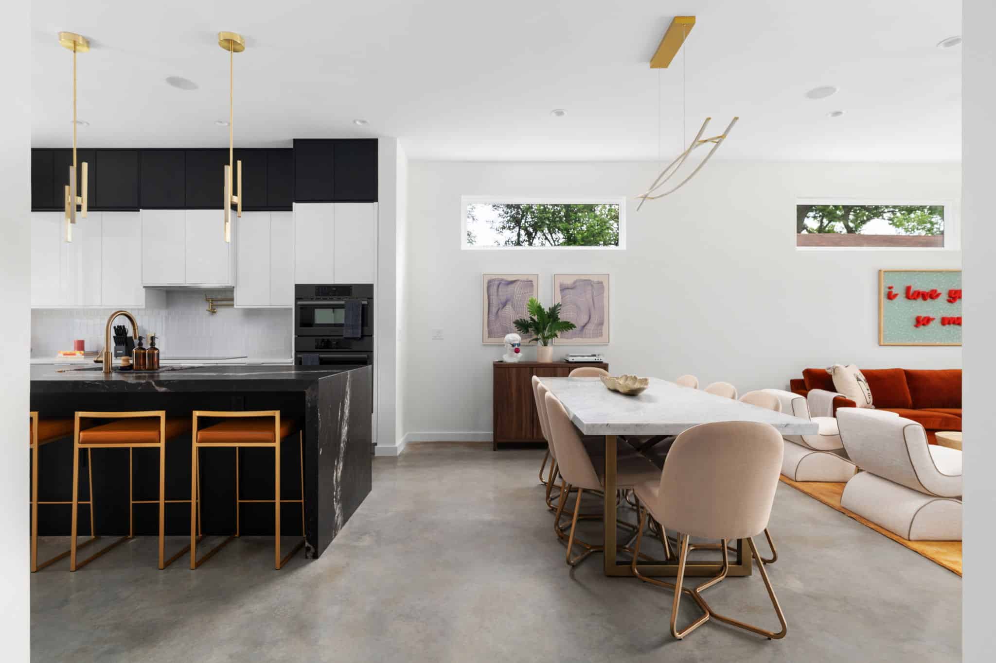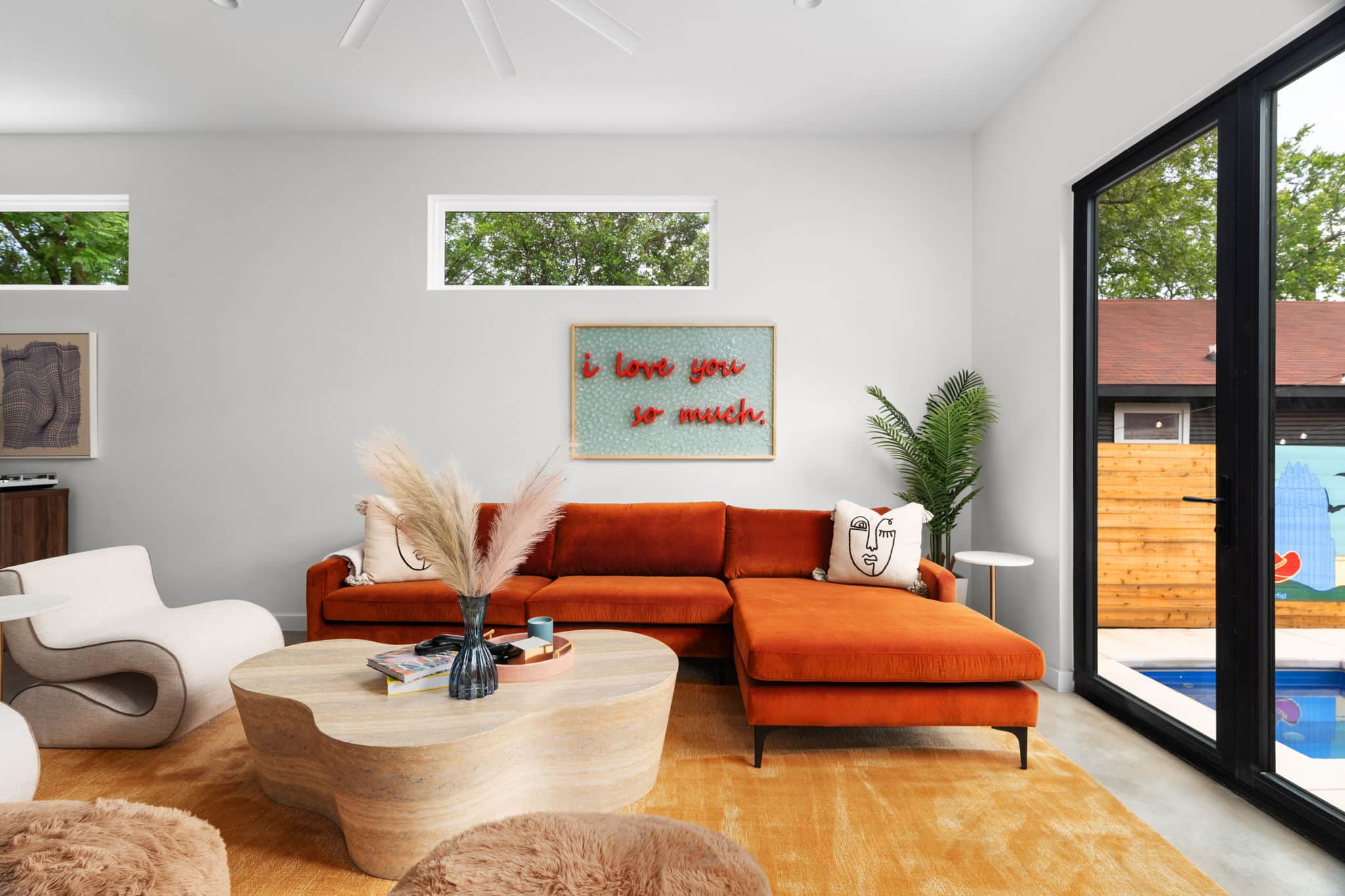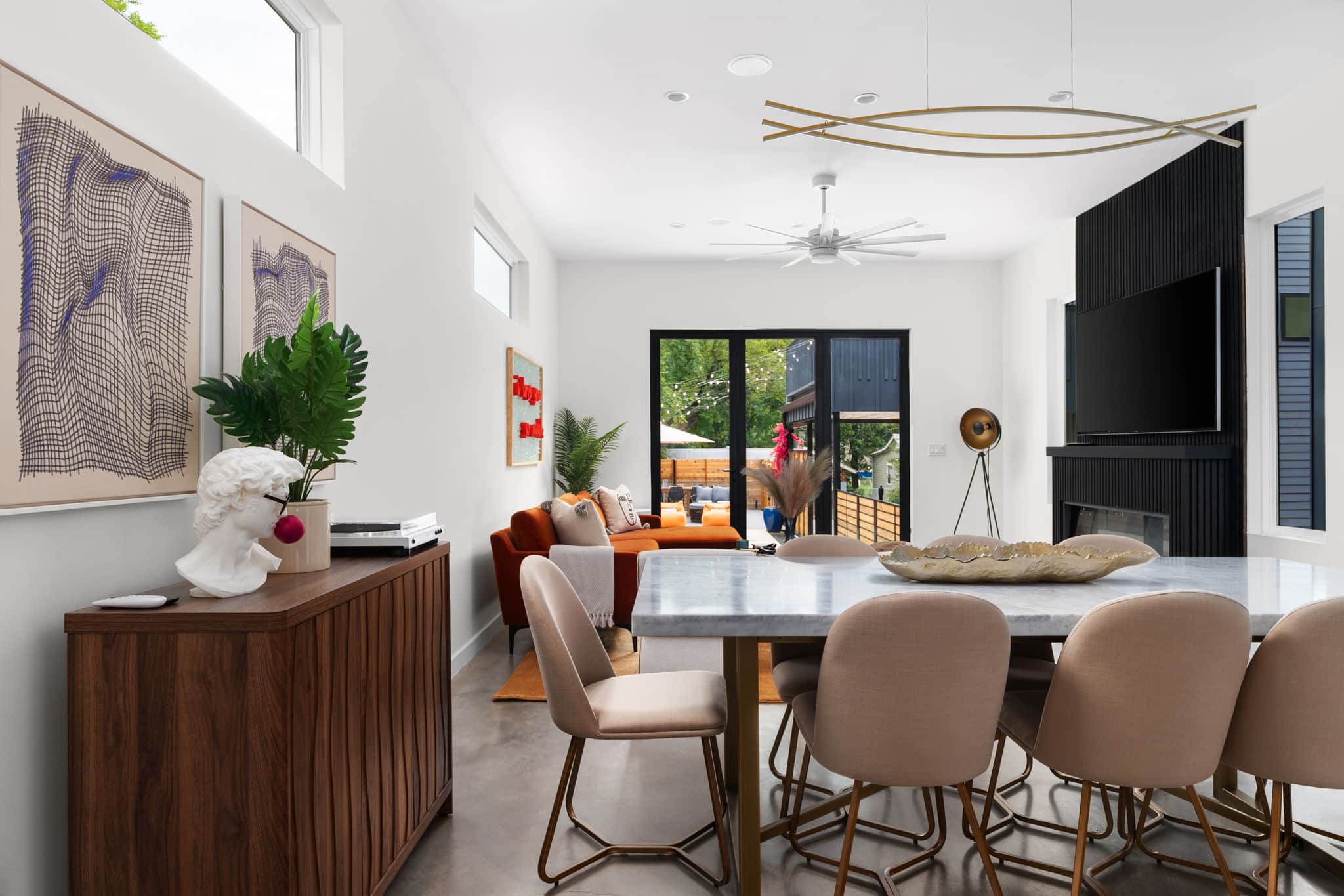 The ArtHaus is a spacious and thoughtfully designed home made for groups who want to enjoy Austin in style. Inside the main house, the ground floor opens into an open-concept kitchen, dining, and living space — with large glass doors that slide open to the pool area outside, making it easy to move between indoor comfort and outdoor hangouts.