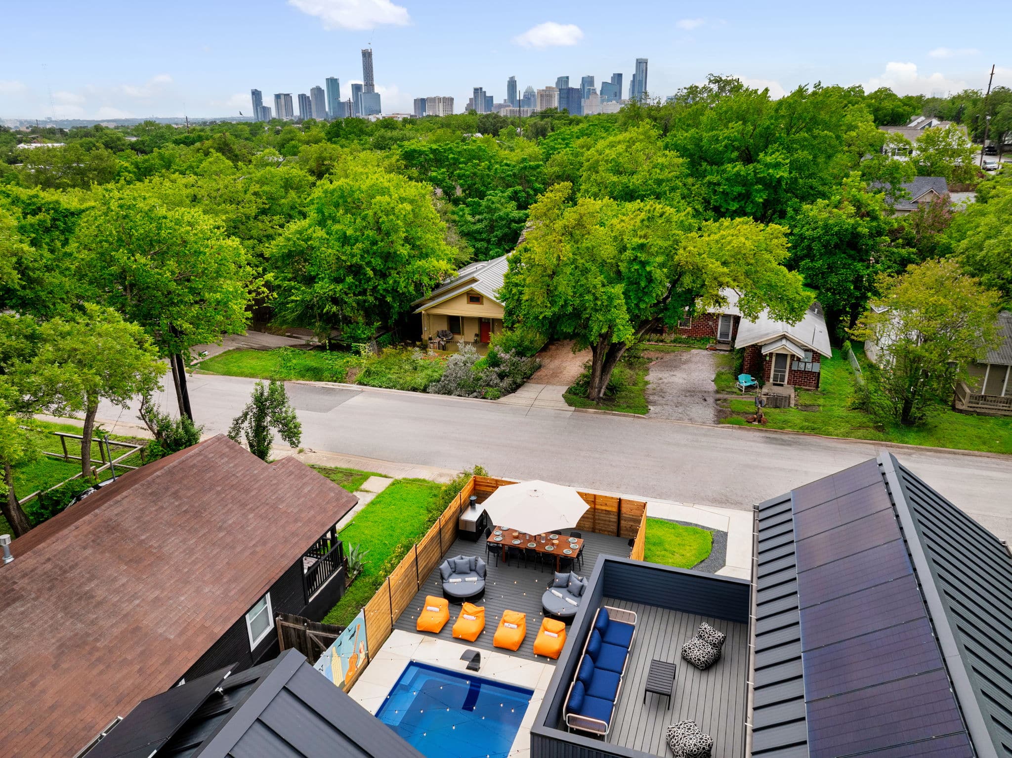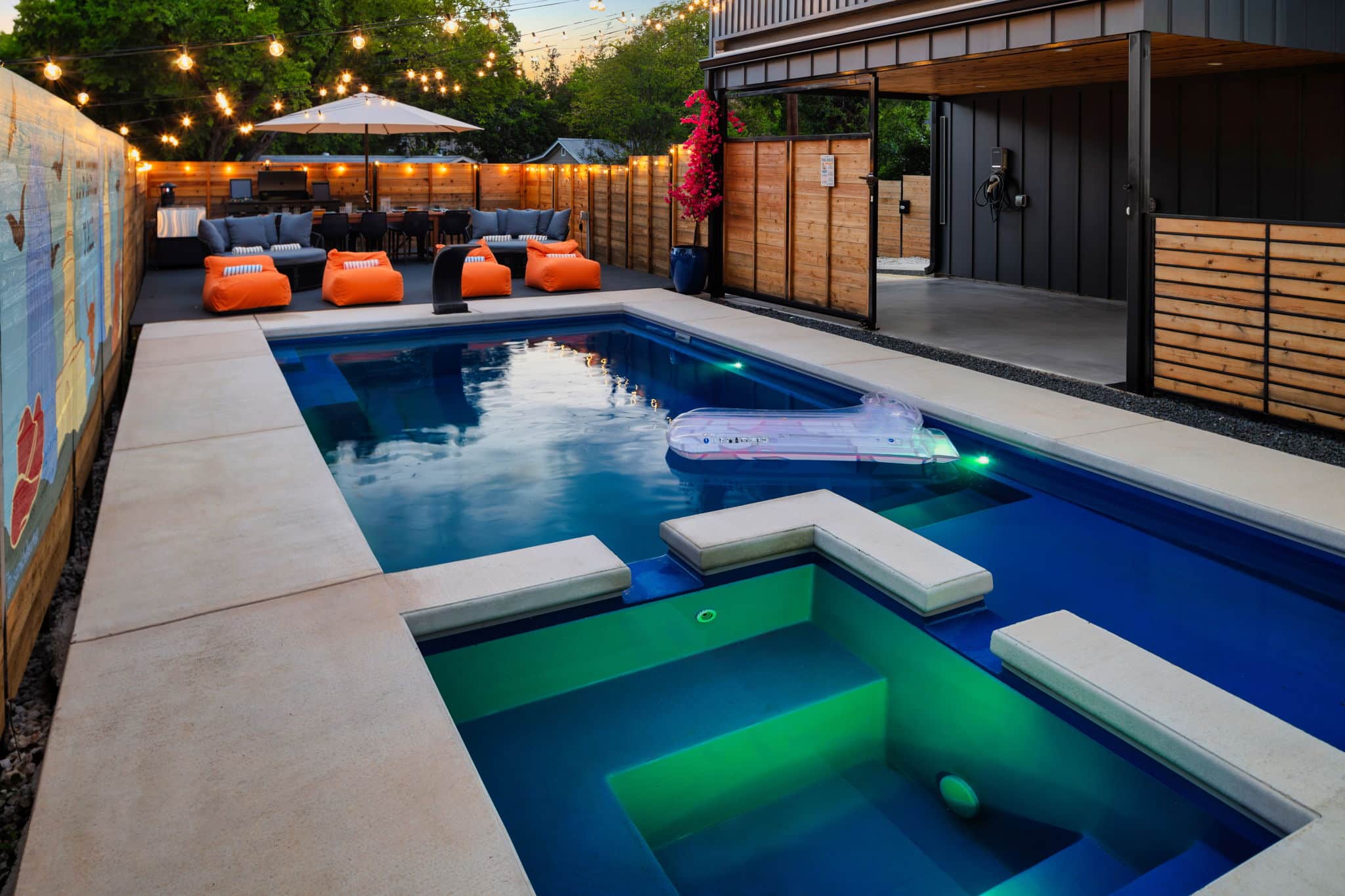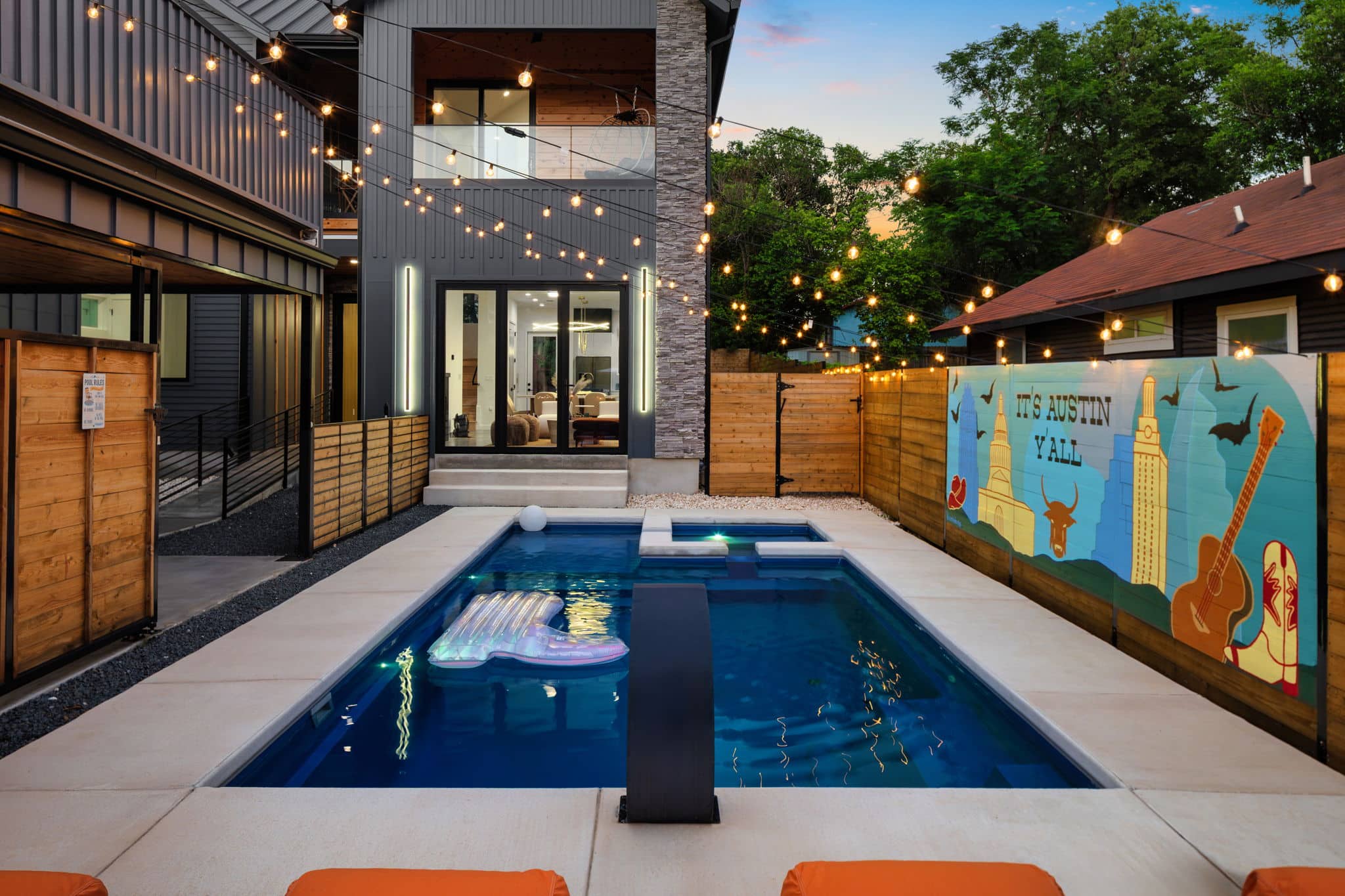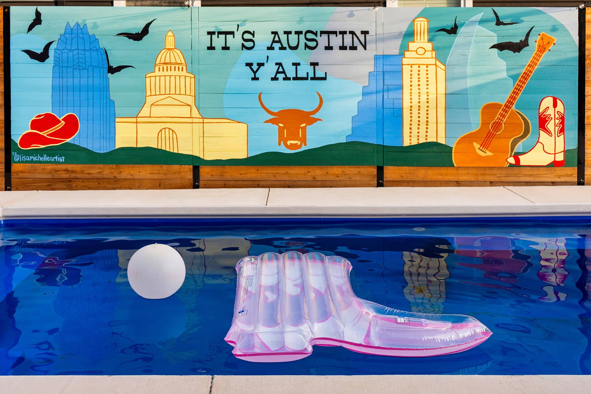 The exterior is the center of it all. A large heated pool and hot tub are surrounded by lounge chairs, daybeds, and a colorful mural that adds a splash of Austin energy. There’s also a huge outdoor dining table, a grill with prep space, and a built-in cooler — perfect for long afternoons and dinners under the stars.