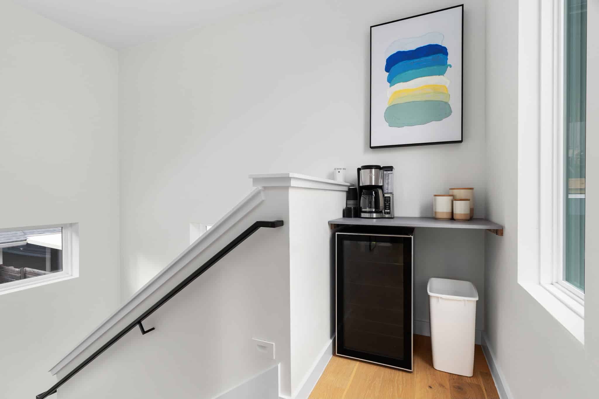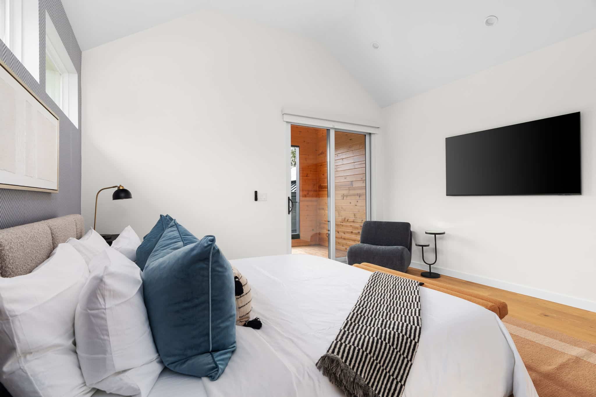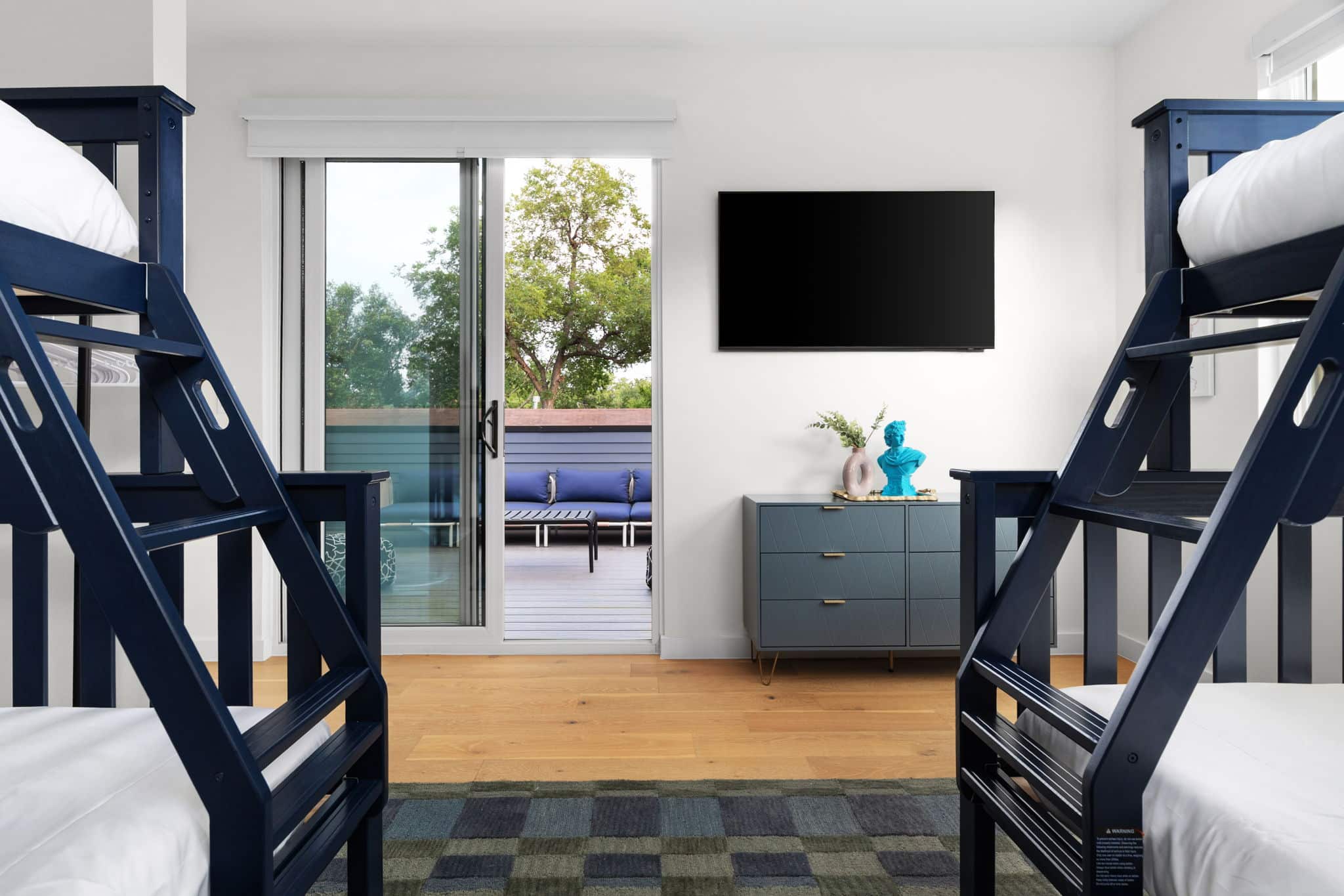Outside, a separate loft space offers even more room. Walk up the private stairs and you’ll find a bedroom with two twin-over-full bunk beds, a full bathroom, and a small coffee station. Glass doors lead to a private outdoor patio with a fire pit and lounge seating.