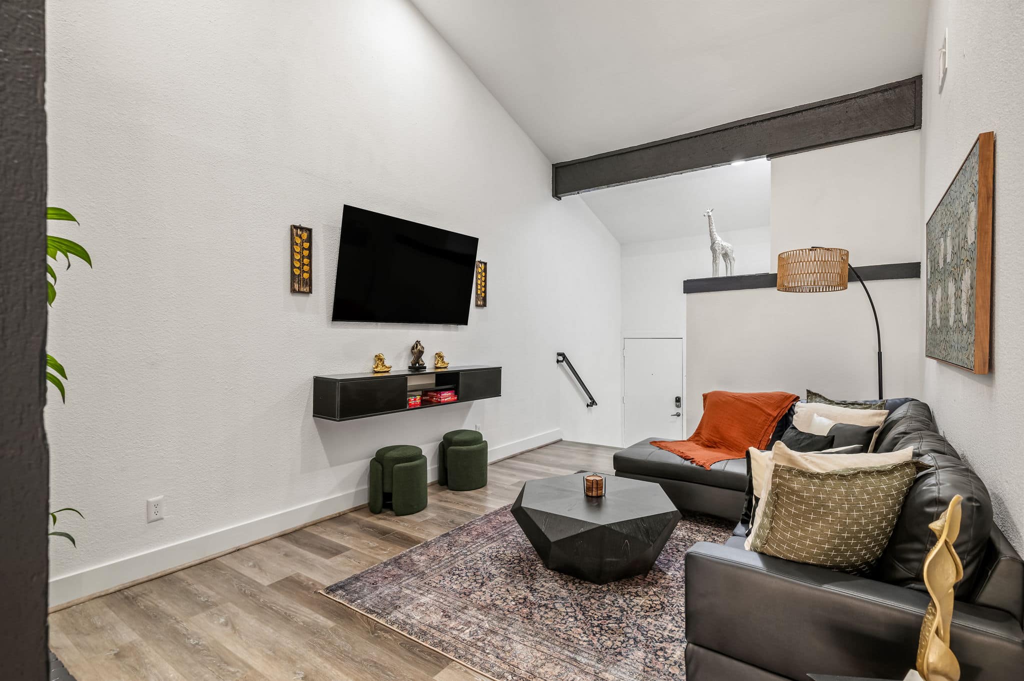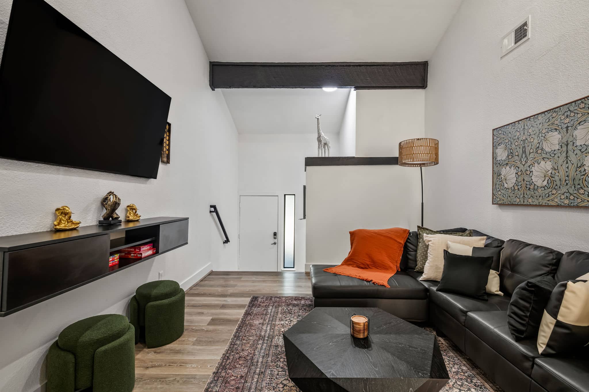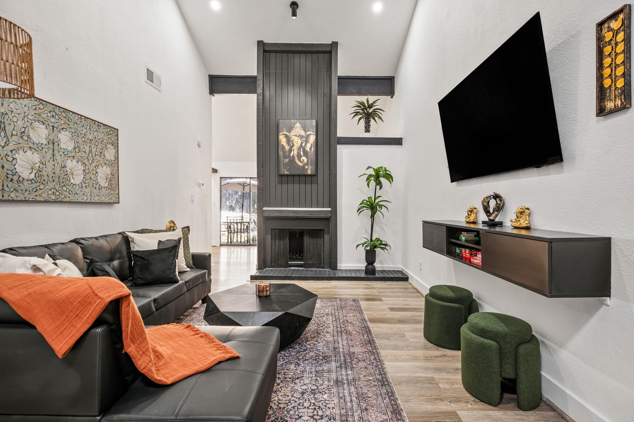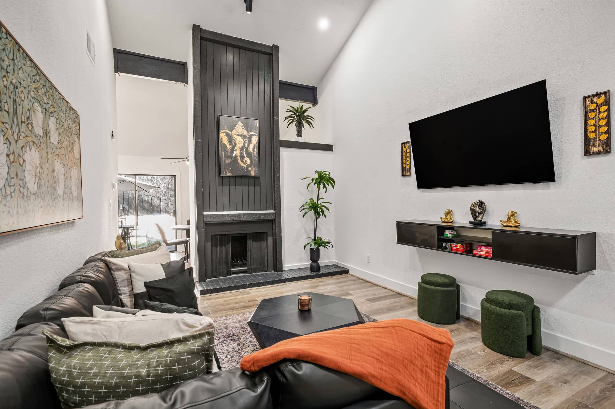 Step through the orange door and into a bright, modern space with soaring vaulted ceilings and an open-concept layout that makes the home feel larger than expected. The living area flows seamlessly into the dining space and fully equipped kitchen, creating an easy place to cook, gather, or relax after a day exploring Austin.