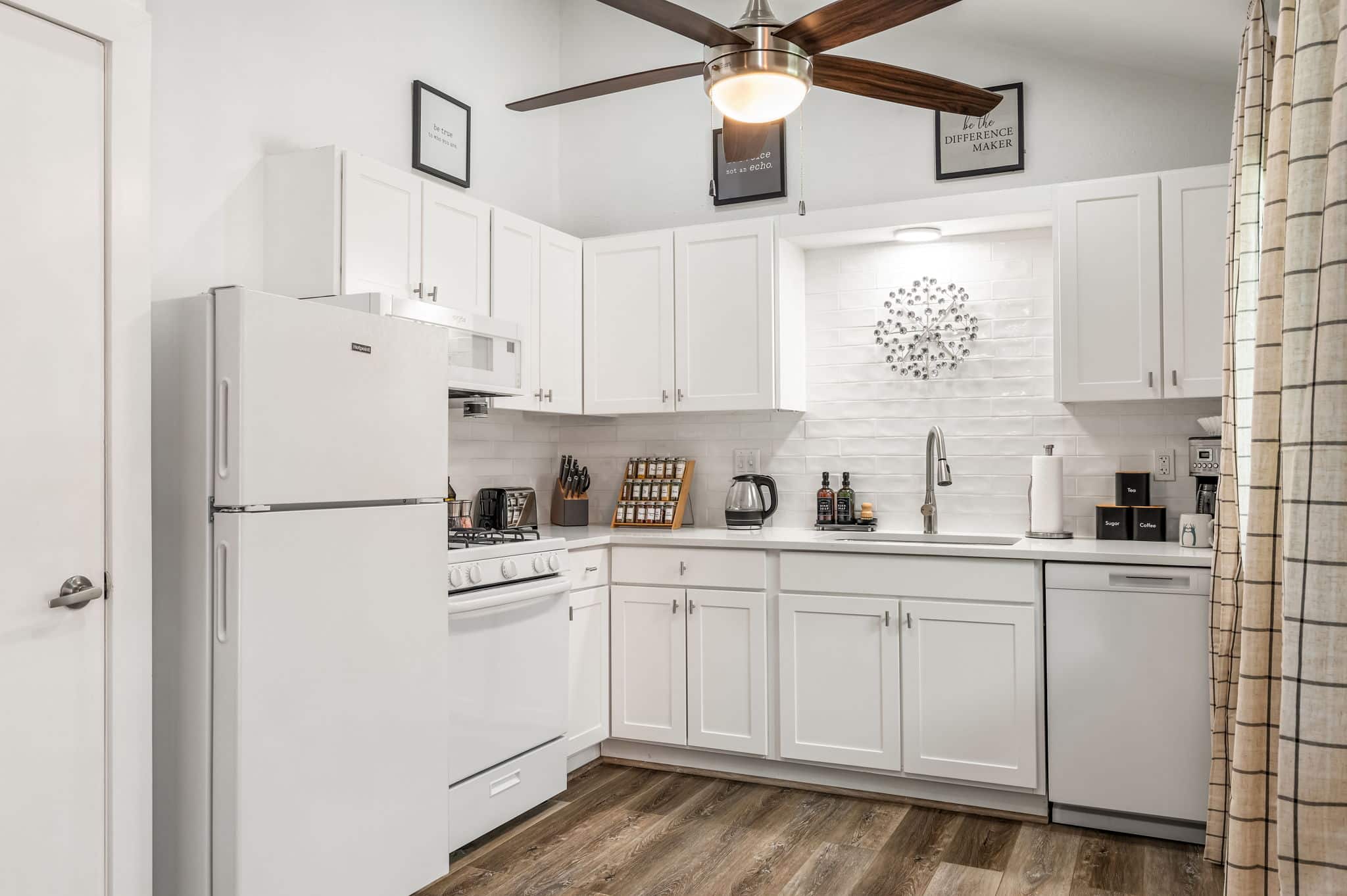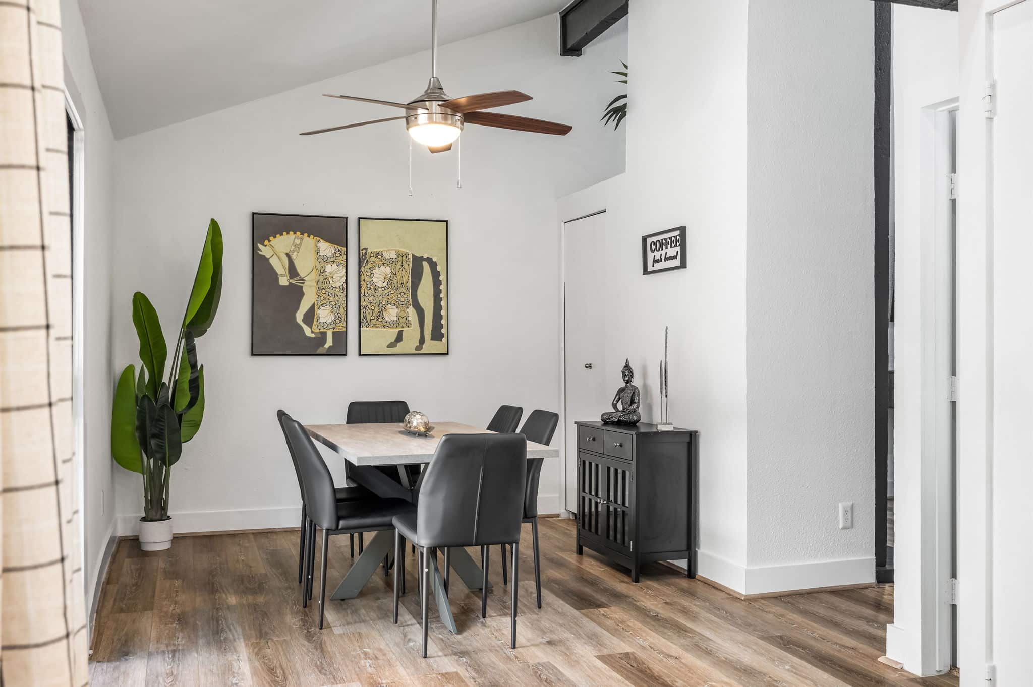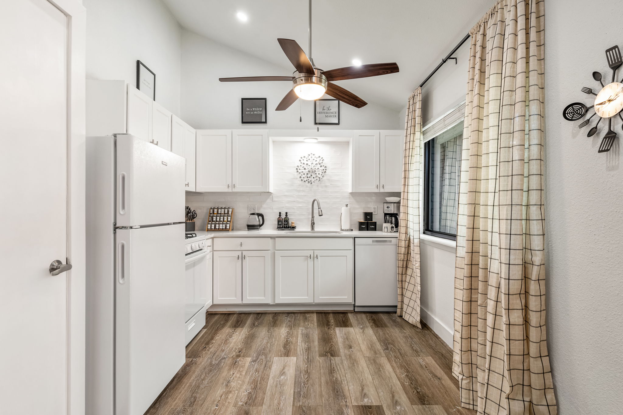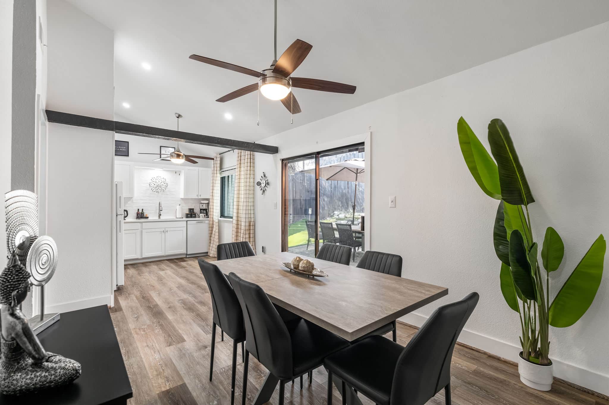 Step through the orange door and into a bright, modern space with soaring vaulted ceilings and an open-concept layout that makes the home feel larger than expected. The living area flows seamlessly into the dining space and fully equipped kitchen, creating an easy place to cook, gather, or relax after a day exploring Austin.