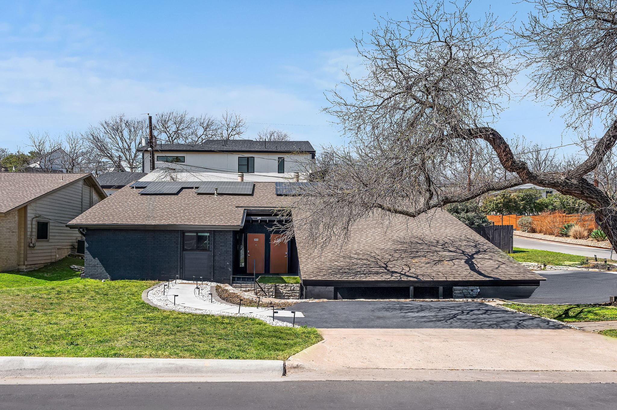 Tucked behind the Orange Door is a full Travis Heights duplex designed for gathering. Two stylish homes under one roof give your group room to spread out – 2 living rooms, 2 kitchens, 6 bedrooms, 4 bathrooms and private outdoor spaces. The backyard features a heated & chilled plunge pool, perfect year-round. The property is also pet-friendly when rented together, so the whole crew can come along. Minutes from South Congress and downtown, it’s an easy Austin home base for groups.
