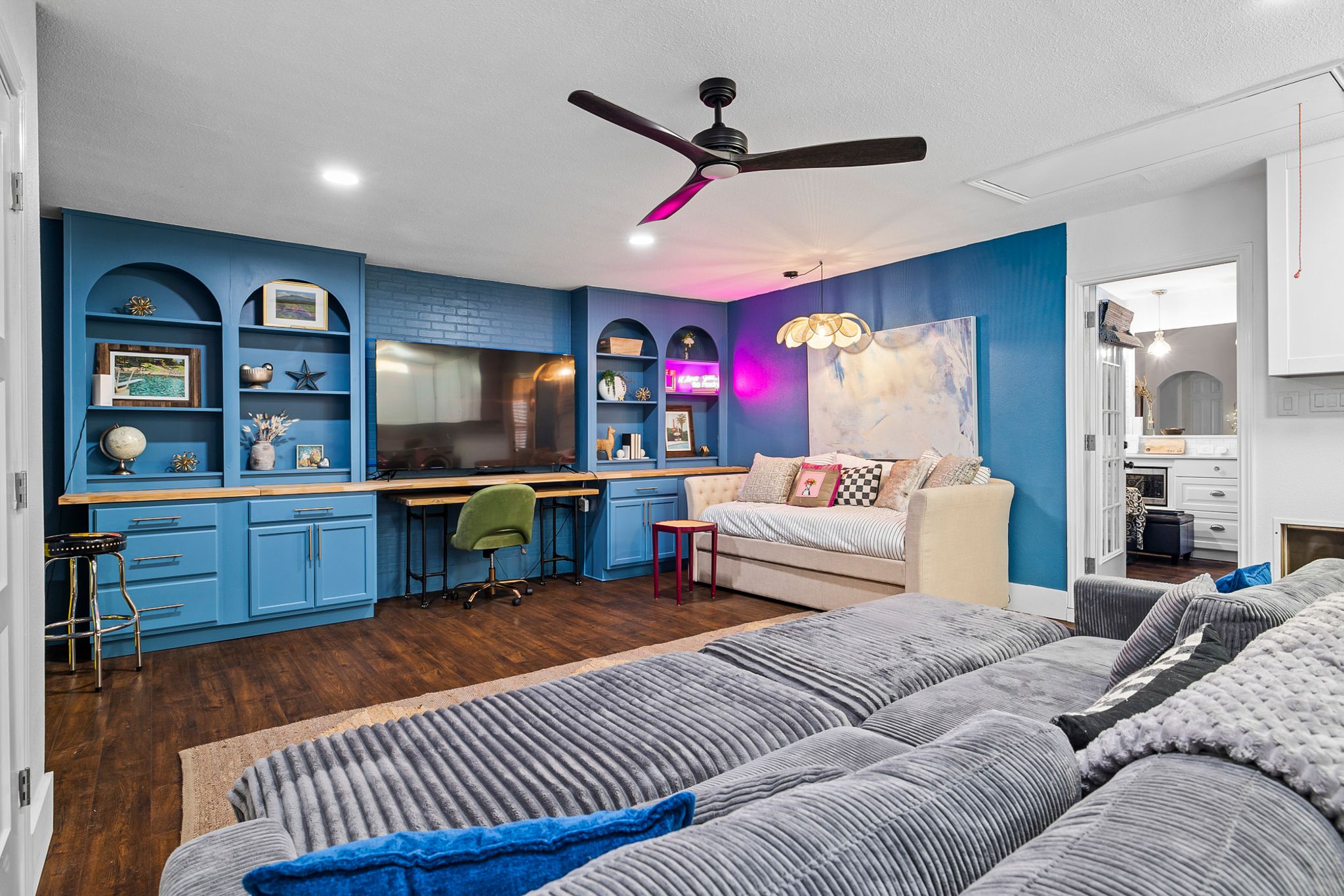 There are 3 beautifully appointed bedrooms, featuring plush king and queen beds, ensuring restful nights for all guests, as well as 2 bathrooms. The unique “blue room” serves as a versatile space, combining entertainment and functionality; it houses an old-school Pac-Man arcade, a large TV for movie nights, and a work desk for those needing to stay connected. The daybed and giant couch transform into additional sleeping spaces, accommodating everyone comfortably.