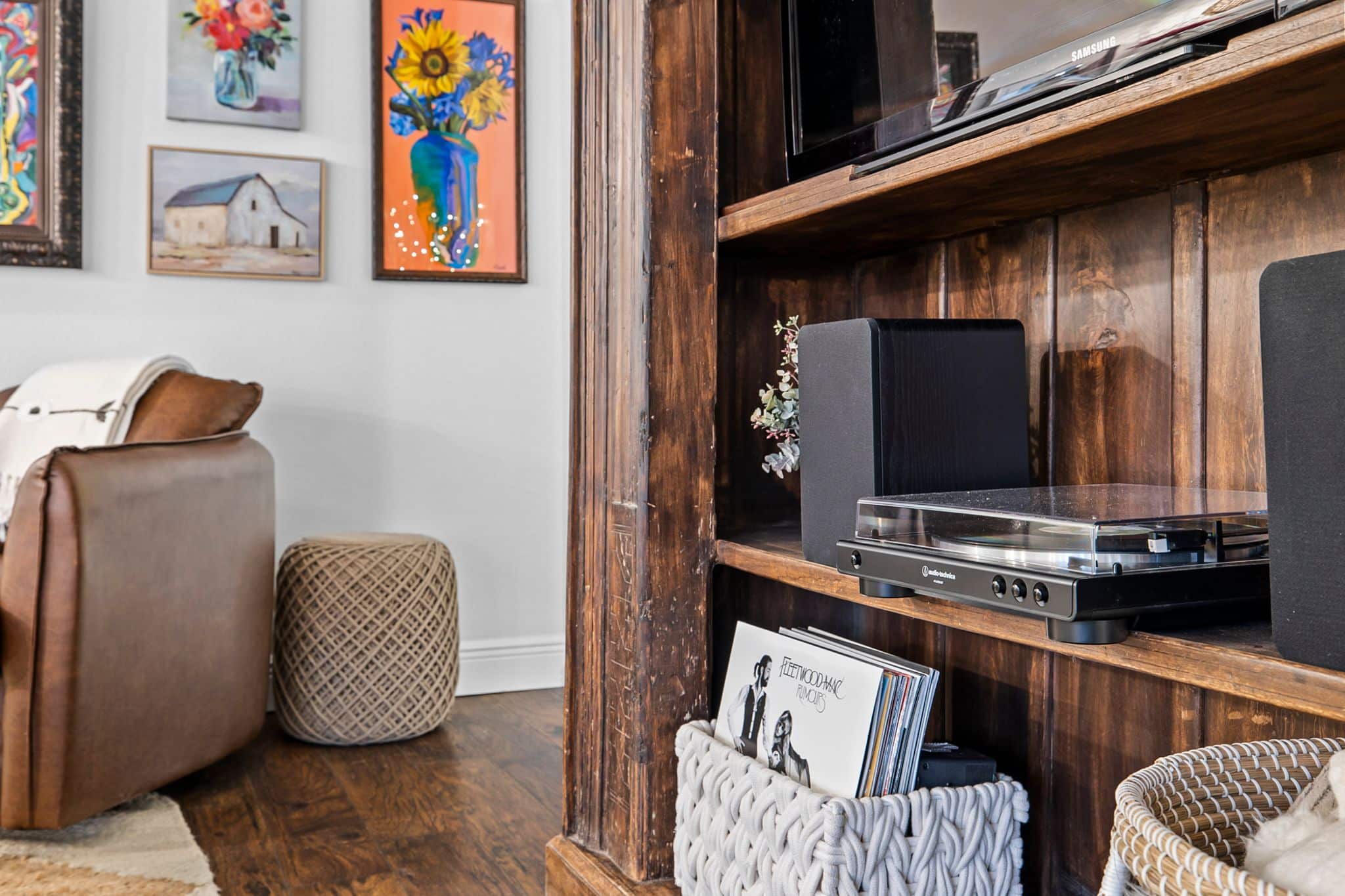 The heart of the home features a fully equipped kitchen, ready for culinary adventures, from morning coffee to gourmet dinners. Adjacent to the kitchen, the living room offers a cozy spot to unwind, equipped with a TV and a record player for music enthusiasts to enjoy their favorite vinyl sounds.