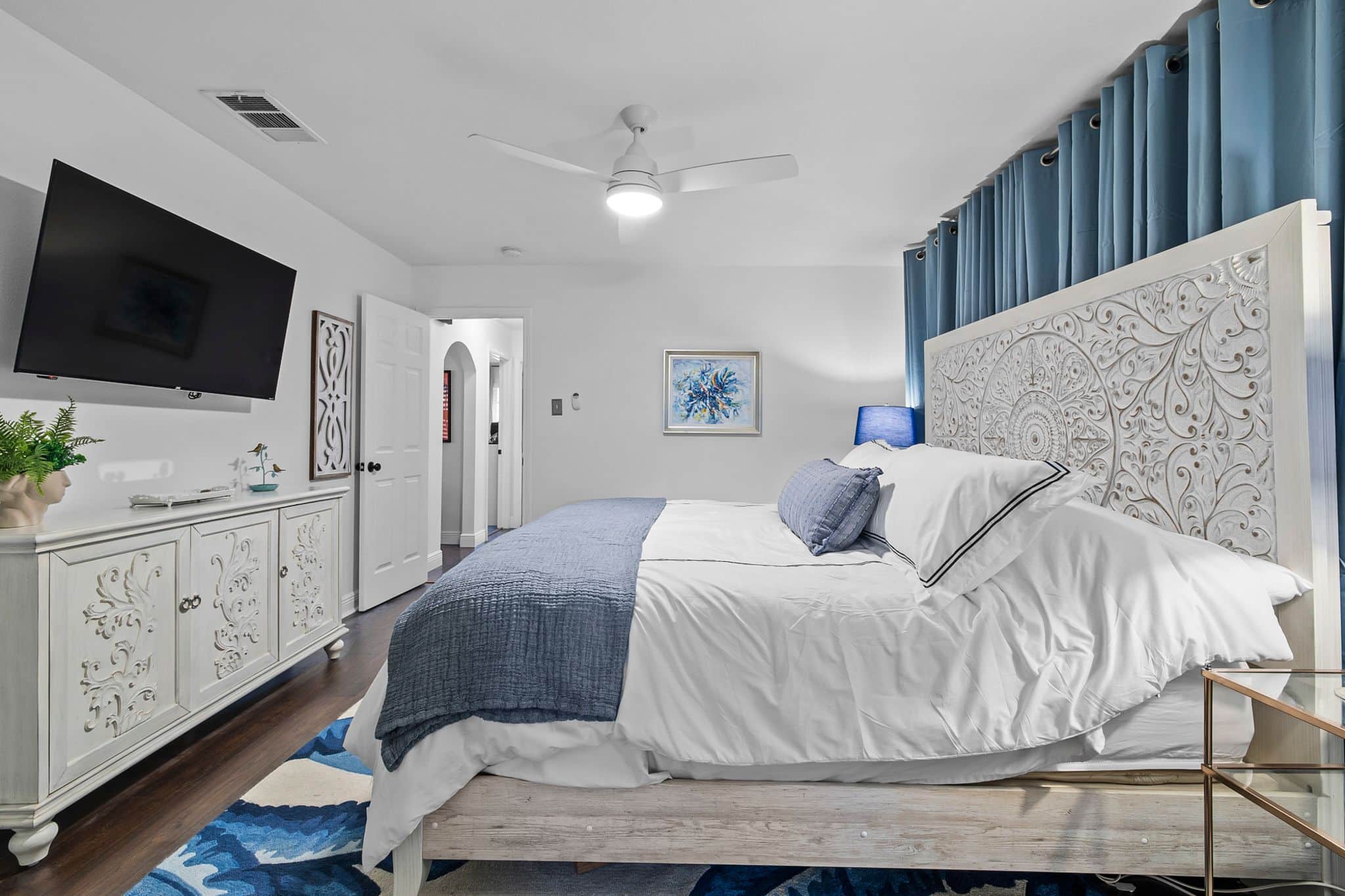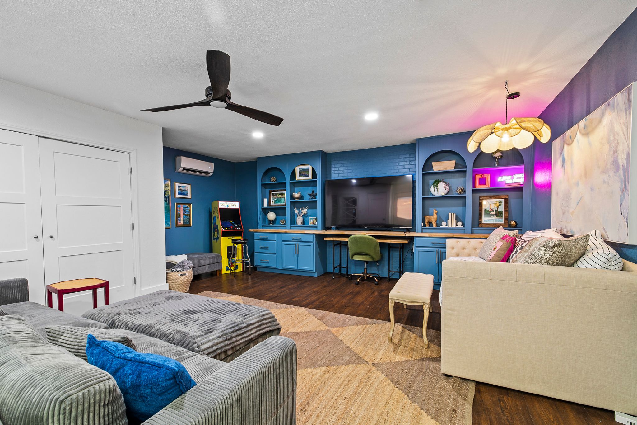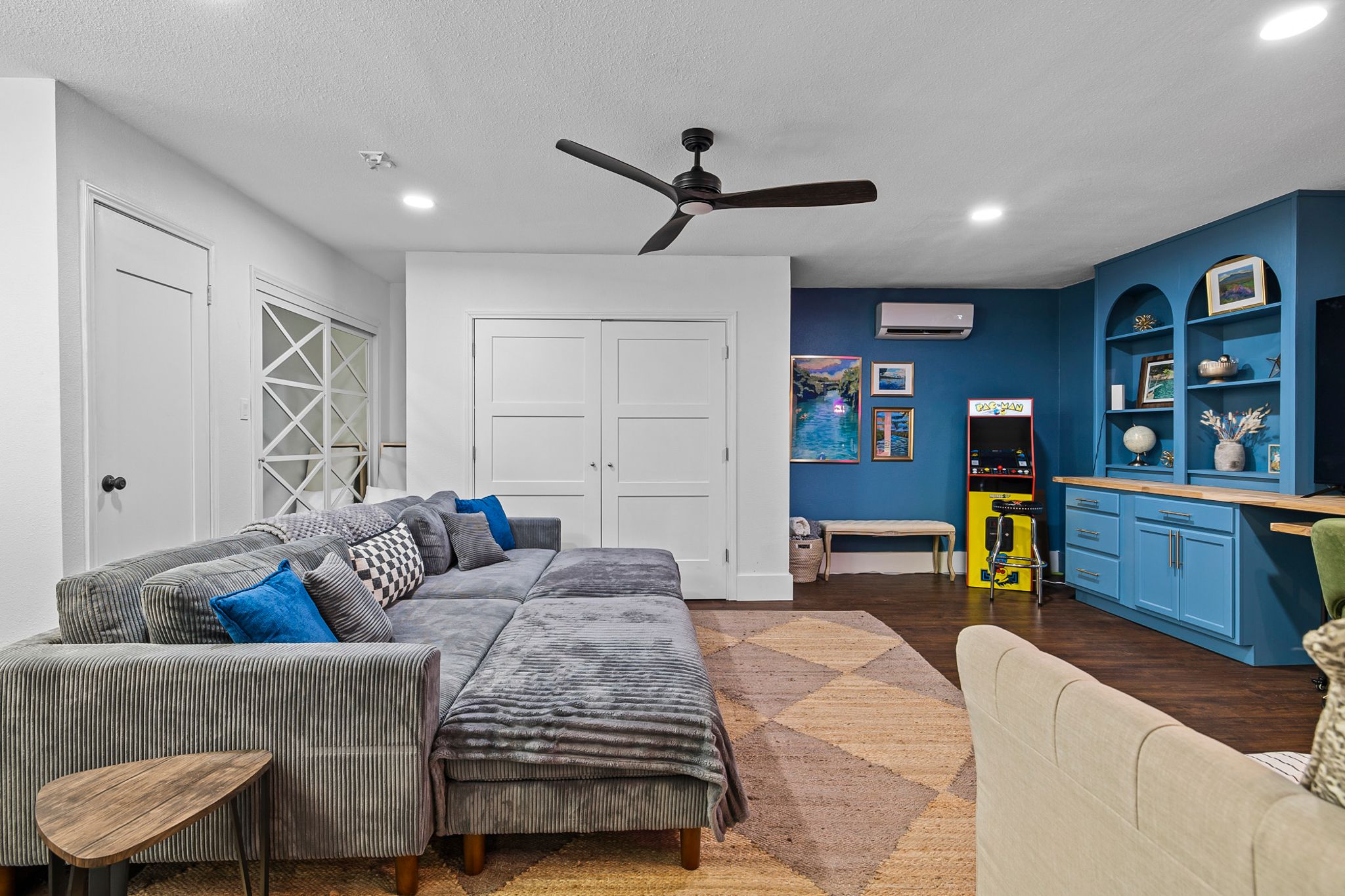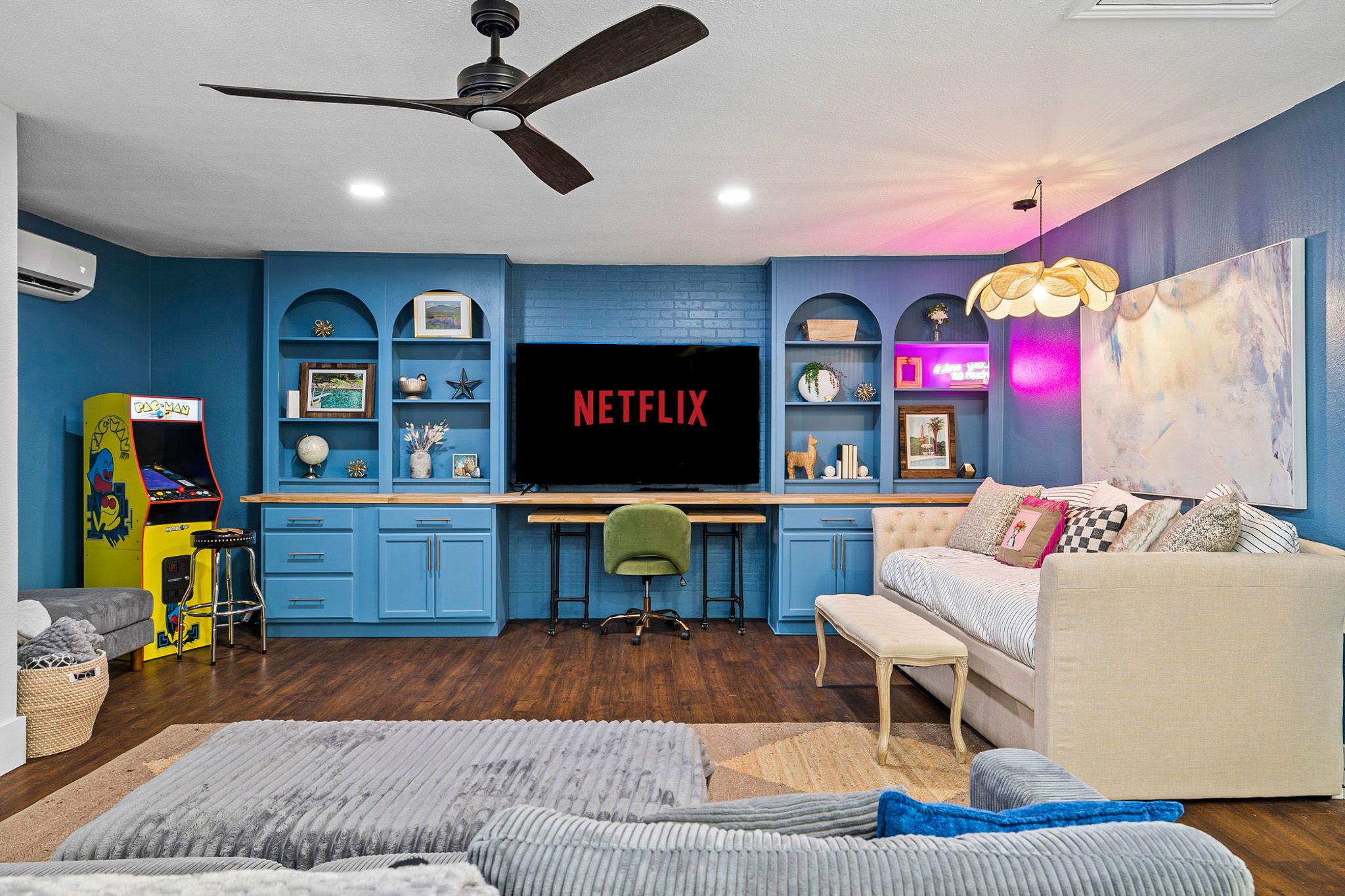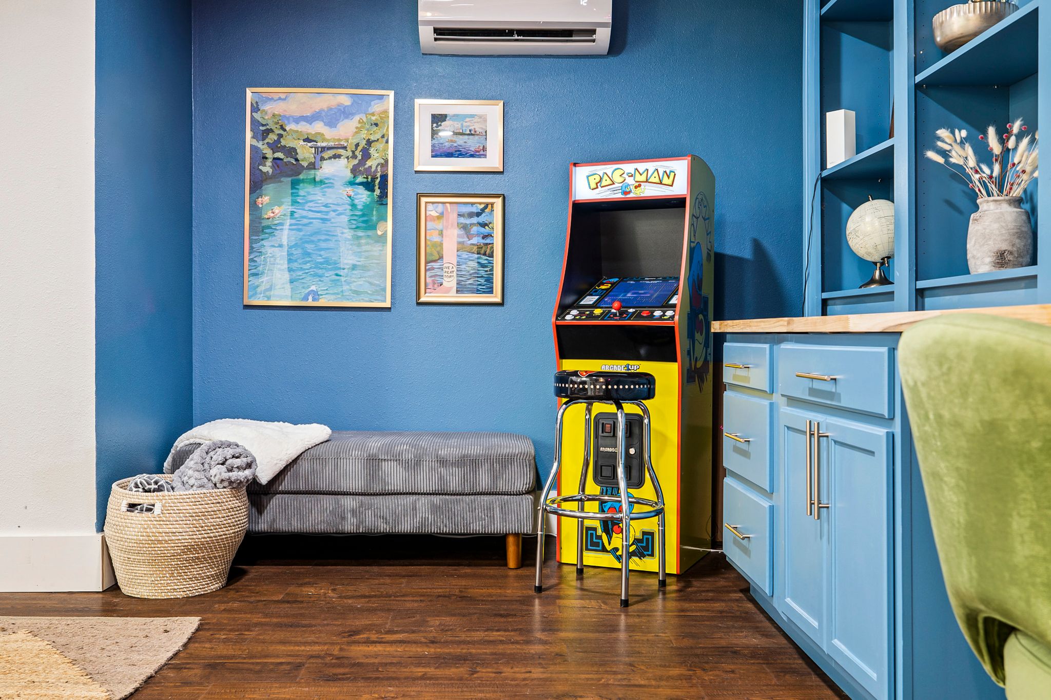 There are 3 beautifully appointed bedrooms, featuring plush king and queen beds, ensuring restful nights for all guests, as well as 2 bathrooms. The unique “blue room” serves as a versatile space, combining entertainment and functionality; it houses an old-school Pac-Man arcade, a large TV for movie nights, and a work desk for those needing to stay connected. The daybed and giant couch transform into additional sleeping spaces, accommodating everyone comfortably.