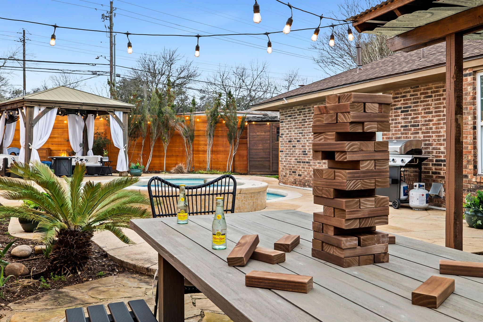 Step outside to discover an oasis designed for enjoyment and relaxation. The covered area offers a breezy retreat with seating and a TV, while the outdoor dining area invites al fresco meals beside the gas grill BBQ. The gazebo, with its lounging area and fire pit, becomes a focal point for evening gatherings under the stars. But the fun doesn’t stop there; the yard games area, featuring cornhole, a life-size Connect-4, and ring-toss, promises laughter and friendly competition in the sunshine.