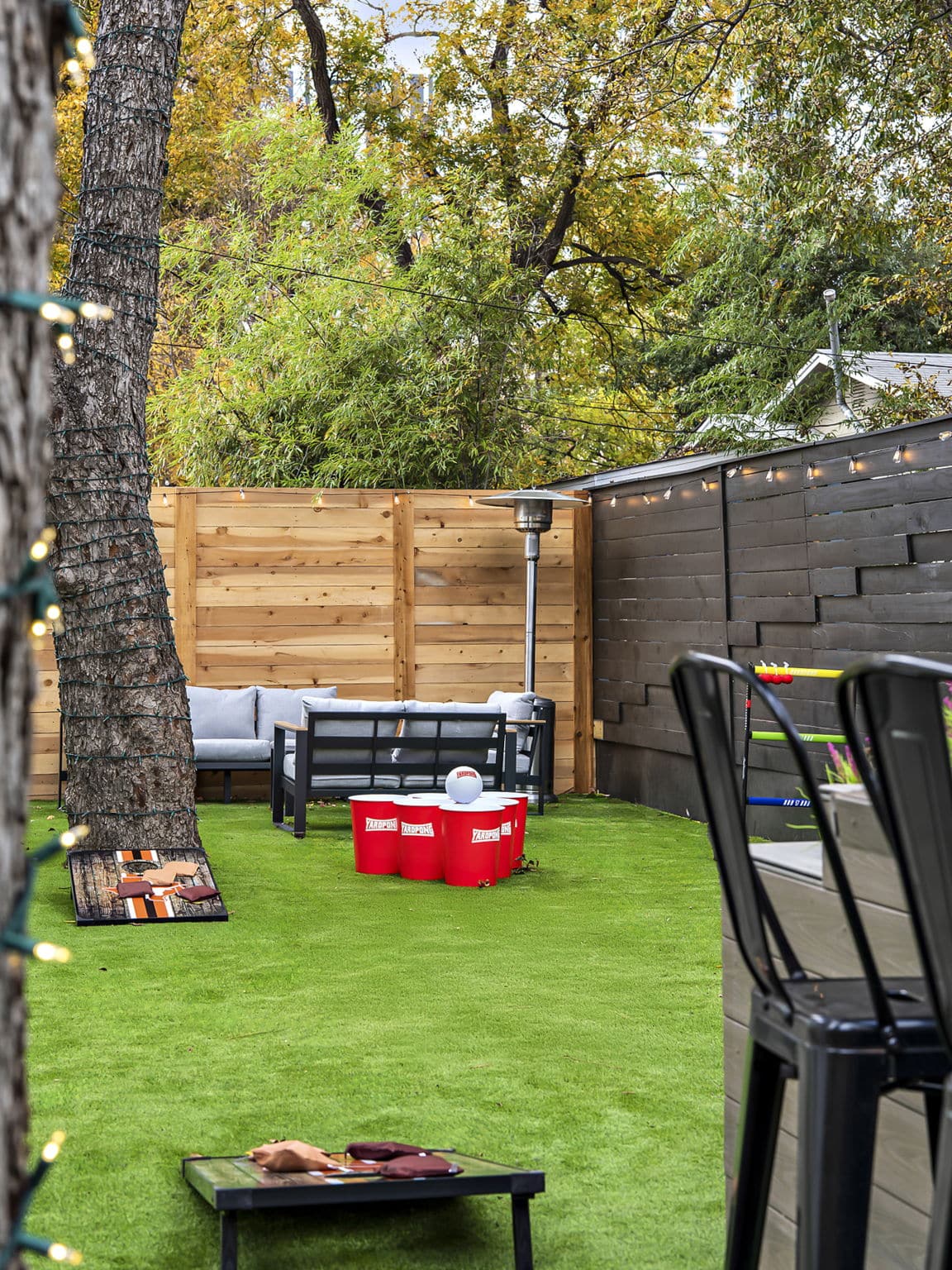 Outside, you’ll find a private backyard oasis with turf, a hot tub, a BBQ grill, and giant outdoor games that are fun for all ages. There’s plenty of seating to lounge and unwind, plus a patio heater for those cooler nights. As soon as you walk in, you’re greeted by the colorful “Welcome to Austin” mural—it’s a little misspelled, but hey, this is Austin, and we embrace the weird!